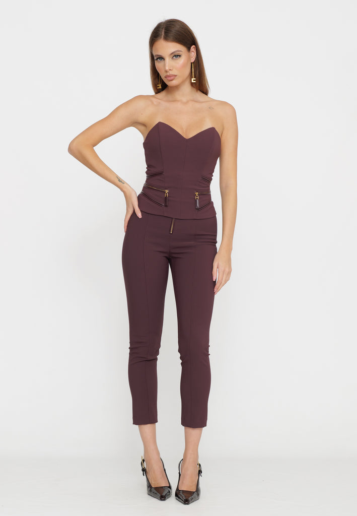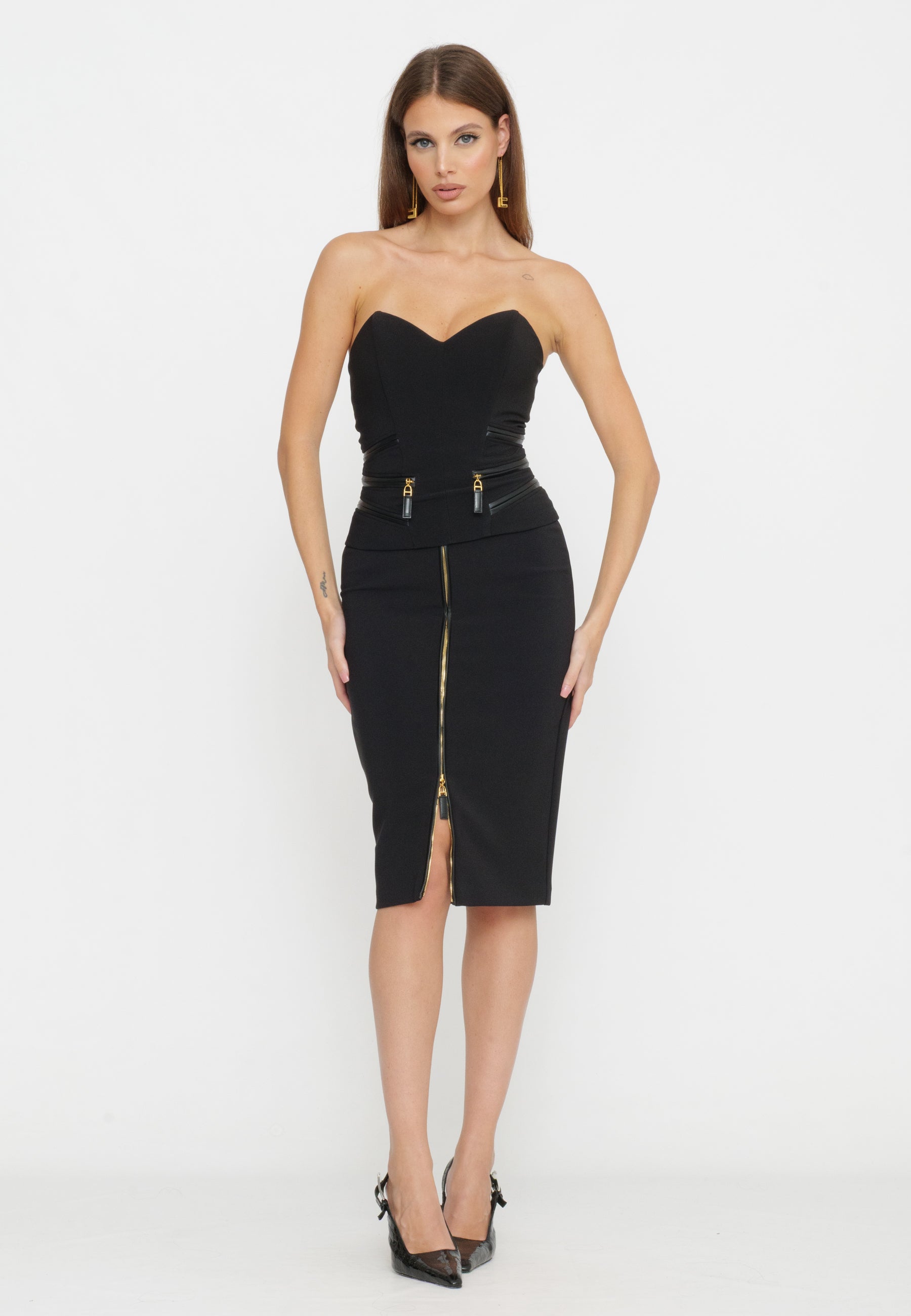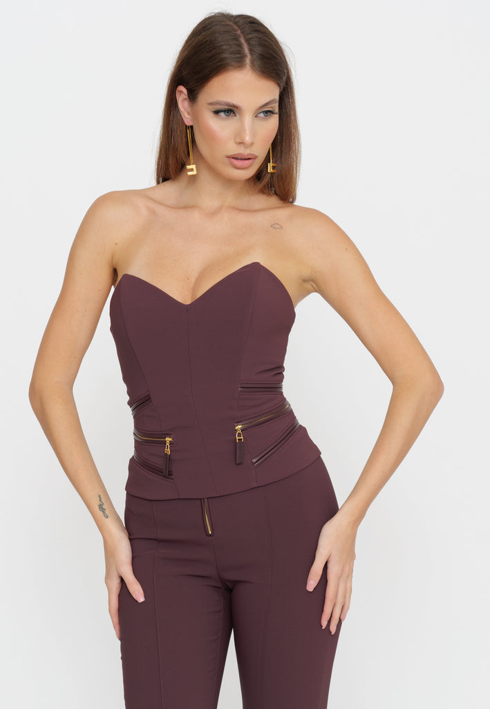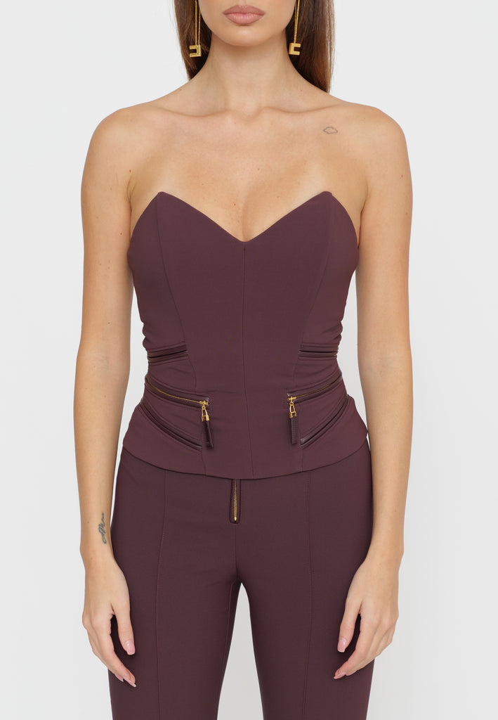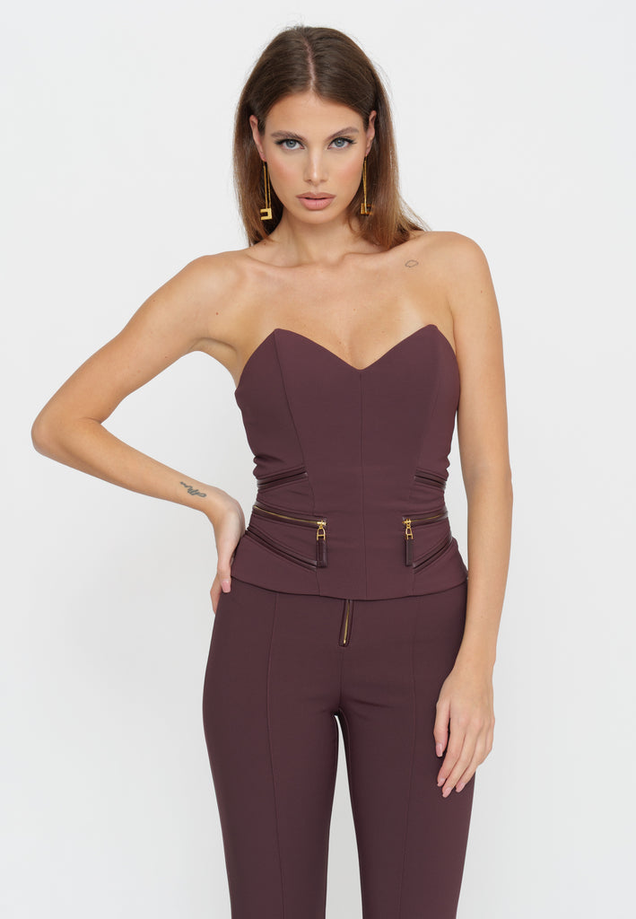 Top in crêpe con silhouette bustier che reinterpreta i codici della maison. La struttura è valorizzata da dettagli zip tono su tono e filetti che marcano le linee del capo, creando definizione e movimento. La chiusura zip posteriore assicura una vestibilità impeccabile e facilita l'indossamento. Un pezzo versatile che combina eleganza minimale e dettagli costruttivi sofisticati, perfetto per composizioni sia casual che più formali.