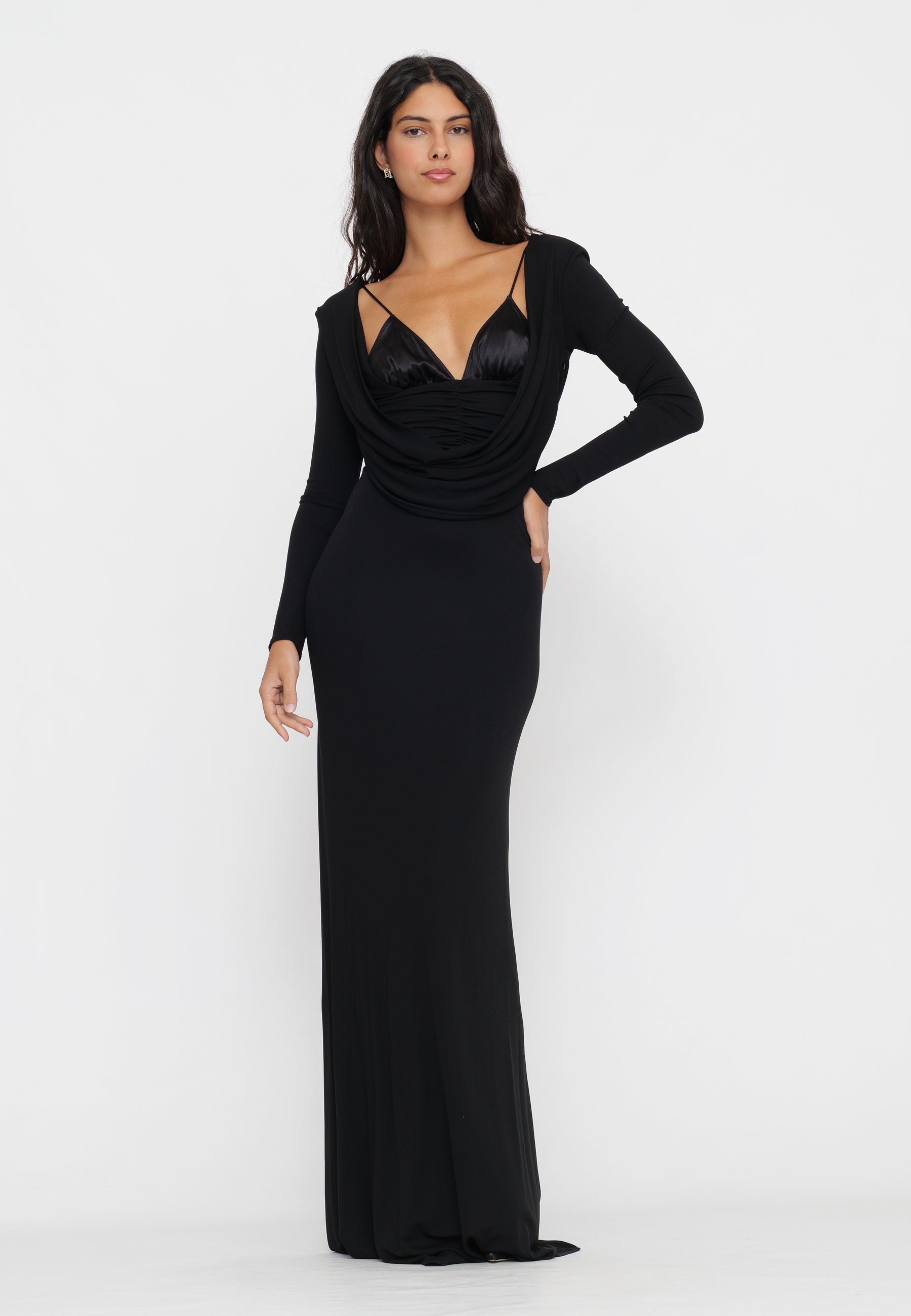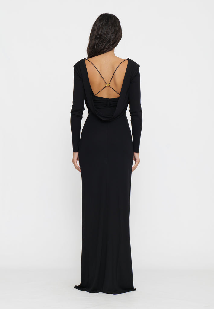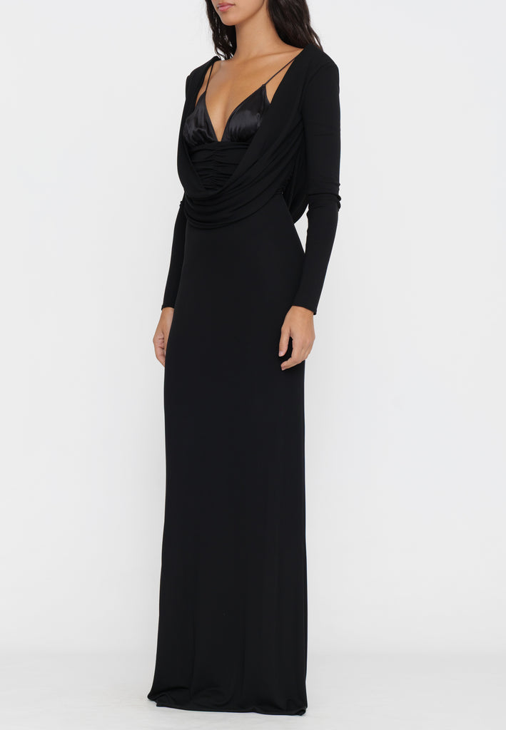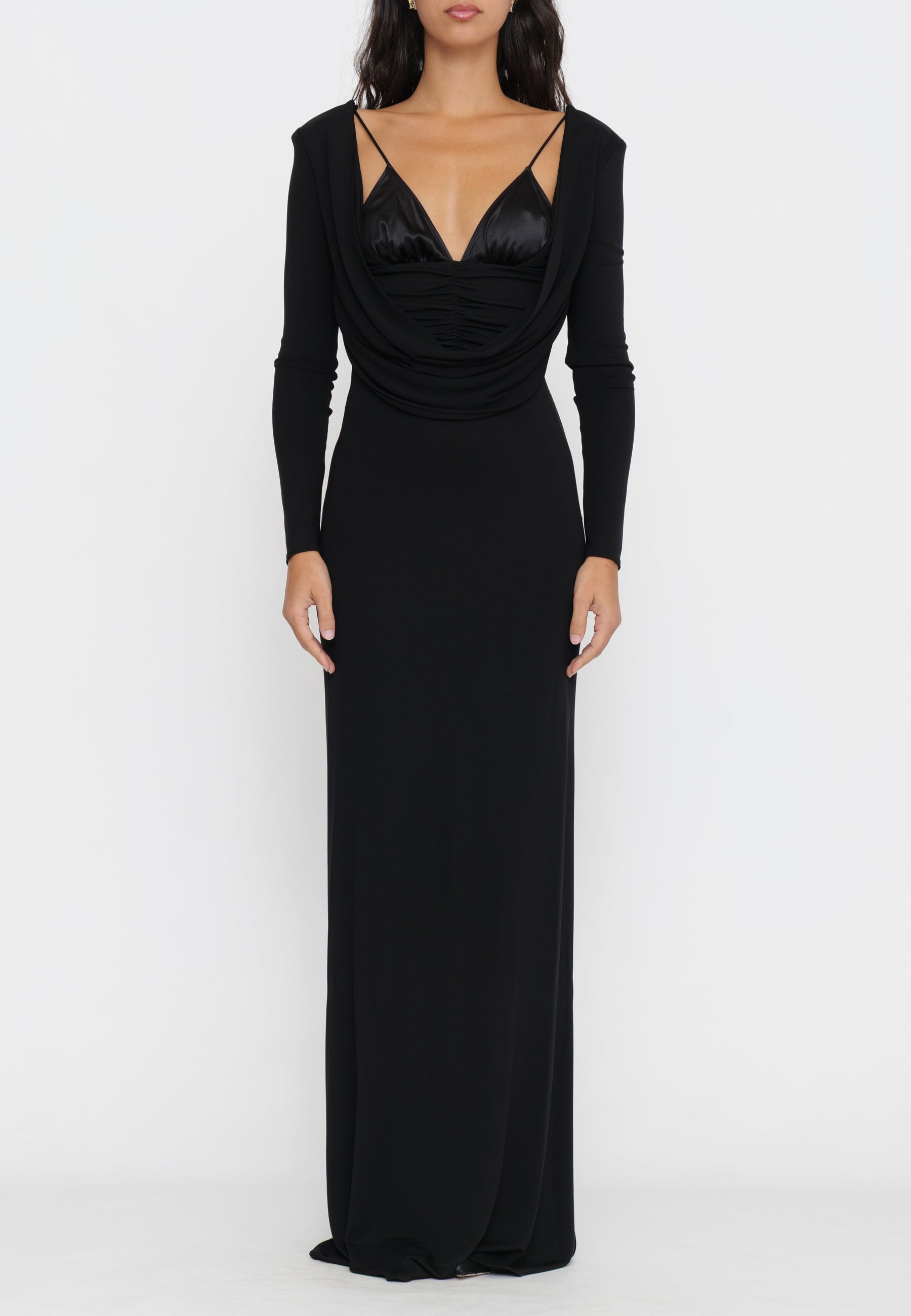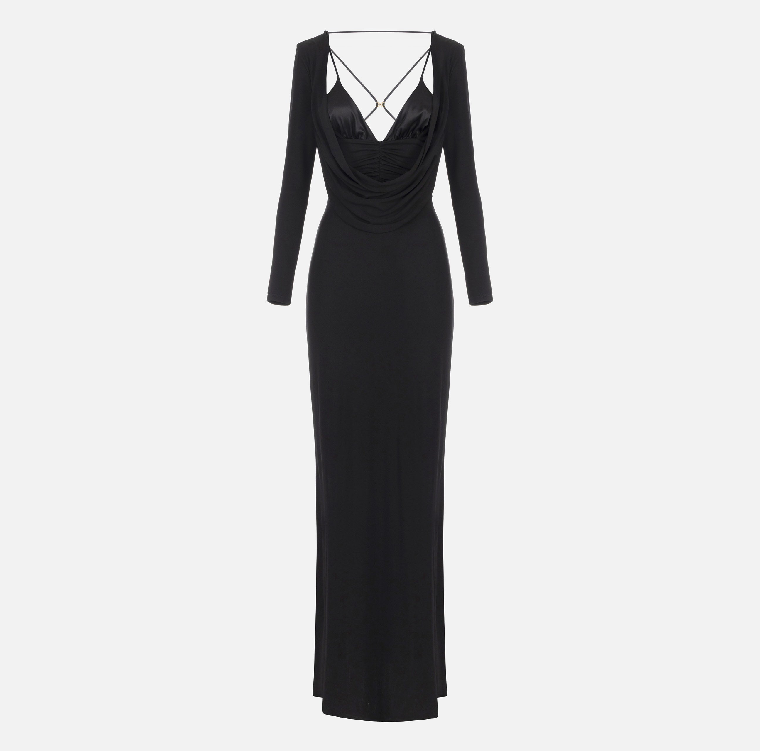 Questo abito da sera in jersey crêpe fluido valorizza l’eleganza con un ampio scollo drappeggiato che mette in risalto un reggiseno a triangolo in raso, garantendo comfort e stile. Il dettaglio del retro scoperto, con bretelle arricchite dal logo, aggiunge un tocco distintivo e raffinato, perfetto per eventi sofisticati.
