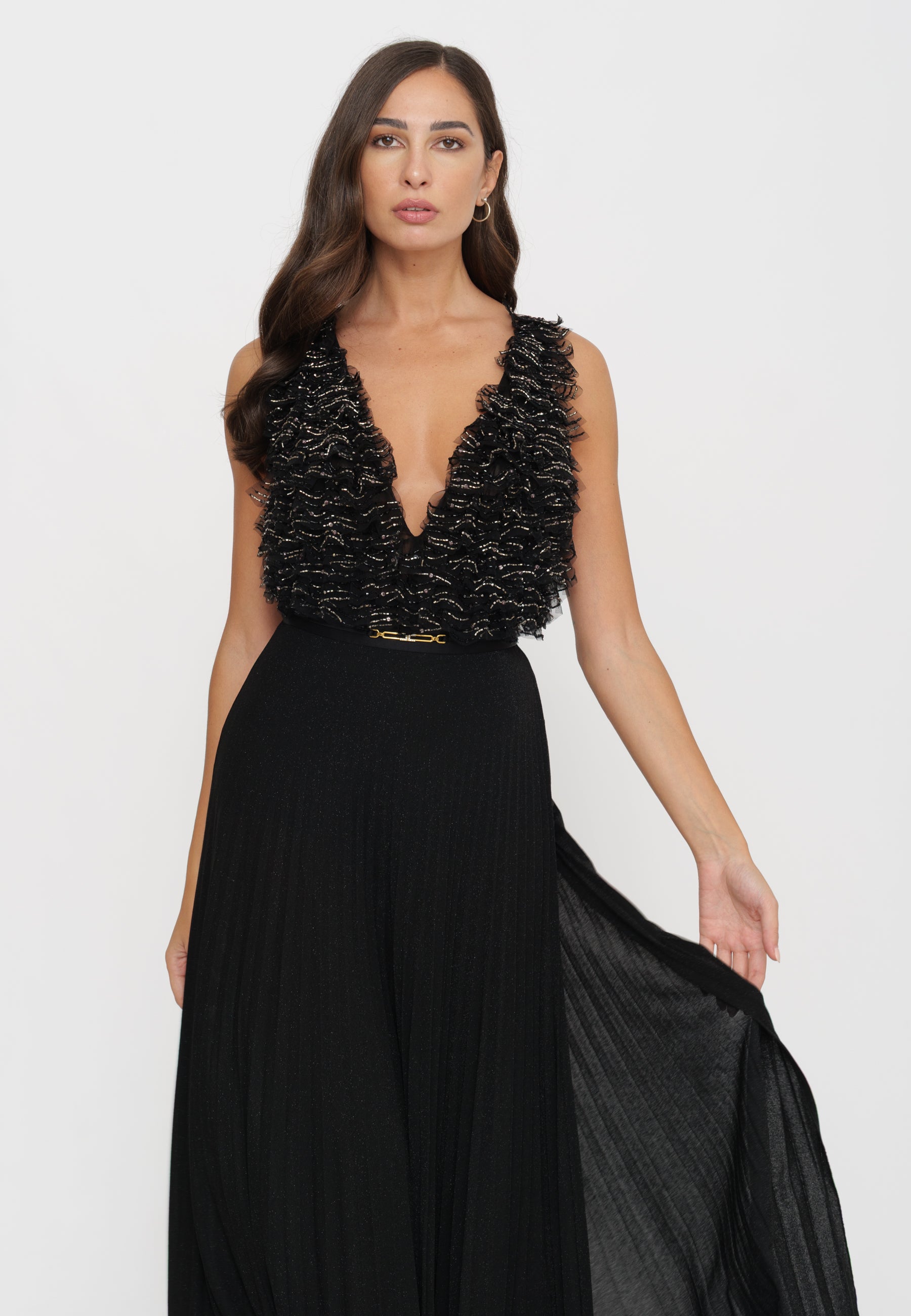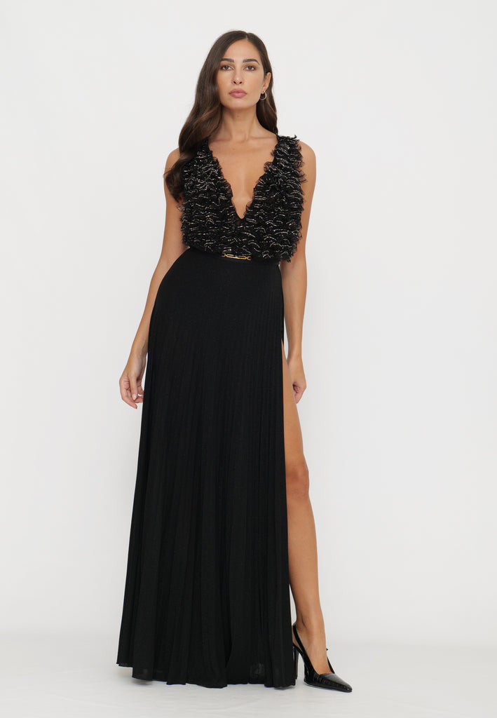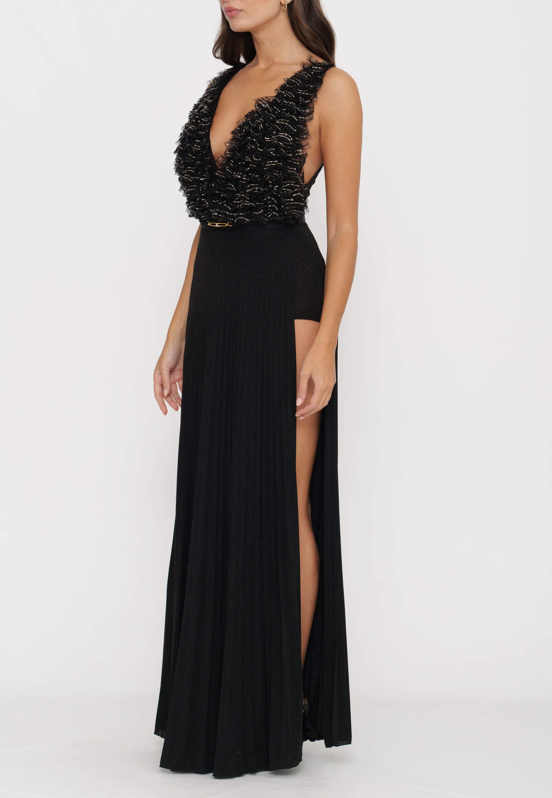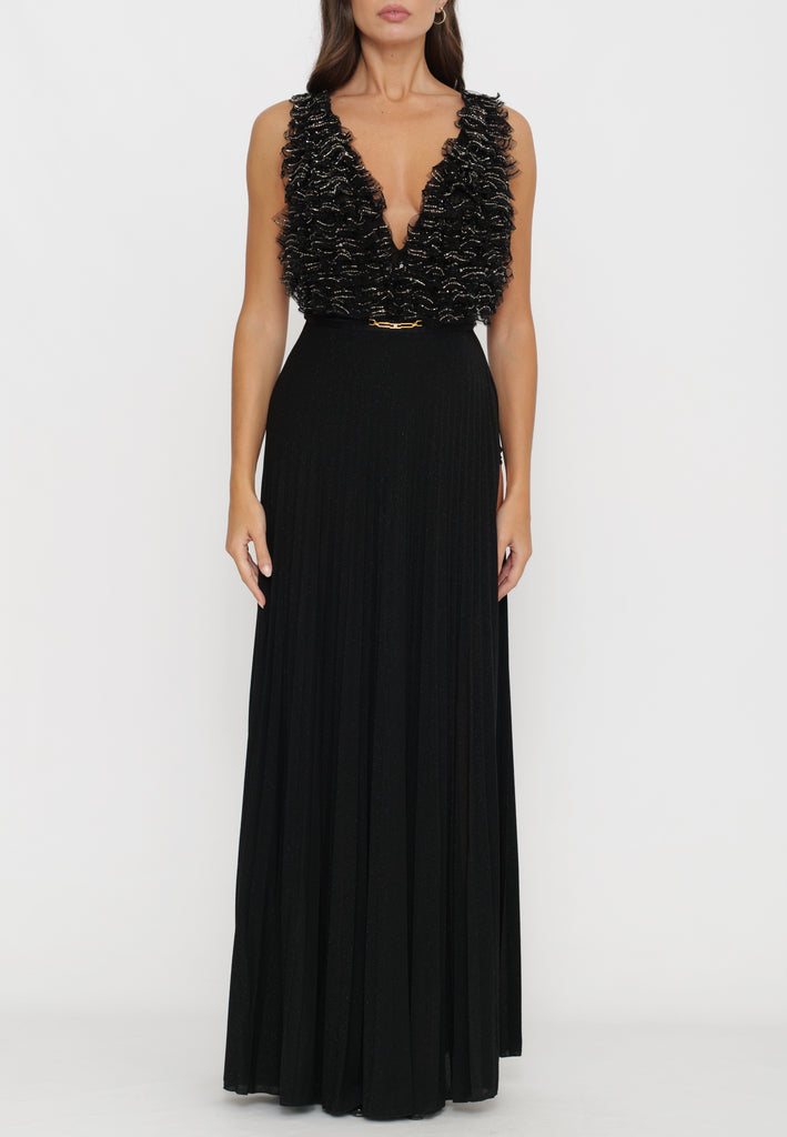 Abito realizzato in lurex prezioso, si distingue per le eleganti rouches che ne esaltano la femminilità e il fascino. La brillantezza del tessuto, combinata con il delicato gioco di volumi, crea un effetto raffinato e sofisticato, ideale per chi cerca un capo di classe che catturi l’attenzione con discrezione ed eleganza.