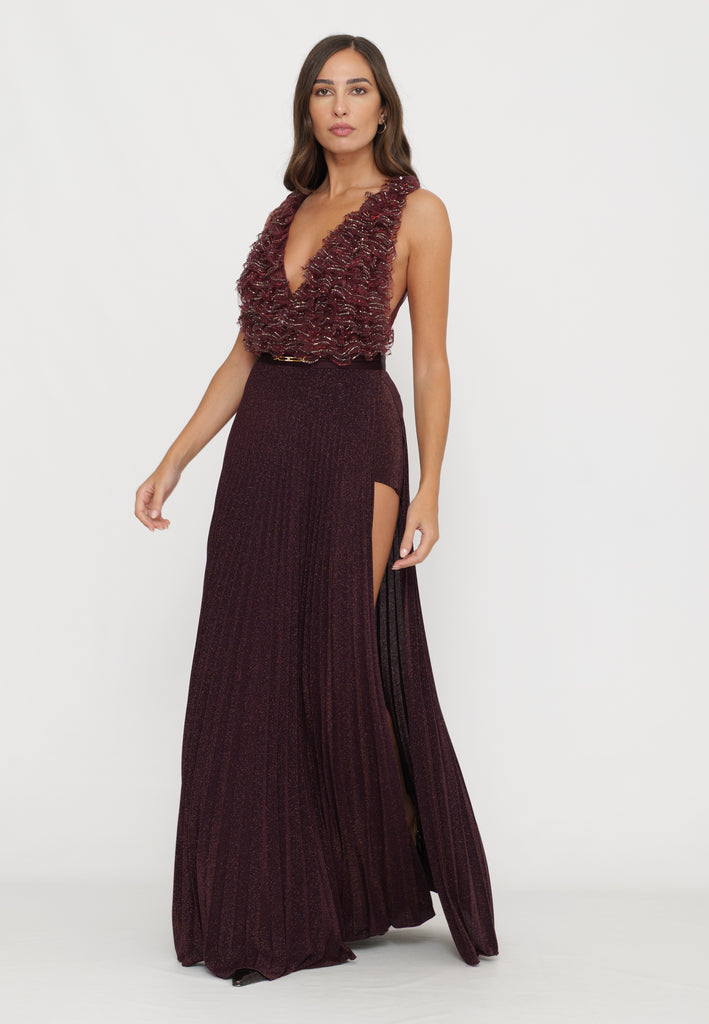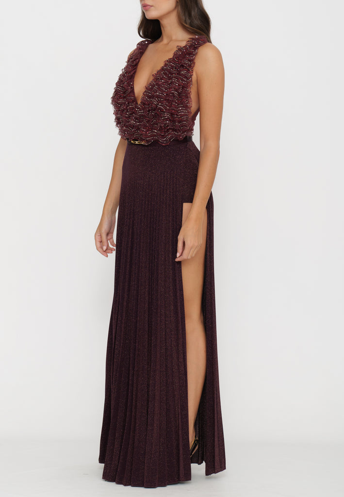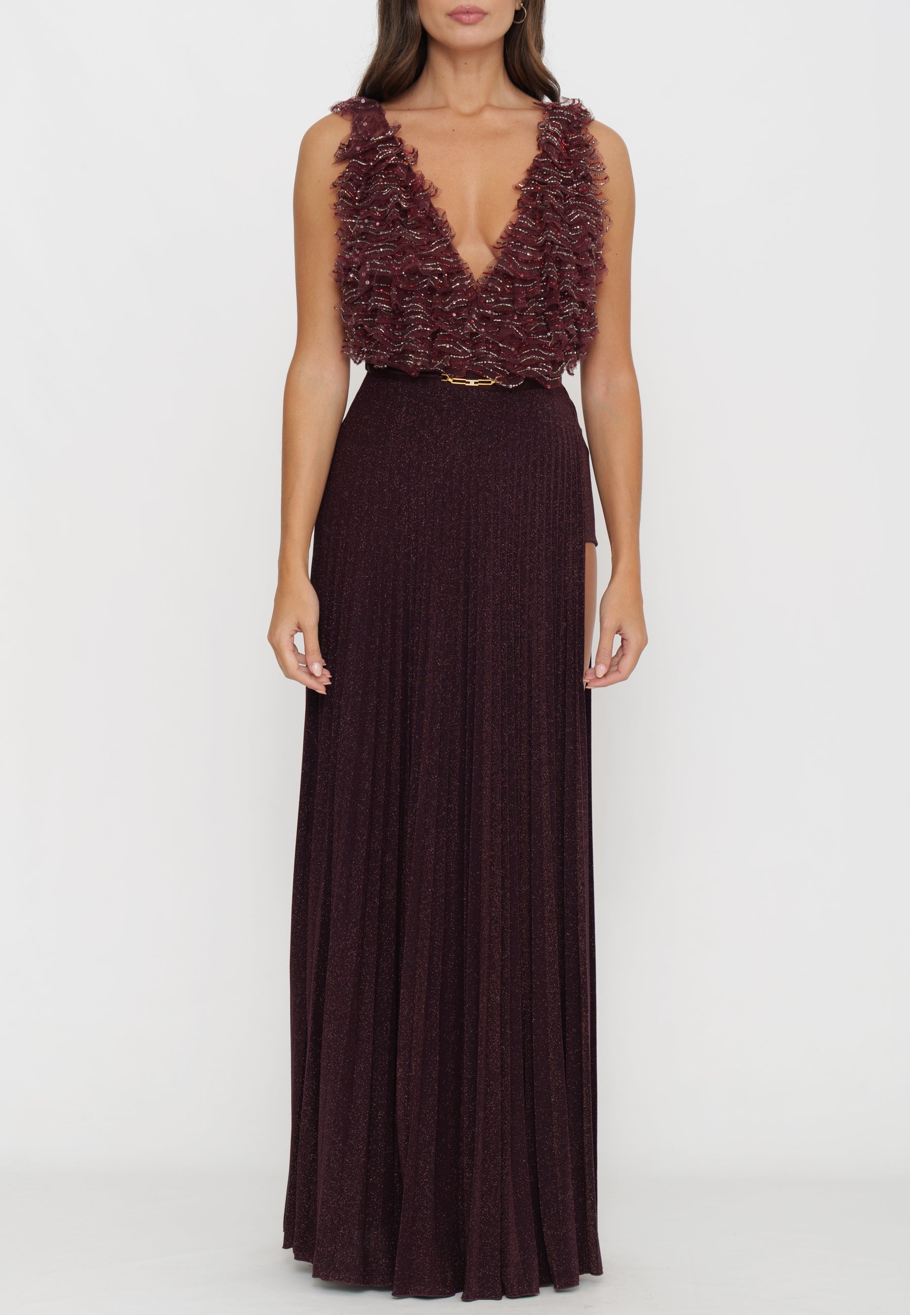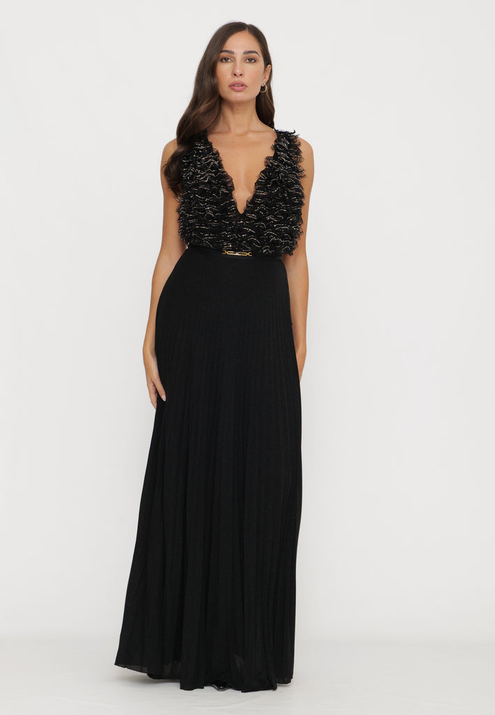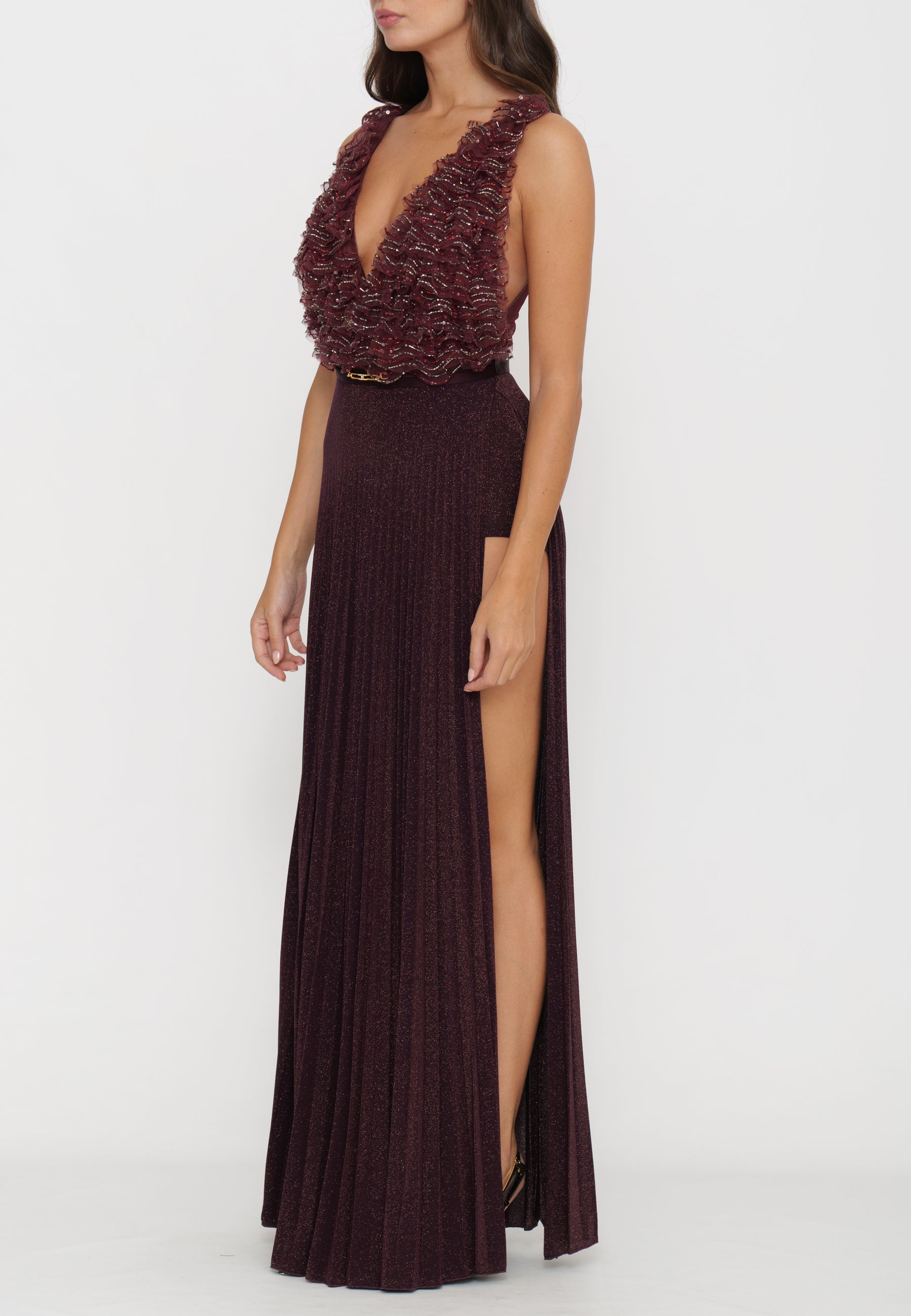 Abito realizzato in lurex prezioso, si distingue per le eleganti rouches che ne esaltano la femminilità e il fascino. La brillantezza del tessuto, combinata con il delicato gioco di volumi, crea un effetto raffinato e sofisticato, ideale per chi cerca un capo di classe che catturi l’attenzione con discrezione ed eleganza.