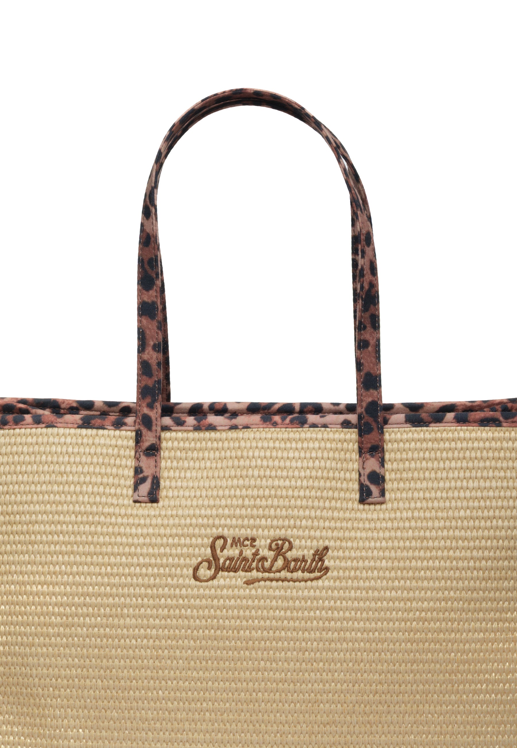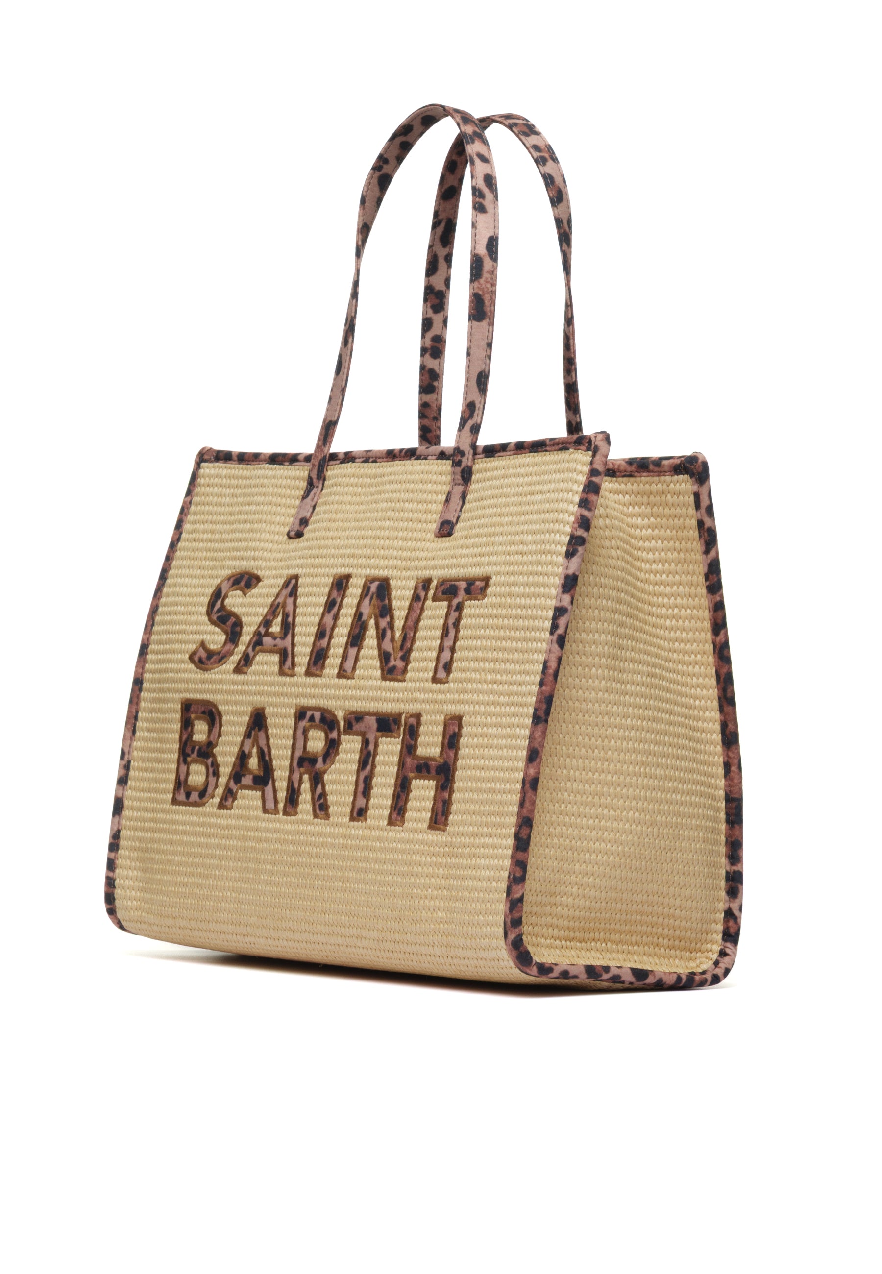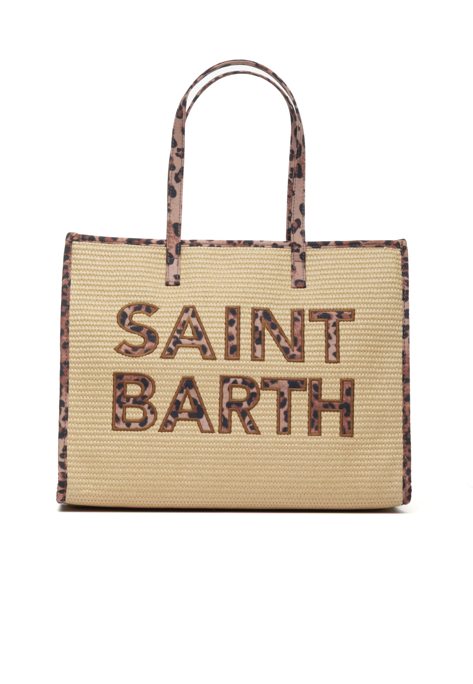 Borsa modello "Vivian Straw" Saint Barth in paglia naturale, colore beige caldo e accogliente. Caratterizzata da eleganti manici superiori con dettagli leopardati che aggiungono un tocco di stile selvaggio. Il logo lettering maxi leopardato sulla fronte rende questa borsa un accessorio statement perfetto per l'estate. Ideale per chi cerca un pezzo versatile che combina la semplicità della paglia con dettagli animalier sofisticati. Pratica e chic, accompagna ogni look con personalità.