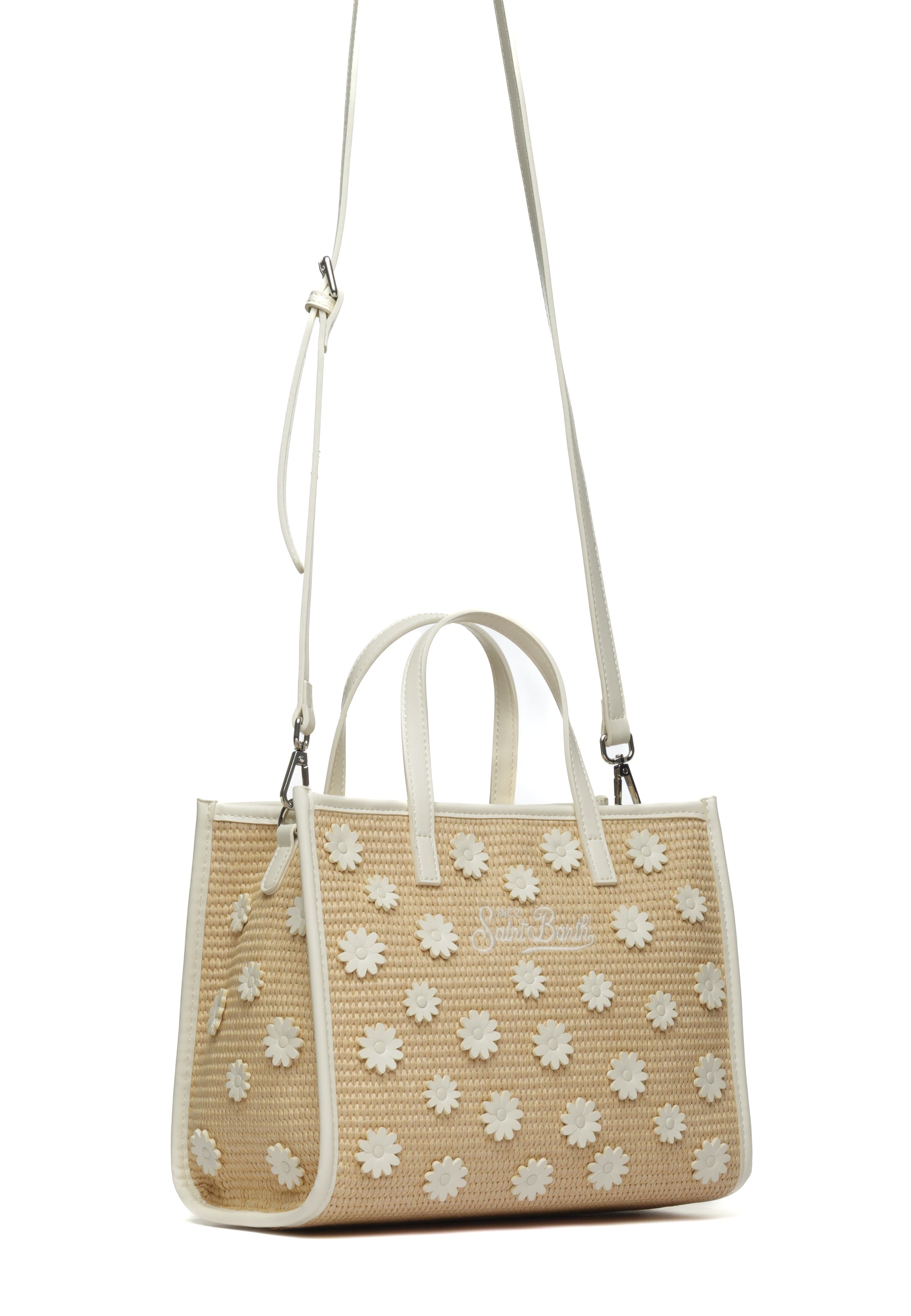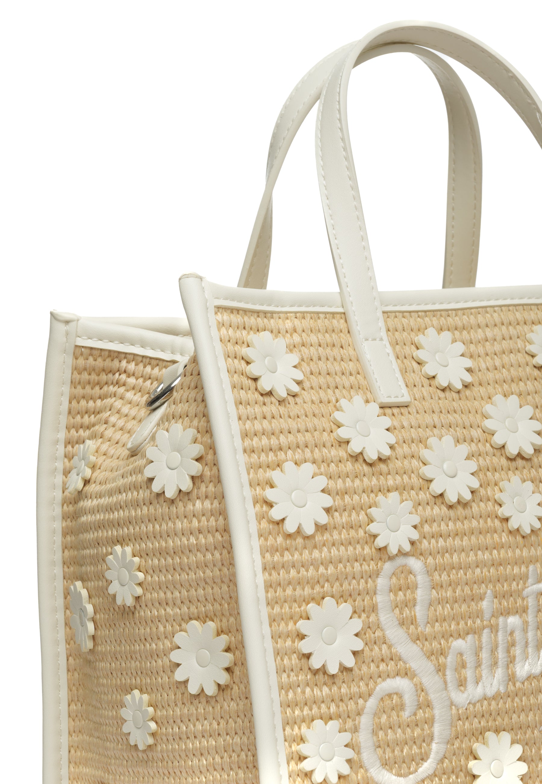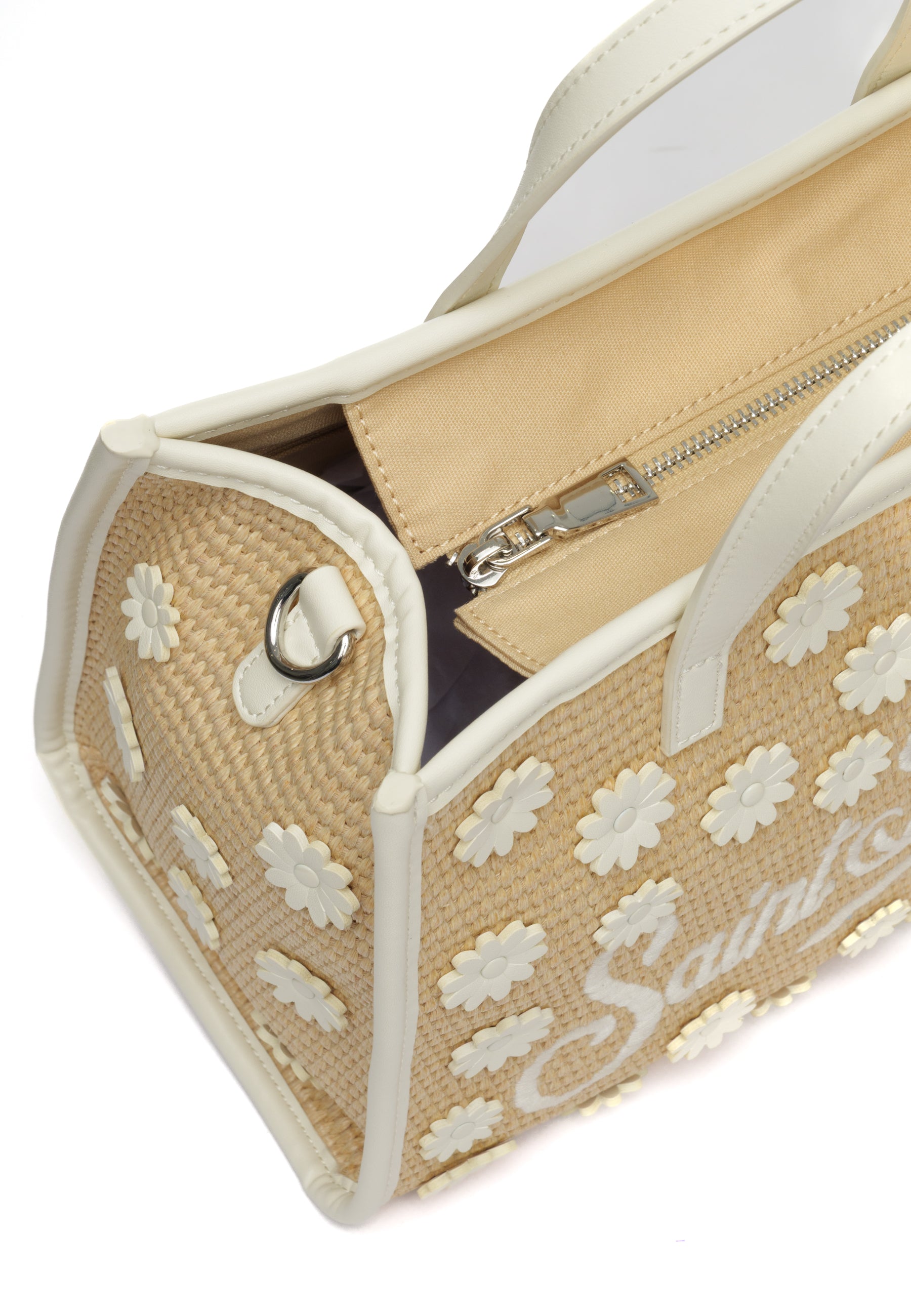 Borsa modello "Vivian Mid Straw Daisy" in paglia sintetica con manici e bordi in vera pelle e patch. Caratterizzata dal logo Saint Barth ricamato esclusivo e tracolla staccabile per versatilità d'uso. Un accessorio elegante e pratico che combina stile estivo con funzionalità quotidiana.