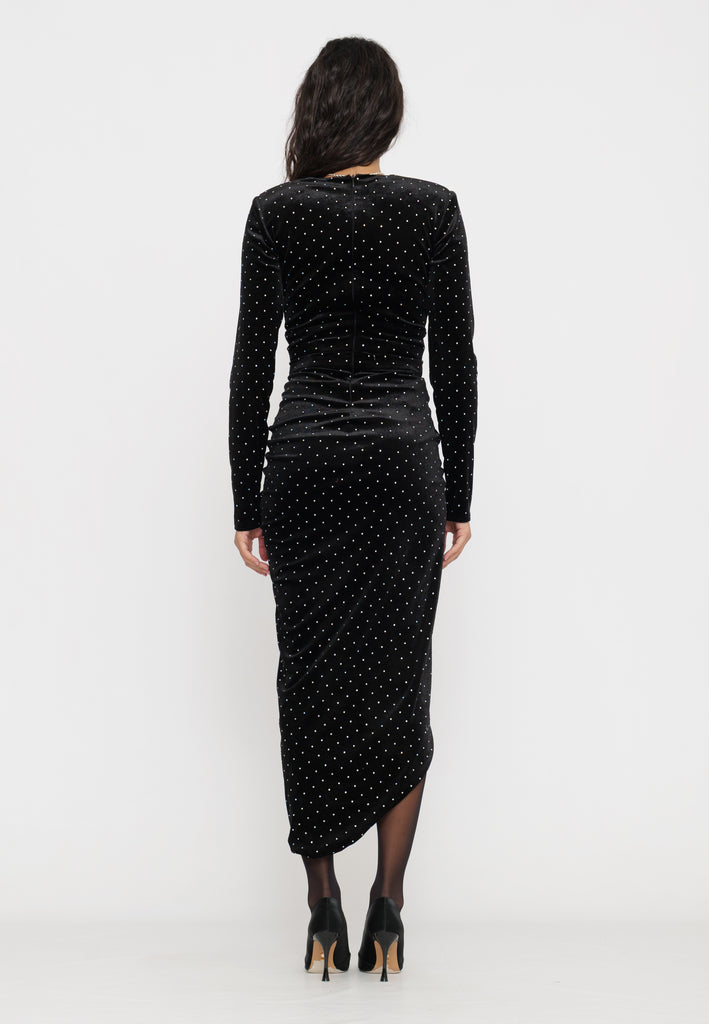 Questo elegante abito midi in velluto si distingue per lo spacco sofisticato e i raffinati brillantini, che donano un tocco di luce senza rinunciare alla sobrietà. Il tessuto morbido garantisce una vestibilità confortevole e valorizza la silhouette, rendendolo ideale per eventi formali e serate speciali. Un capo perfetto per chi cerca un equilibrio tra stile classico e dettagli moderni.