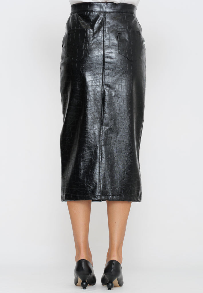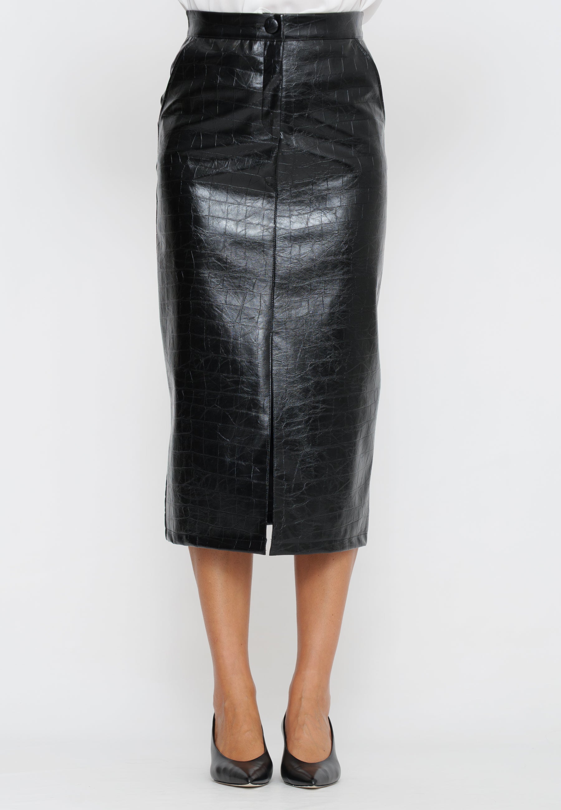 Questa gonna tubino valorizza la silhouette con una vestibilità aderente. Il materiale in ecopelle garantisce un aspetto sofisticato e resistente, ideale per chi cerca uno stile deciso senza rinunciare al comfort. Perfetta per occasioni formali o serate, si abbina facilmente a camicie e blazer per un look contemporaneo e raffinato.
