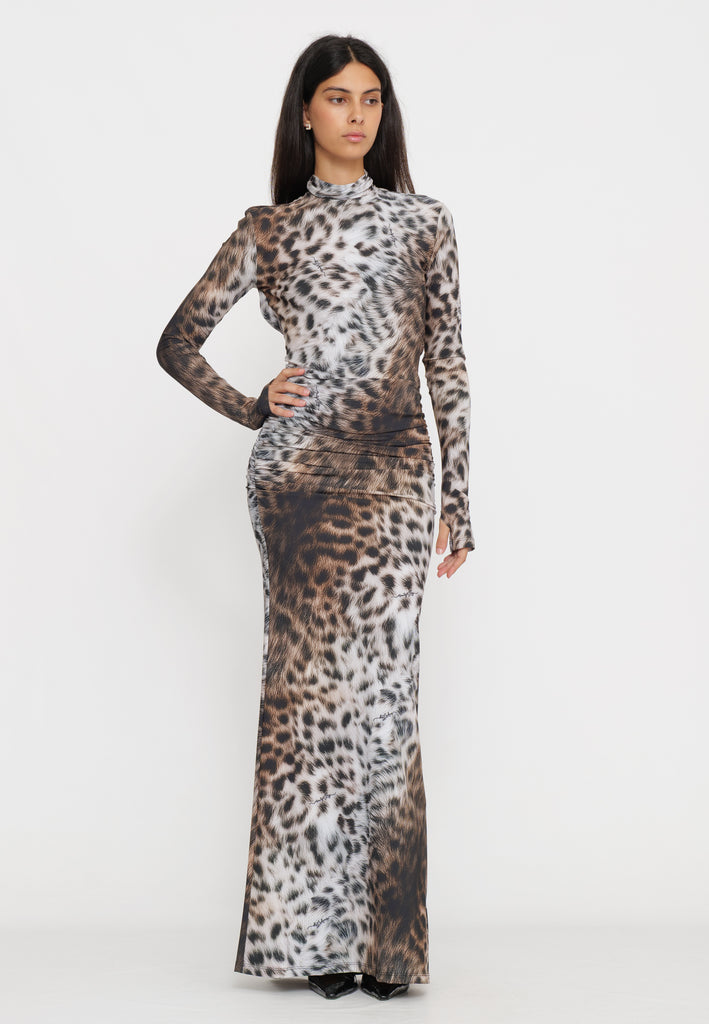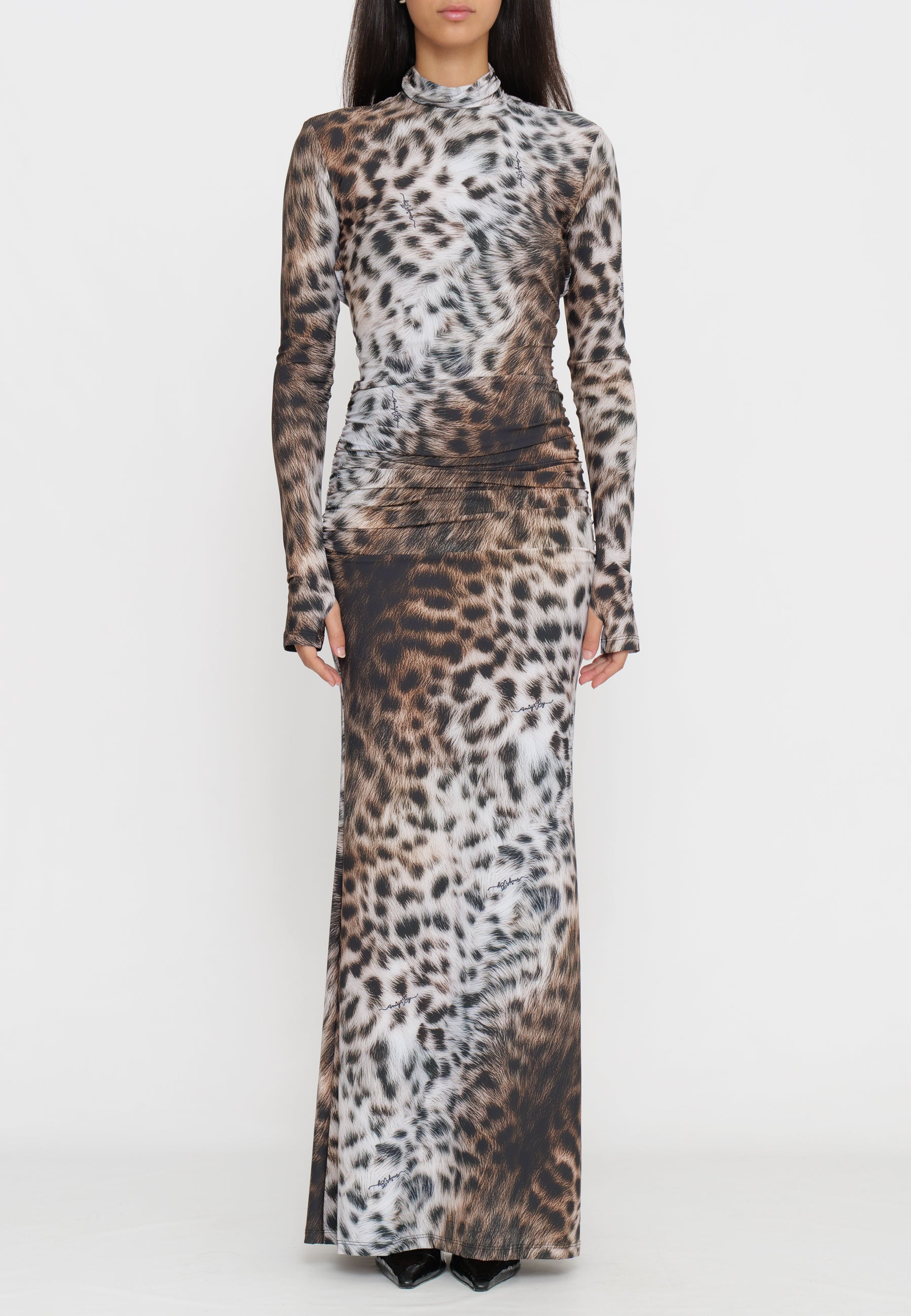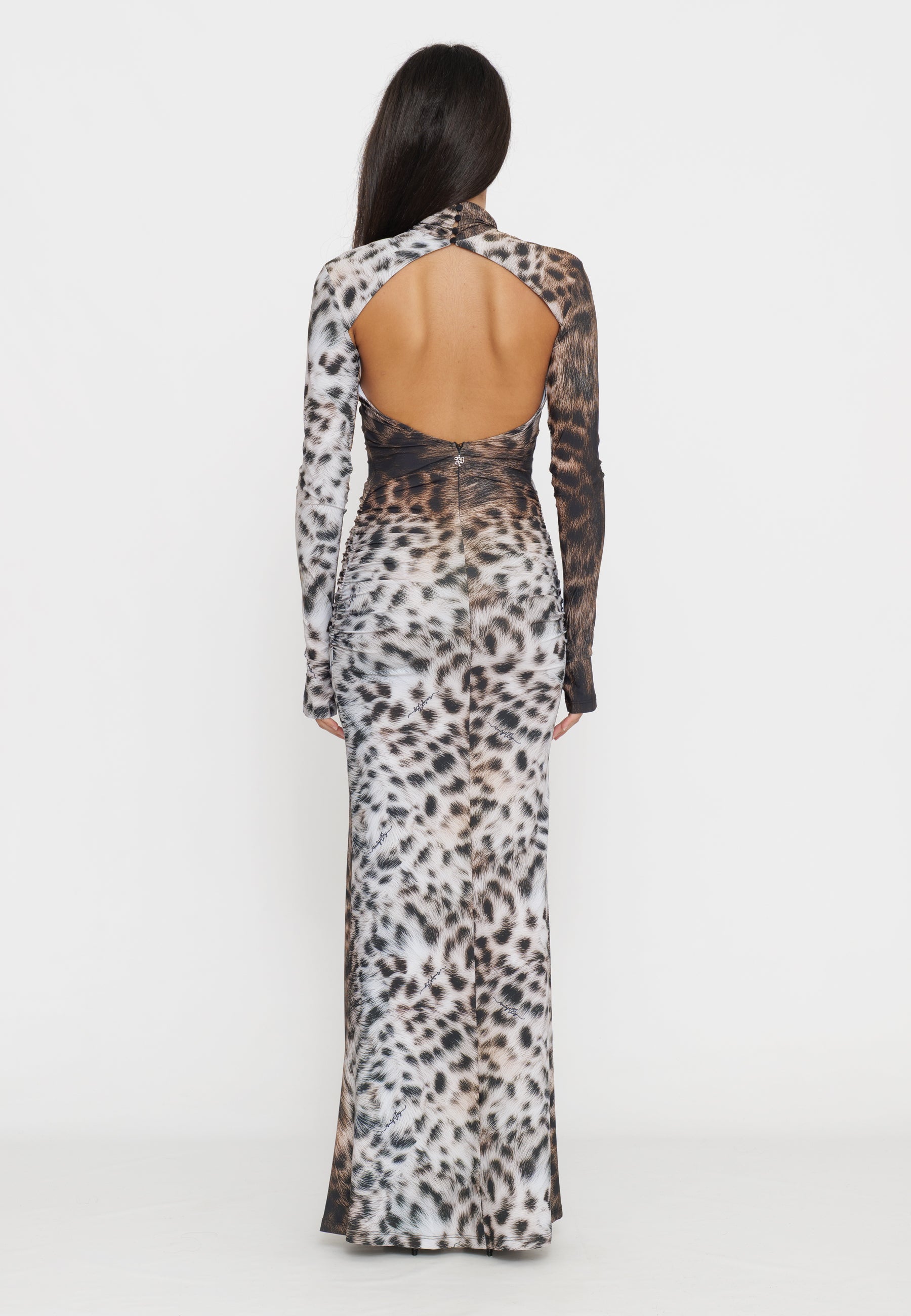 Abito lungo in tessuto maculato che cattura l'essenza della sofisticazione contemporanea. Il design caratterizzato dalla schiena scoperta crea un effetto visivo affascinante, perfetto per occasioni serali e eventi speciali. La stampa maculata aggiunge movimento e personalità al capo, mentre la silhouette elegante valorizza la figura. Un pezzo versatile che combina audacia e raffinatezza, ideale per chi desidera un look distintivo e di impatto.