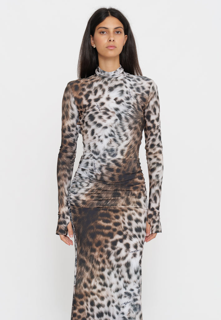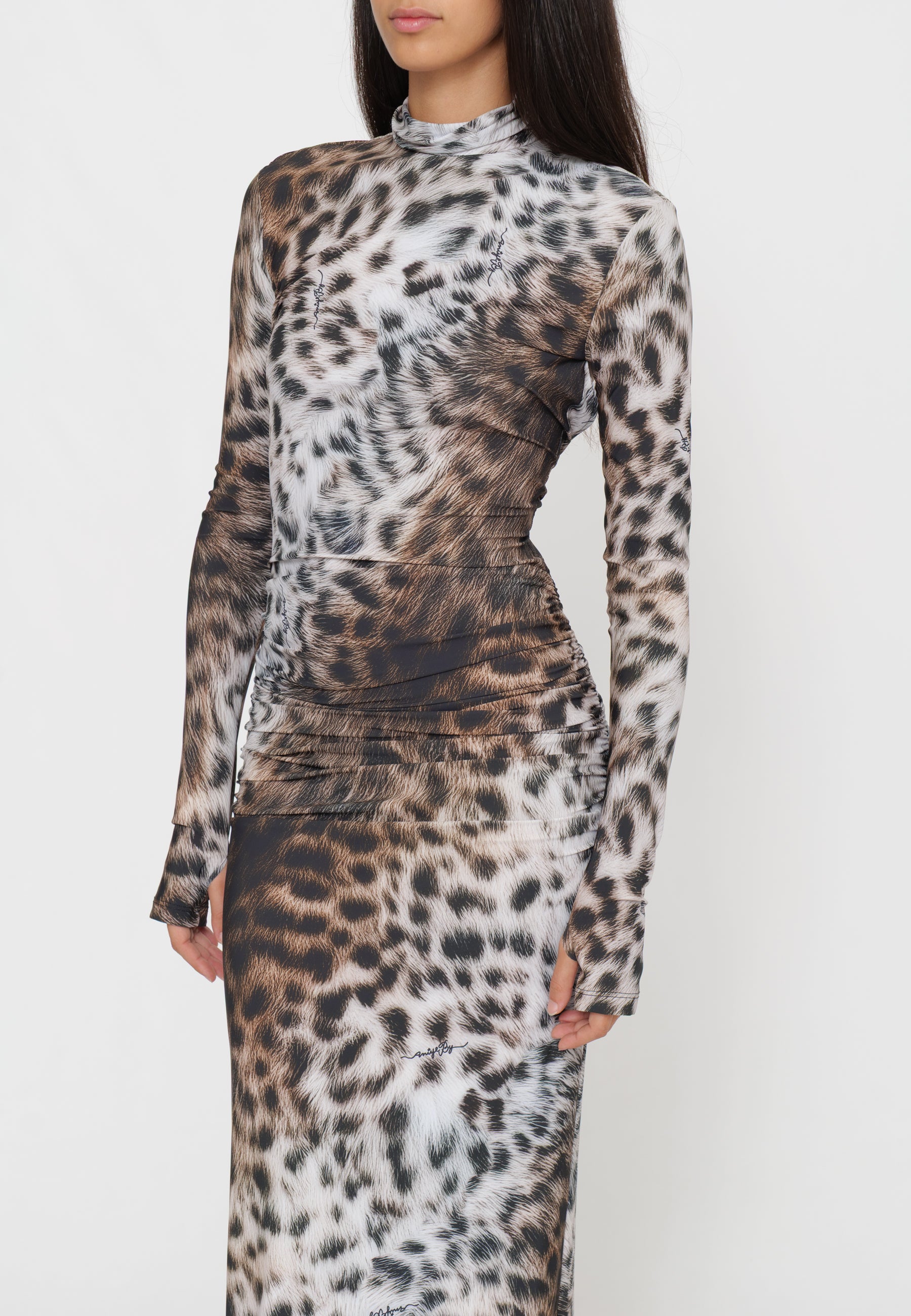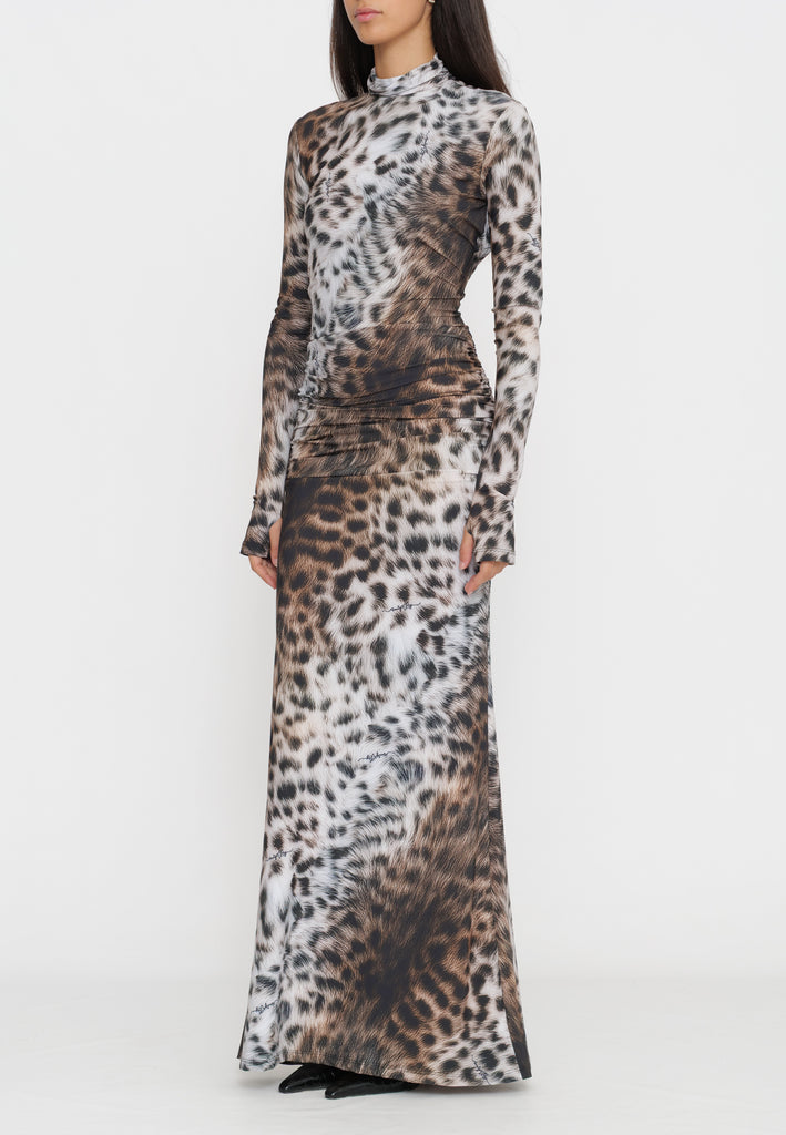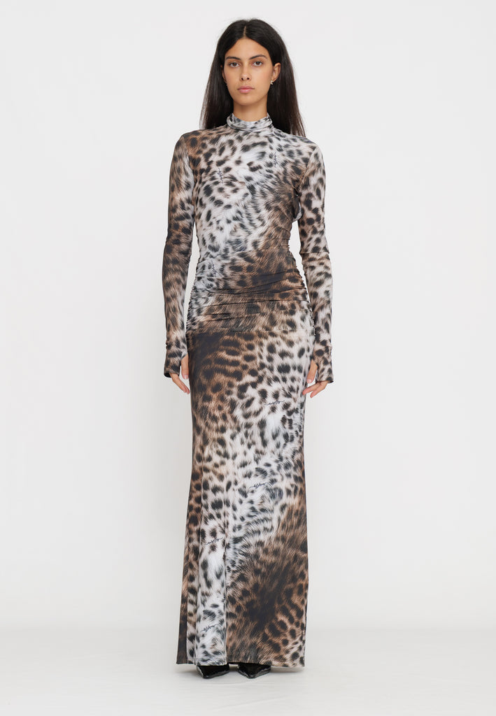 Abito lungo in tessuto maculato che cattura l'essenza della sofisticazione contemporanea. Il design caratterizzato dalla schiena scoperta crea un effetto visivo affascinante, perfetto per occasioni serali e eventi speciali. La stampa maculata aggiunge movimento e personalità al capo, mentre la silhouette elegante valorizza la figura. Un pezzo versatile che combina audacia e raffinatezza, ideale per chi desidera un look distintivo e di impatto.
