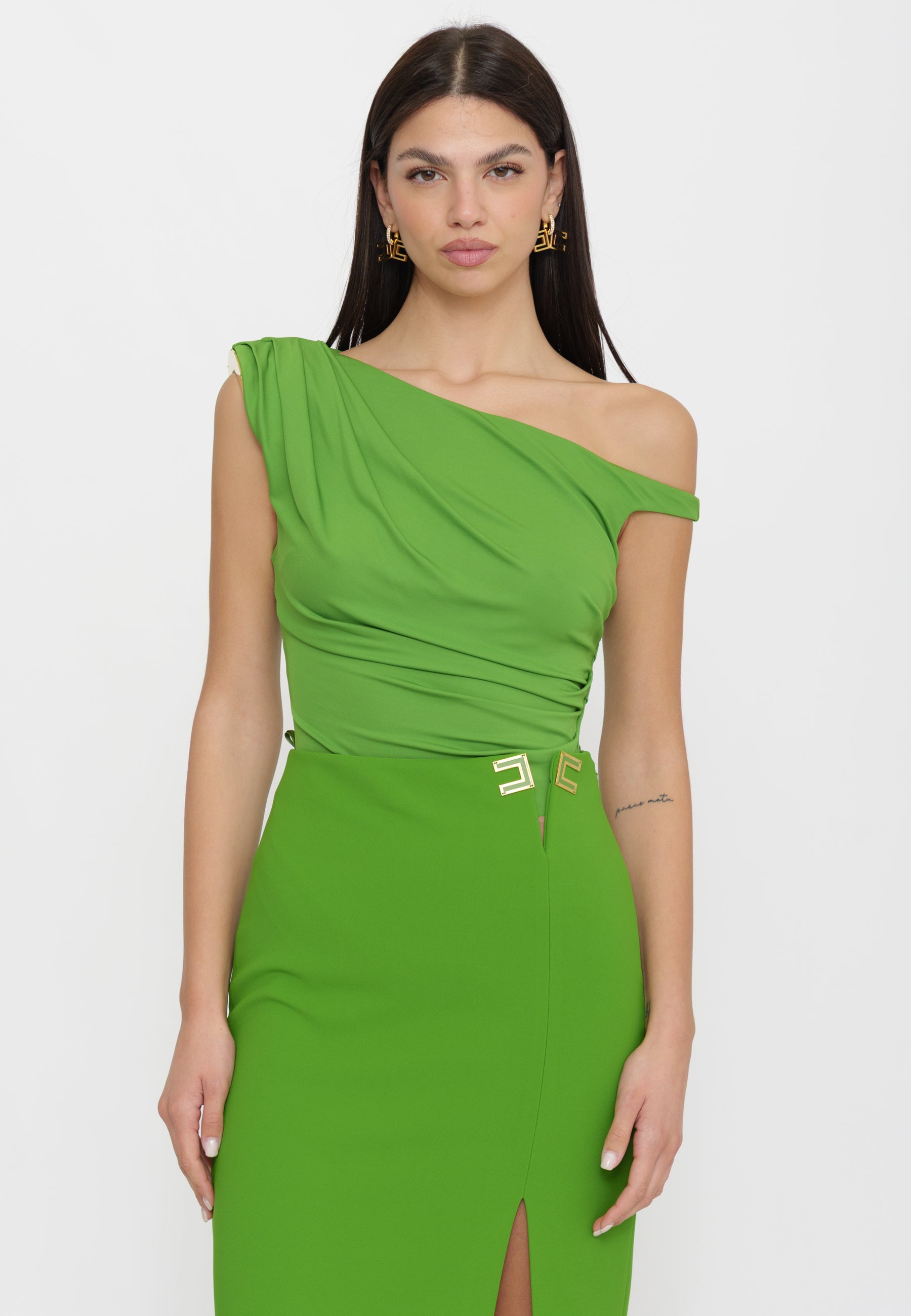 Body in jersey a vestibilità aderente con design monospalla strutturato. La mezzaluna in metallo dorato aggiunge una nota luminosa e sofisticata al capo. I drappeggi strategicamente posizionati creano volume e definizione, esaltando la silhouette. Un pezzo versatile che combina eleganza minimale e dettagli ricercati, perfetto per look contemporanei e raffinati.