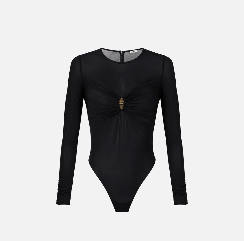 Realizzato in jersey dalla vestibilità aderente, questo body presenta un elegante girocollo e maniche lunghe per un comfort sofisticato. Il dettaglio distintivo è il drappeggio centrale, valorizzato da una placca gioiello smaltata decorata con un raffinato motivo ispirato alla texture snake, che conferisce un tocco di esclusività e stile unico al capo.