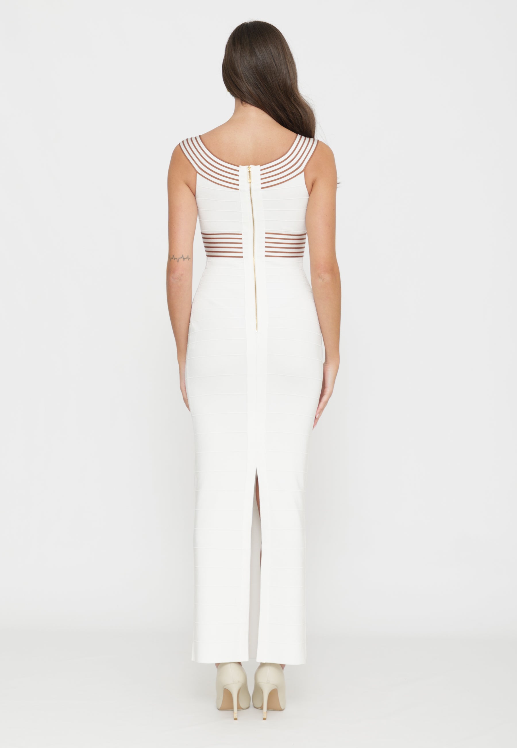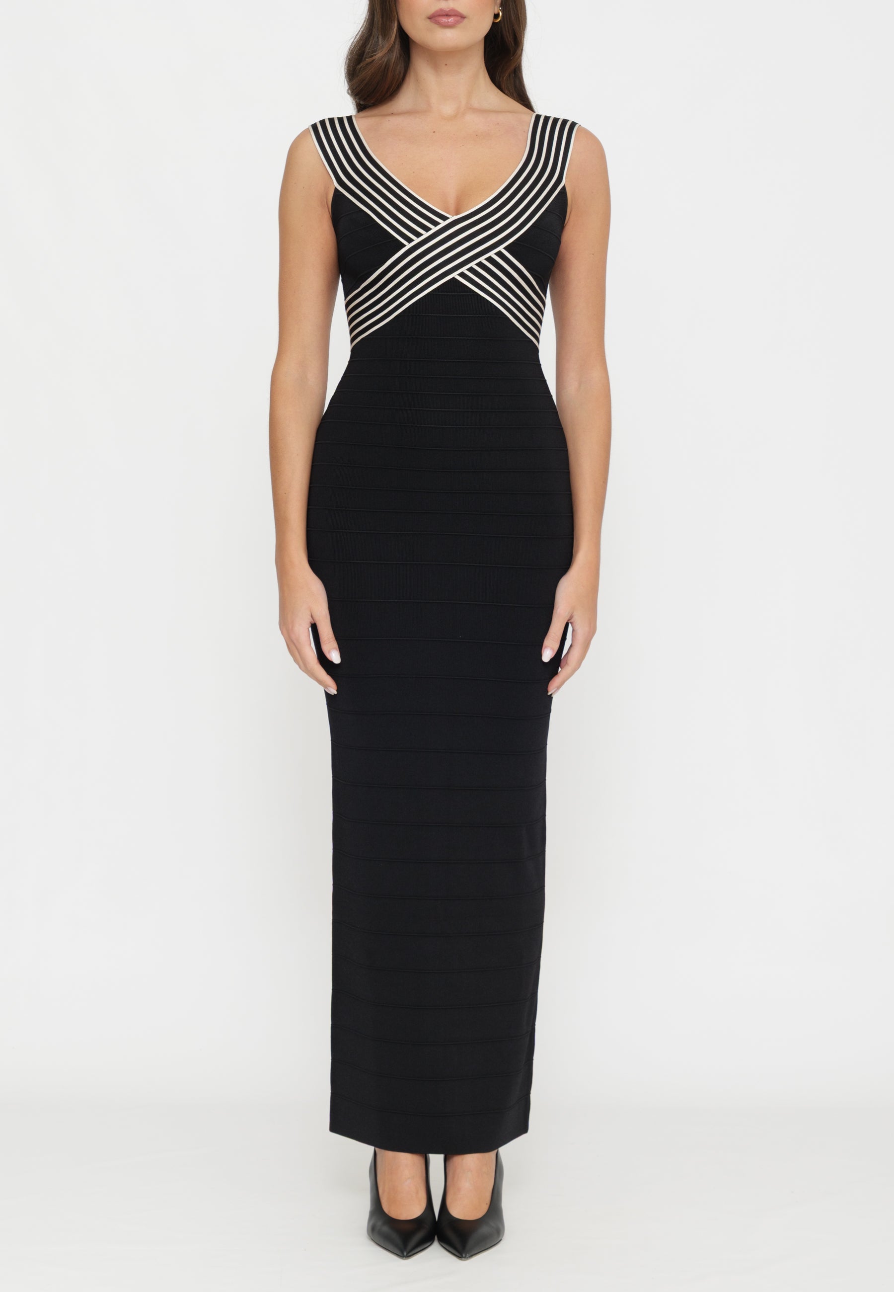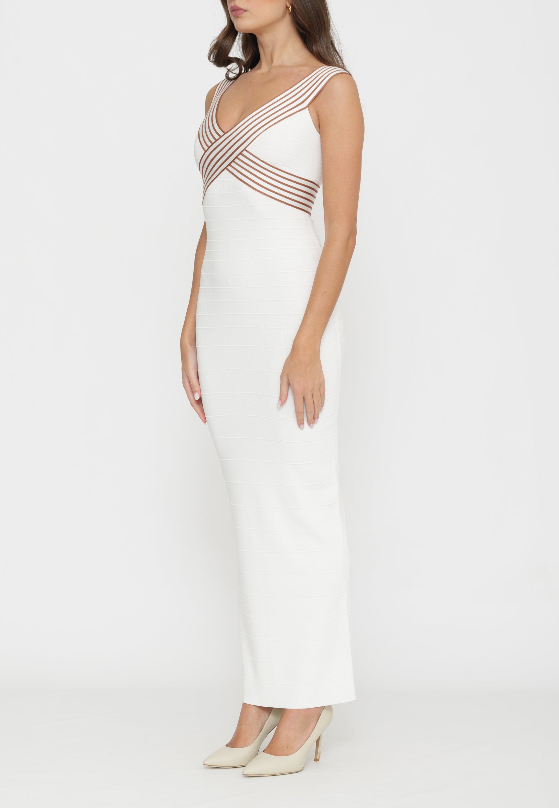 Abito lungo in maglia con vestibilità aderente che valorizza la silhouette. Caratterizzato da bande decorative a contrasto che incorniciano il busto, il capo presenta una lavorazione a costine con nervature orizzontali che conferiscono dinamismo alla trama. Lo spacco posteriore enfatizza le linee geometriche del design, creando un effetto sofisticato e contemporaneo. Un pezzo versatile che combina eleganza strutturata e comfort, ideale per occasioni che richiedono stile consapevole.