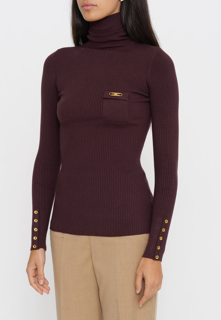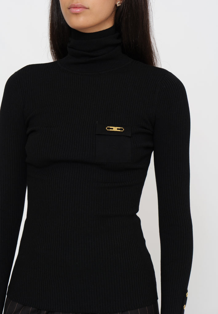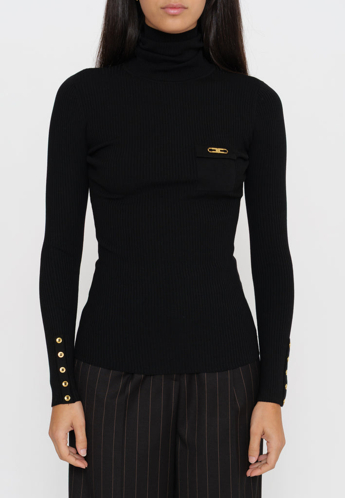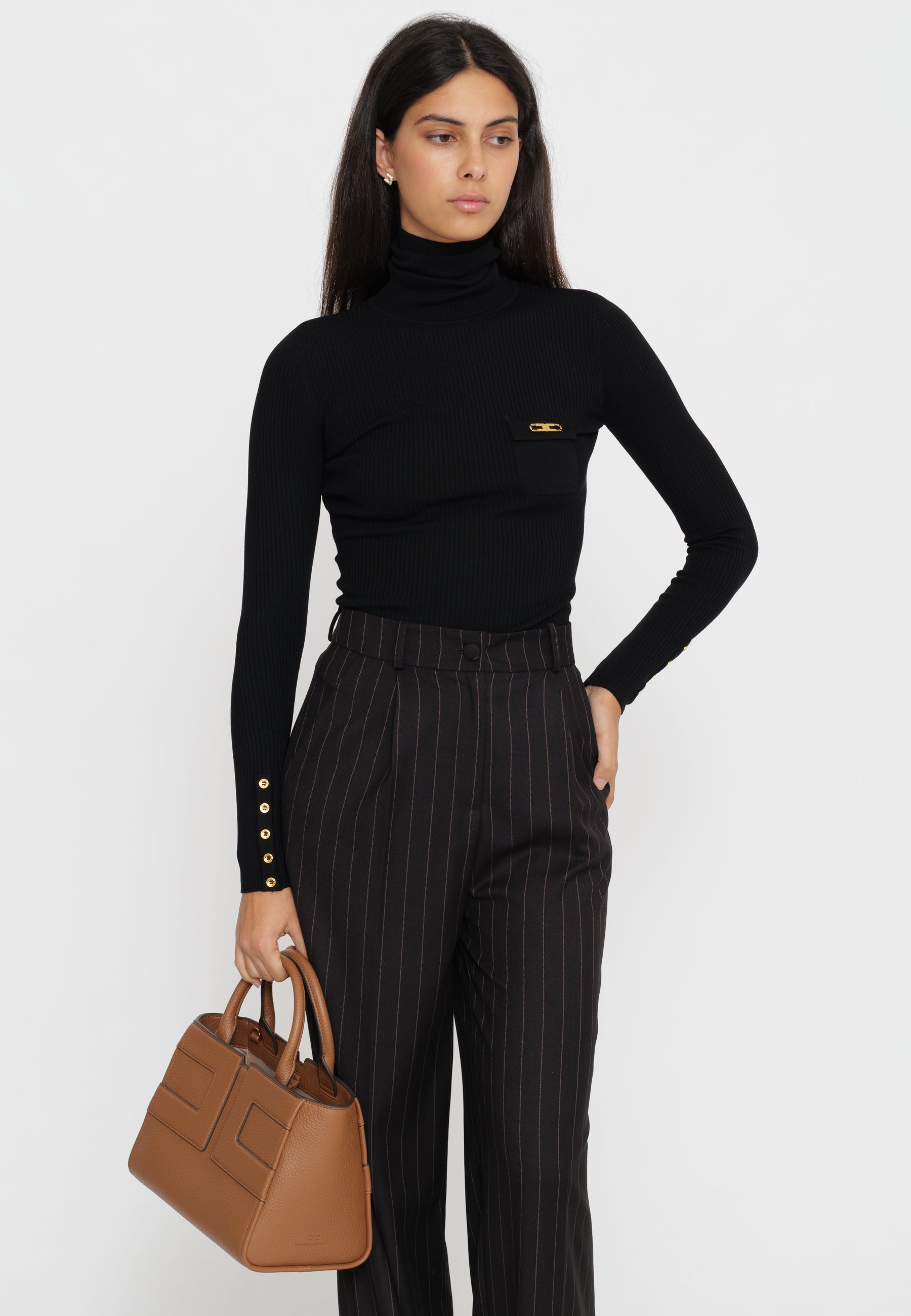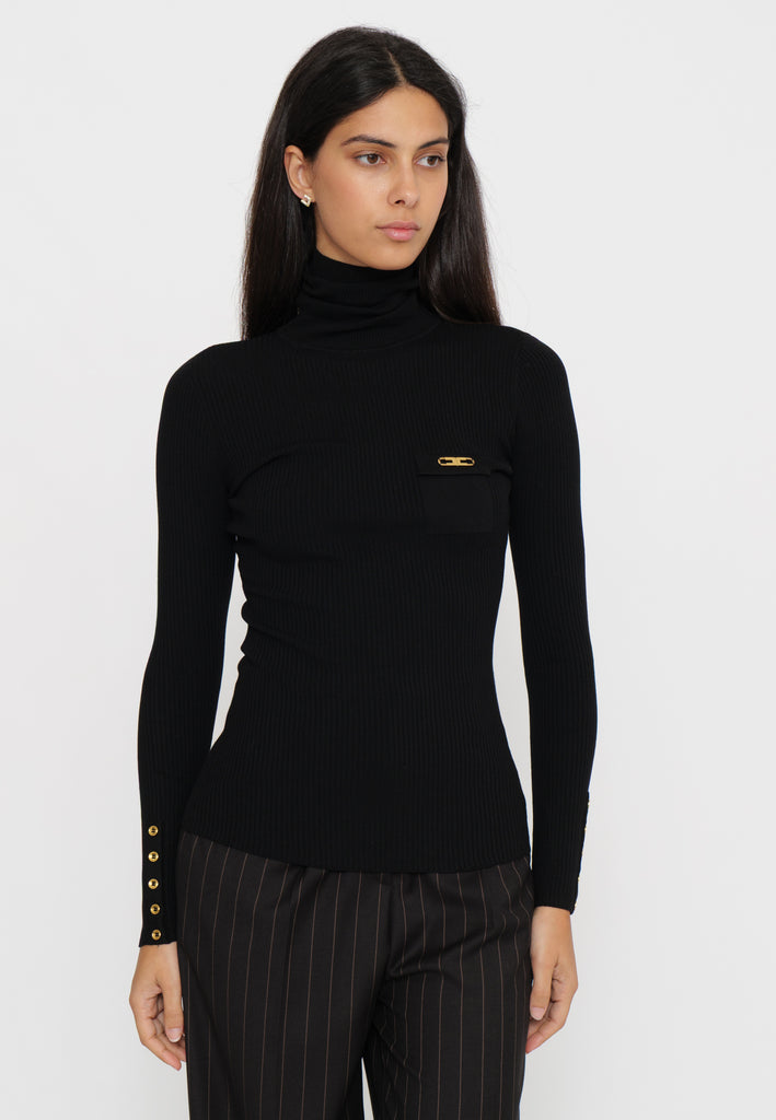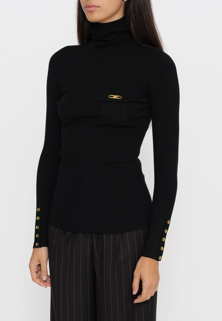 Questa maglia a costine dalla vestibilità aderente unisce eleganza e comfort. Il collo dolcevita valorizza la silhouette con un tocco raffinato, mentre le maniche presentano bottoni al fondo per un dettaglio distintivo. Il taschino in raso impreziosito dal logo aggiunge una nota luminosa e sofisticata, rendendo il capo ideale per chi cerca uno stile ricercato senza rinunciare alla praticità. Perfetta per completare look sia formali che casual con classe.