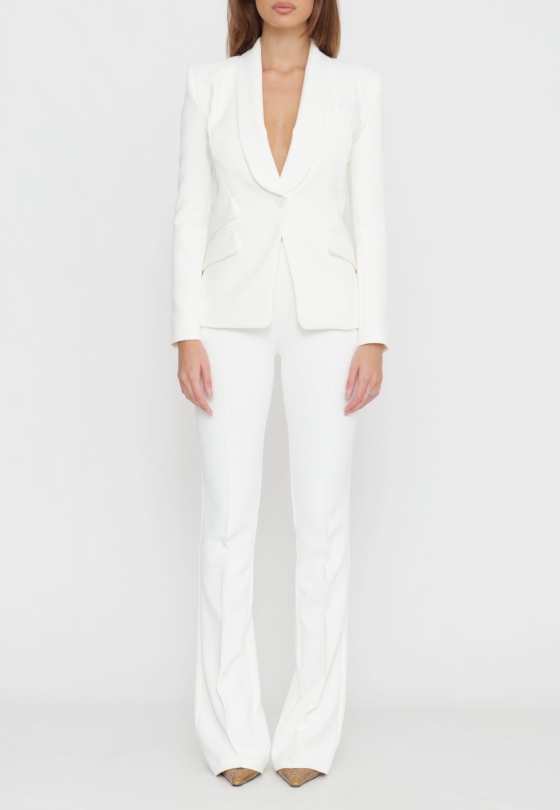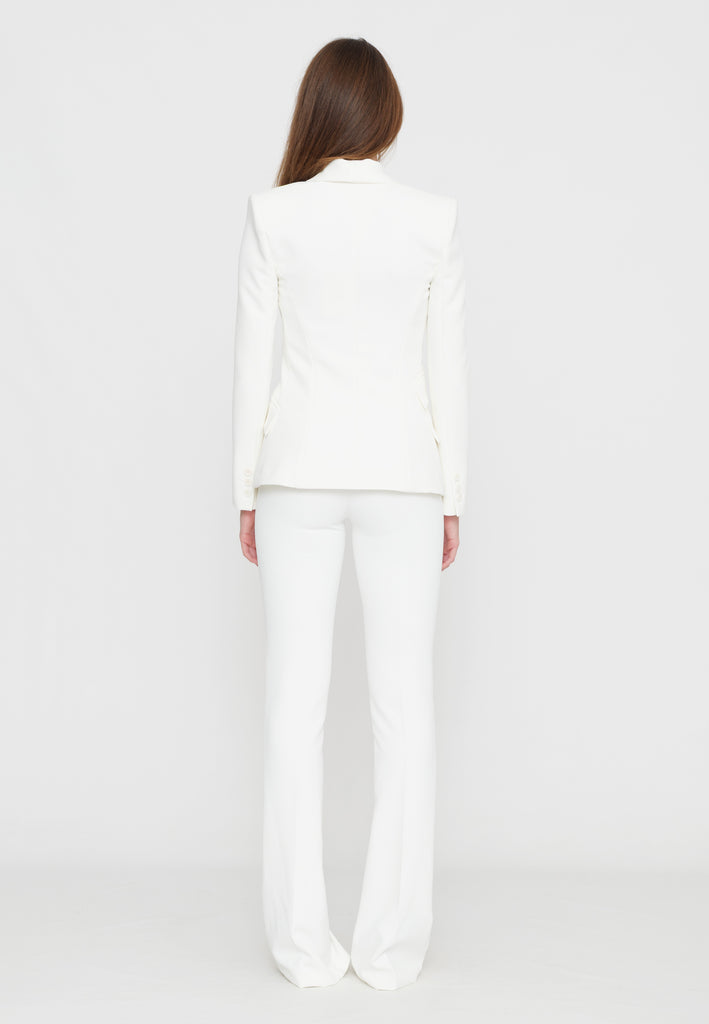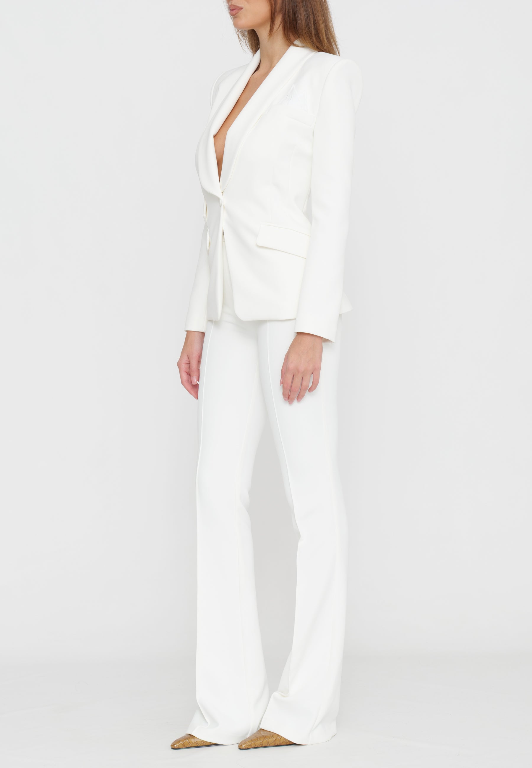 Tailleur monopetto in crêpe che unisce eleganza e raffinatezza. La giacca presenta spalle strutturate e collo sciallato, completata da patte e taschino con pochette in popeline di cotone caratterizzata dal logo ricamato. I pantaloni a linea svasata sono impreziositi dal nastro con logo sul fascione. Vestibilità slim che valorizza la silhouette con un'estetica contemporanea e sofisticata.
