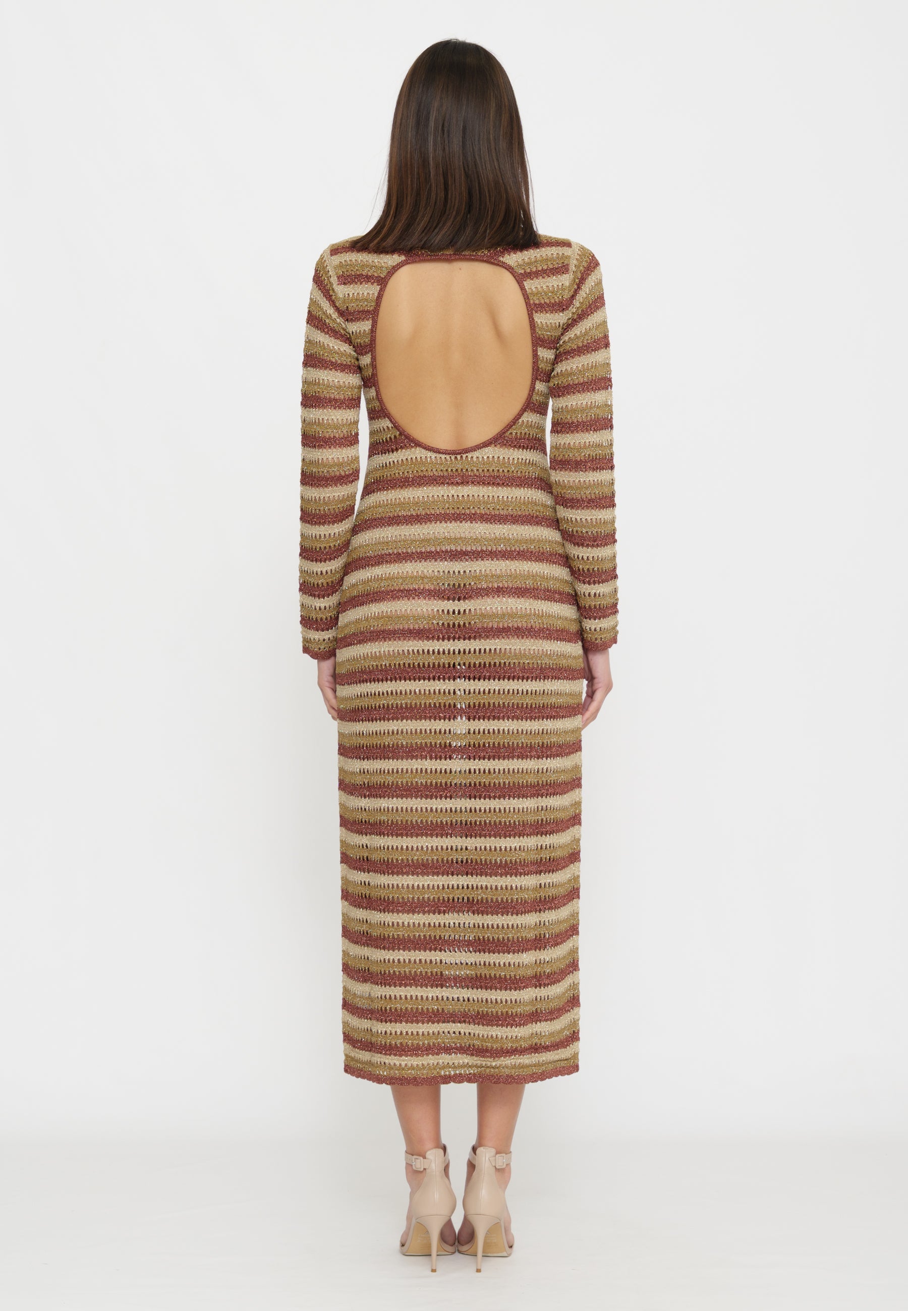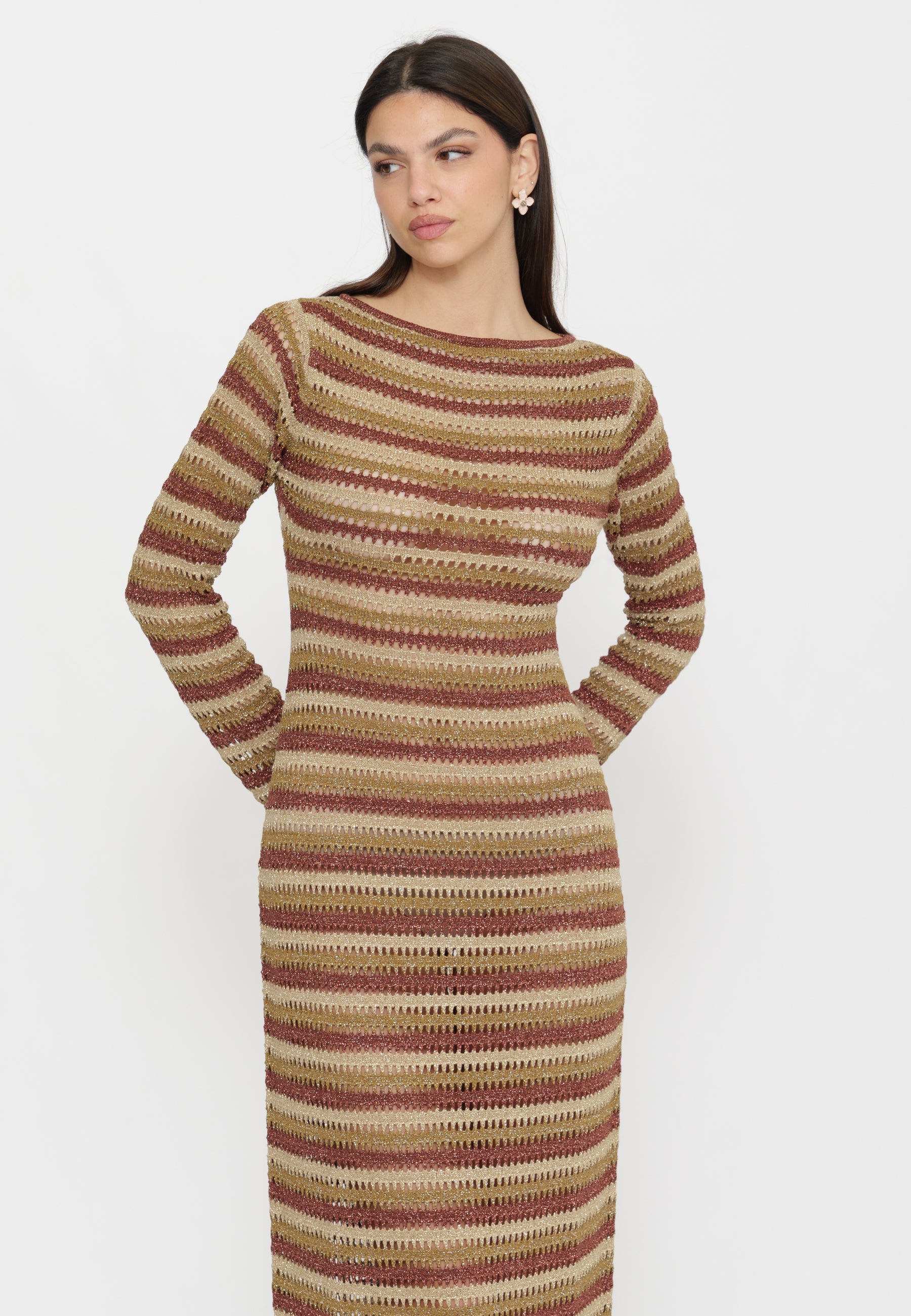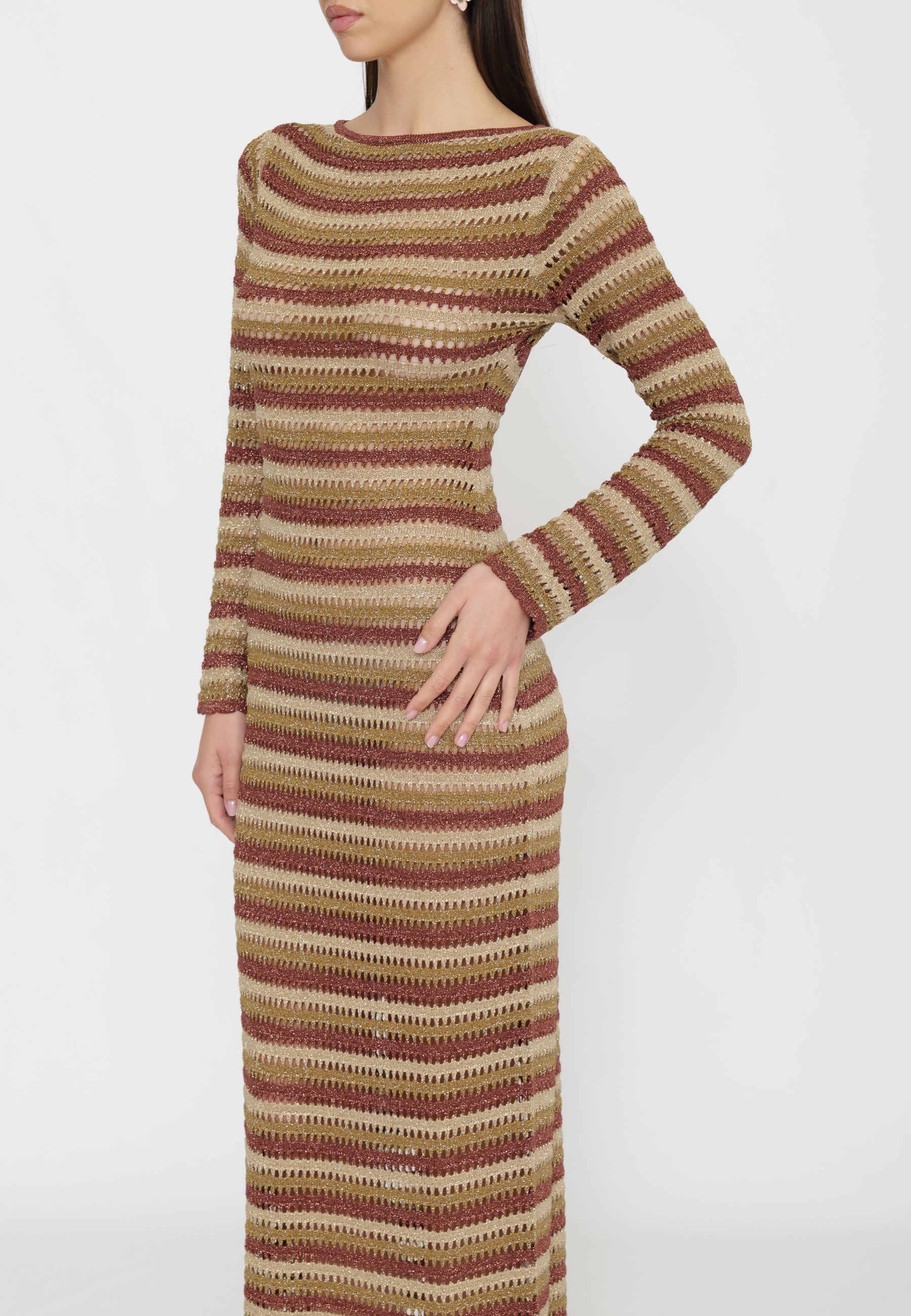 Abito lungo Robyn in tessuto crochet con fantasia a righe che crea una struttura grafica definita e regolare. Scollo a barchetta e maniche lunghe leggermente svasate per un'eleganza sofisticata. La silhouette aderente su busto e fianchi si apre in una gonna dalla linea dritta, mentre l'apertura ovale sulla schiena aggiunge un dettaglio distintivo e affascinante. Comfort e stile in un unico capo versatile.