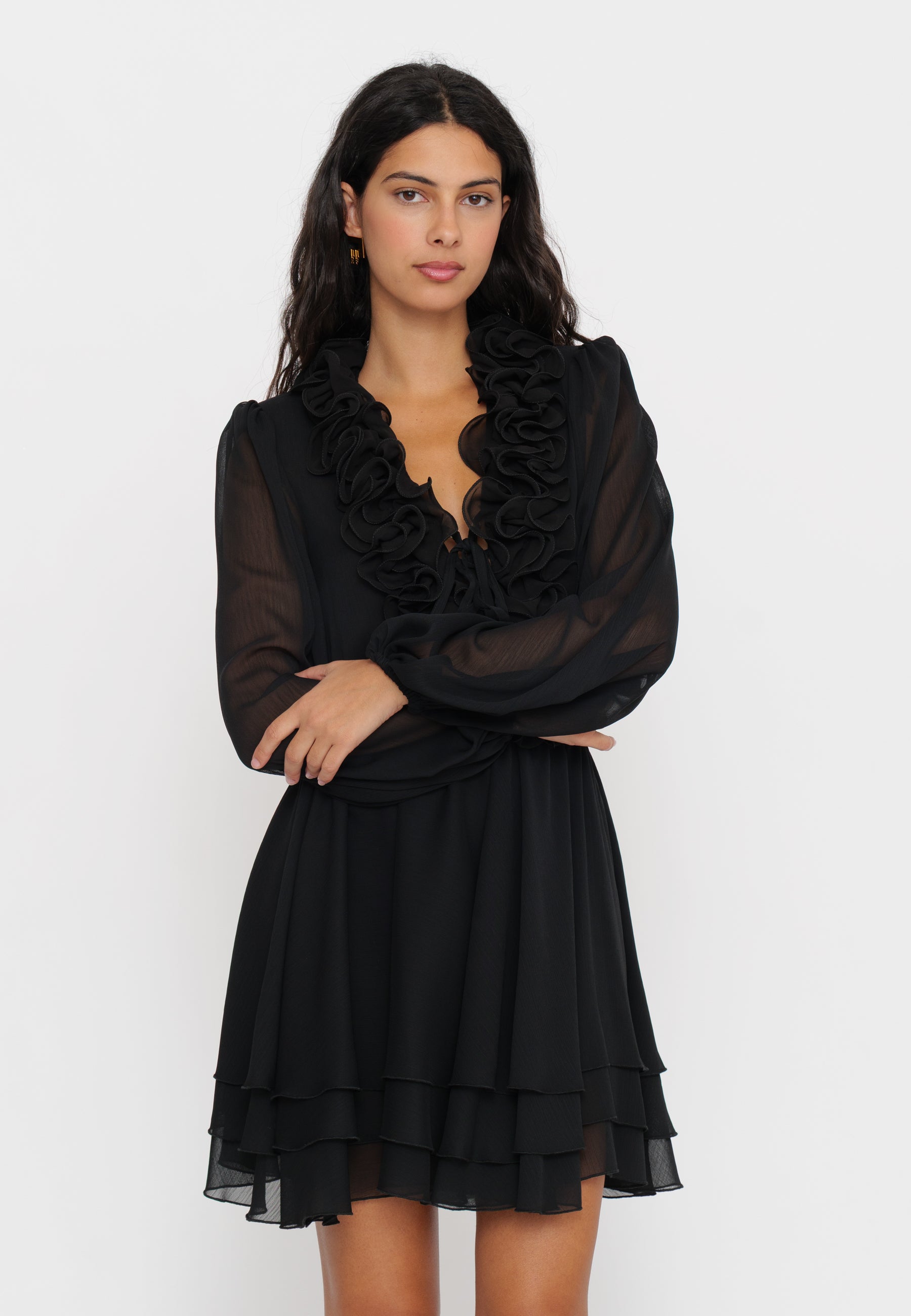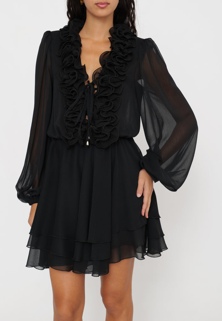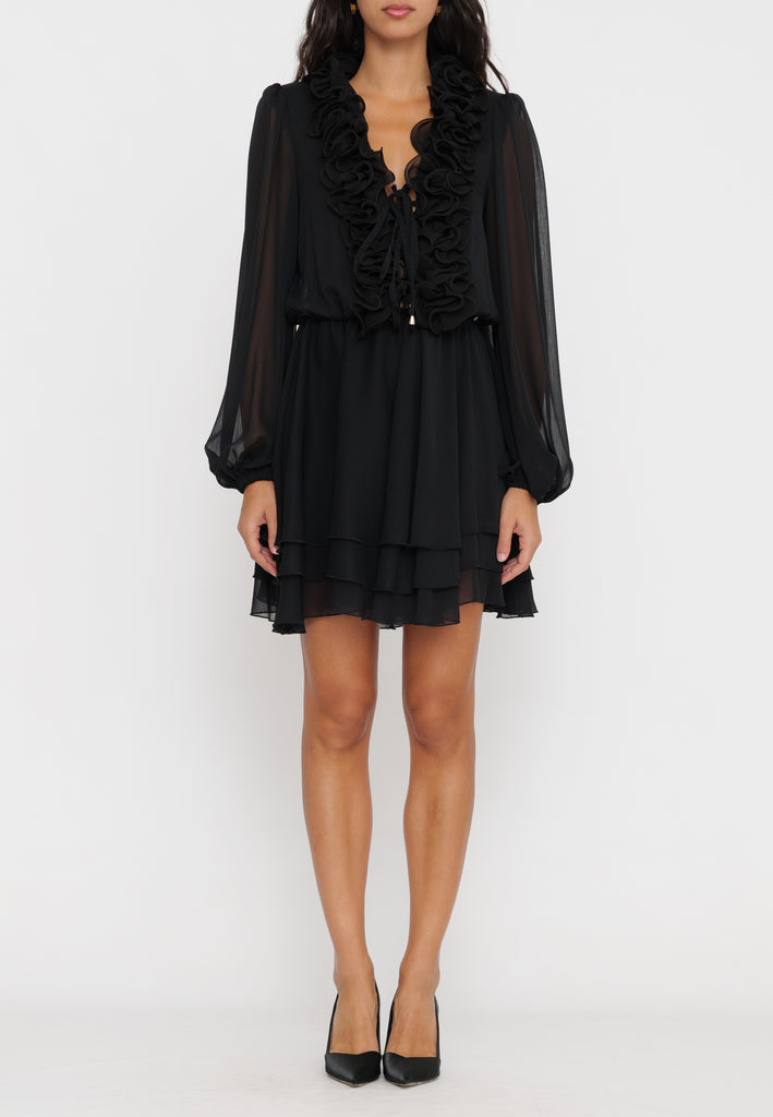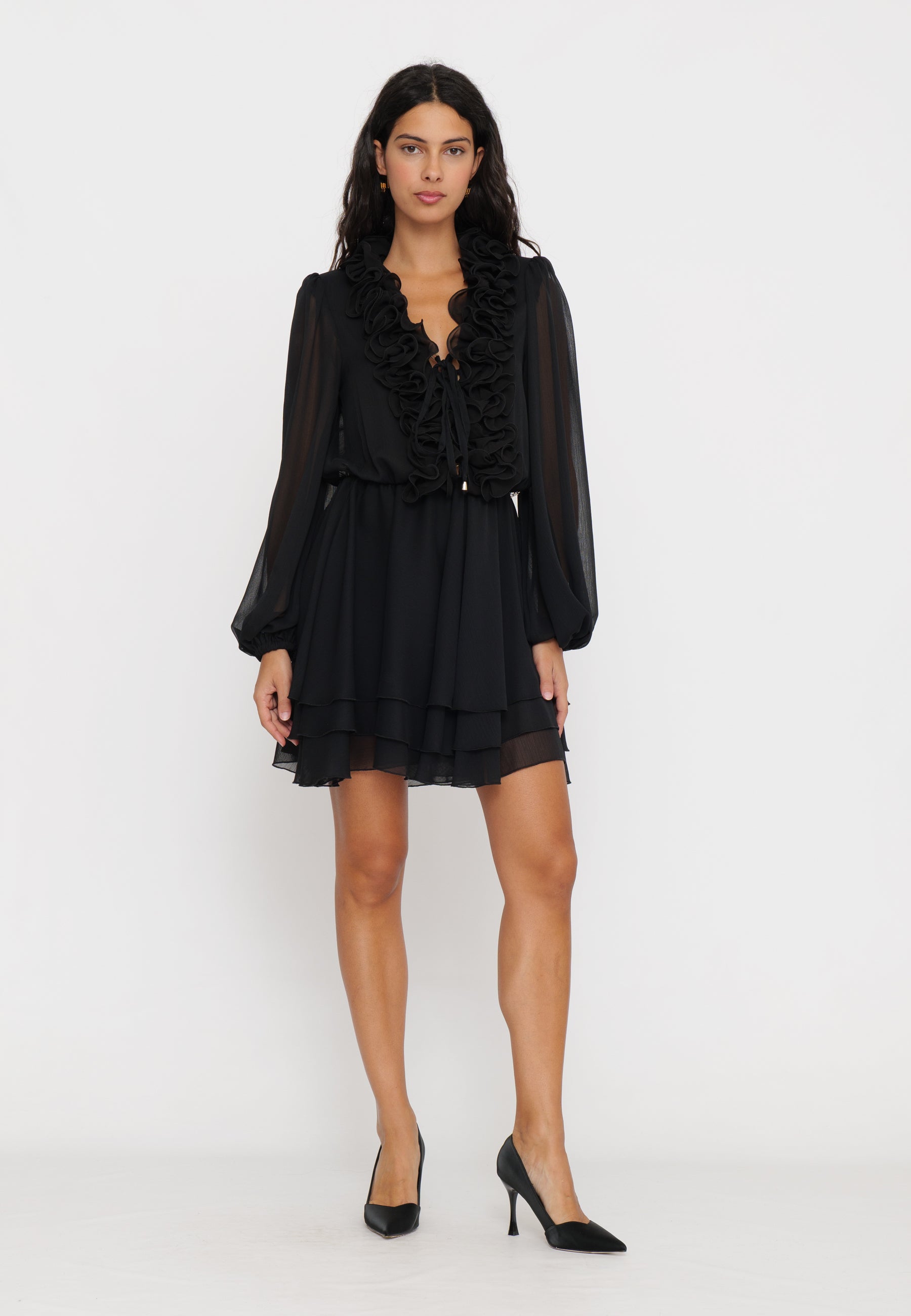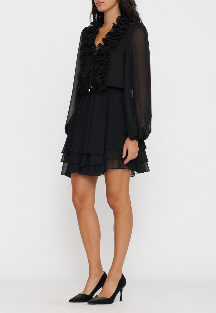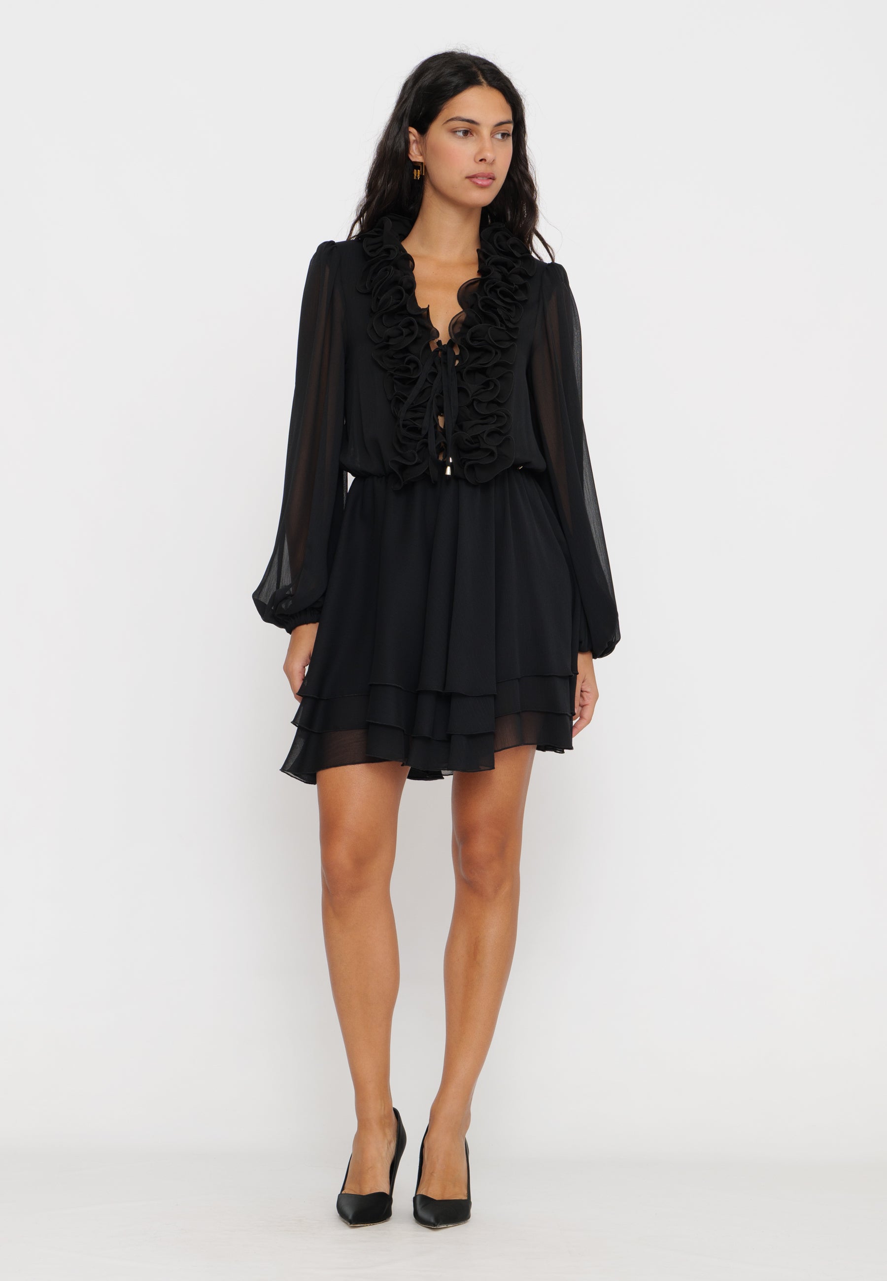Abito mini con rouches che combina un design femminile e raffinato. Le rouches aggiungono movimento e volume, esaltando la silhouette con un tocco di eleganza moderna. Perfetto per occasioni speciali o per un look sofisticato in città, questo capo si distingue per la sua versatilità e lo stile contemporaneo.