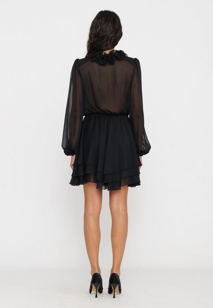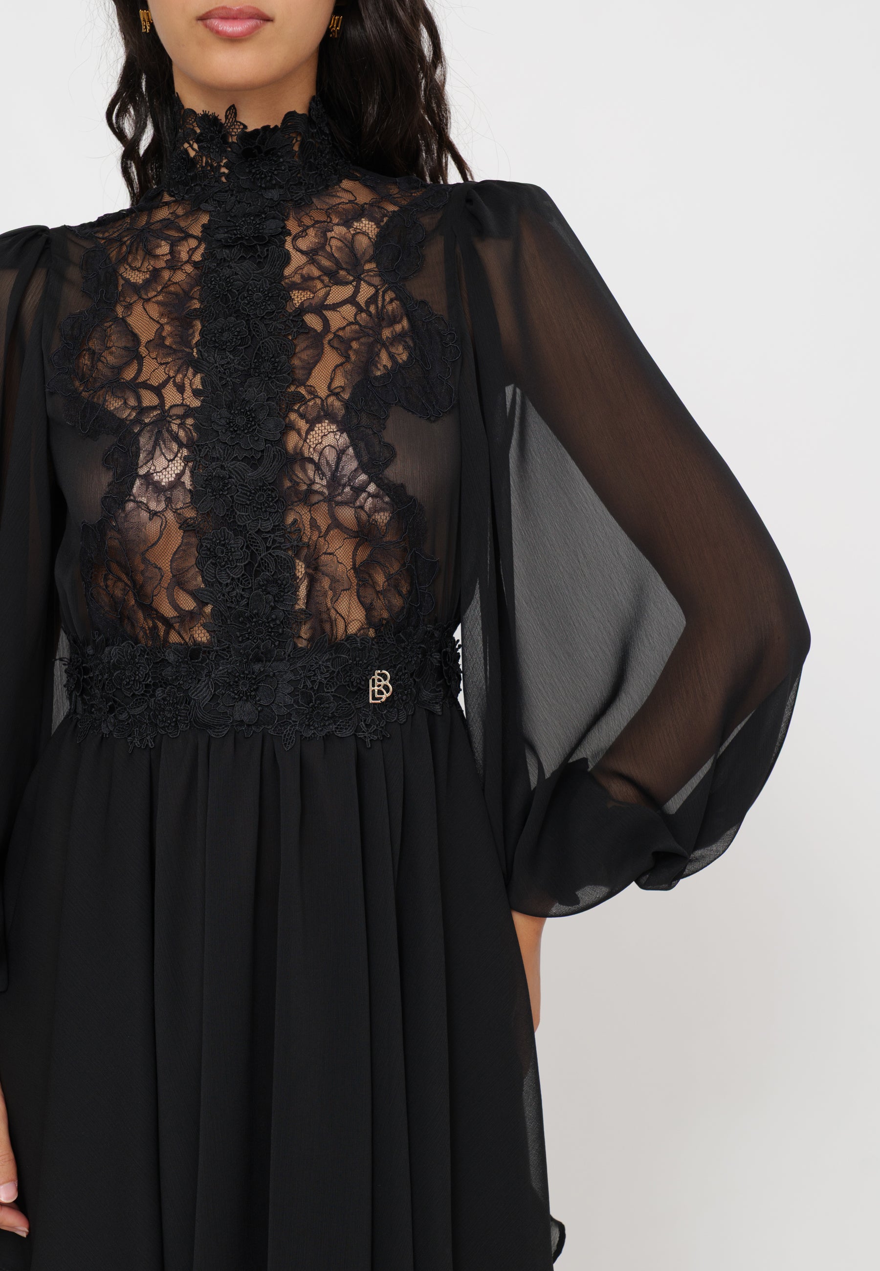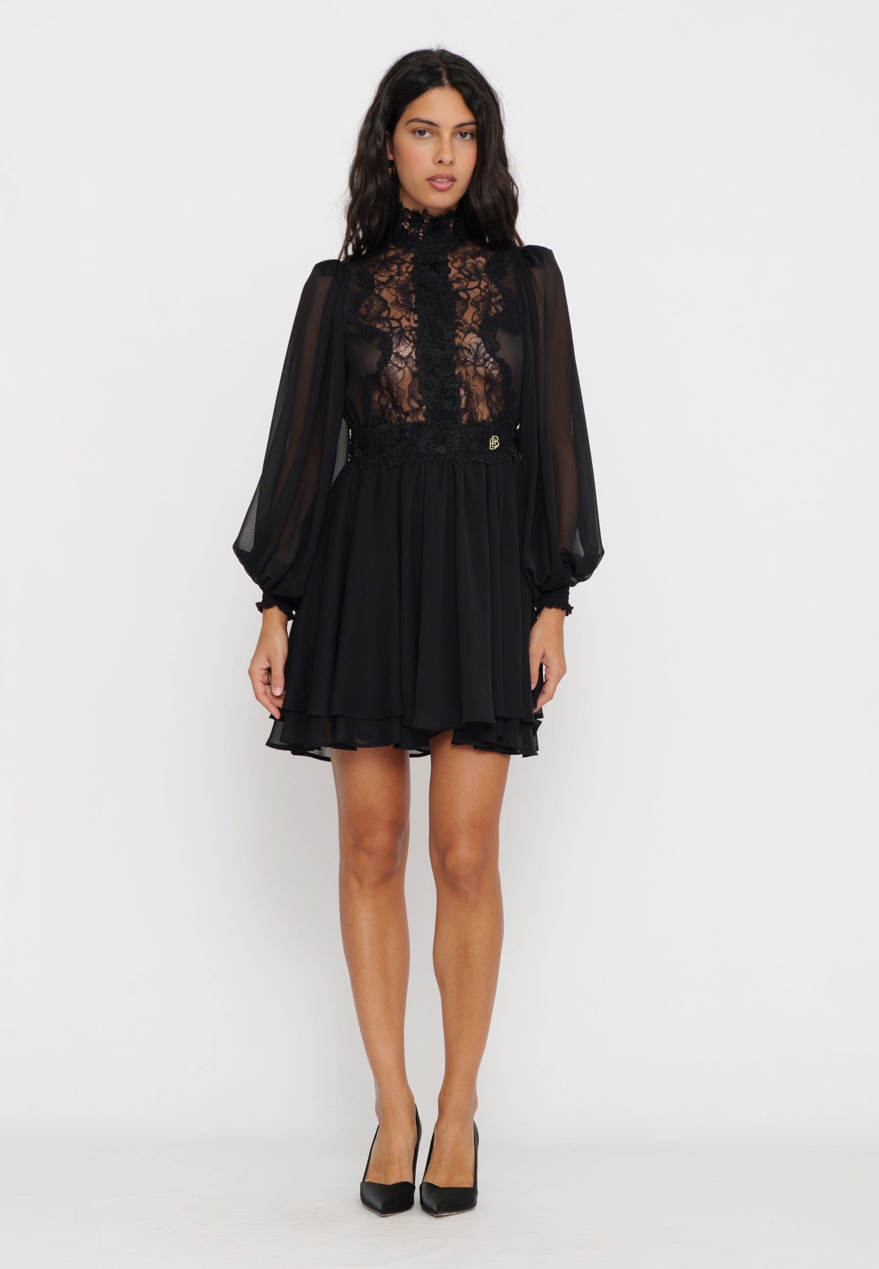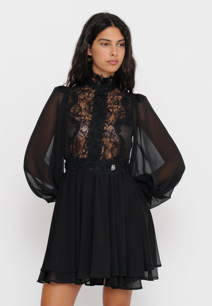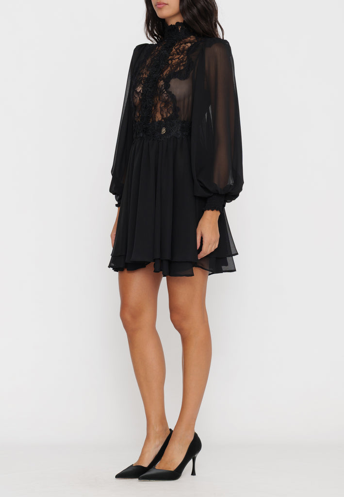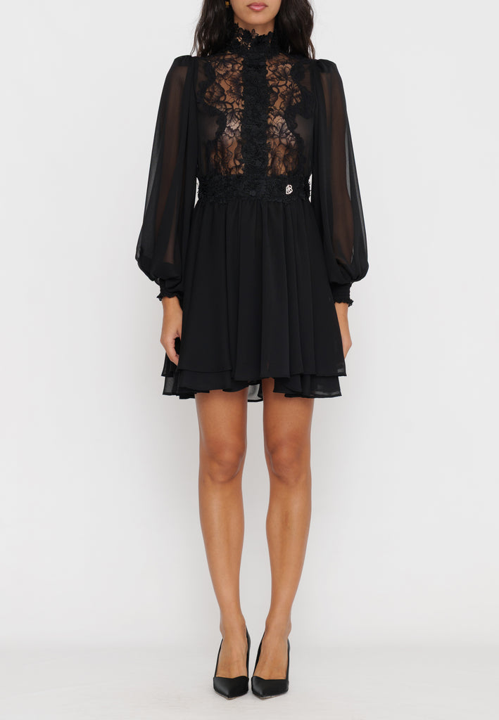 Abito mini che combina l’eleganza del pizzo con la leggerezza delle maniche in chiffon, creando un equilibrio perfetto tra raffinatezza e comfort. Il design corto valorizza la silhouette, mentre i dettagli in pizzo aggiungono un tocco sofisticato ideale per occasioni speciali. Le maniche in chiffon assicurano una vestibilità fluida e traspirante, rendendo il capo adatto a diverse situazioni formali con uno stile ricercato e contemporaneo.