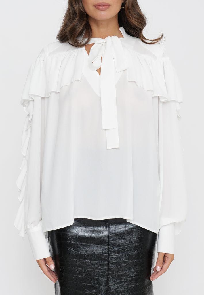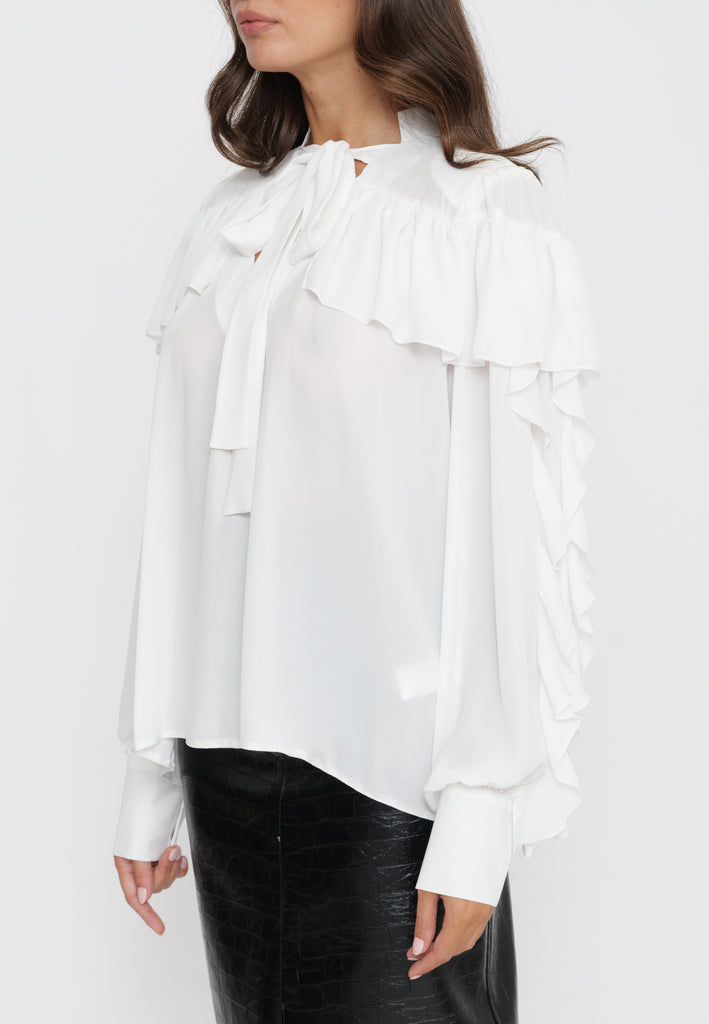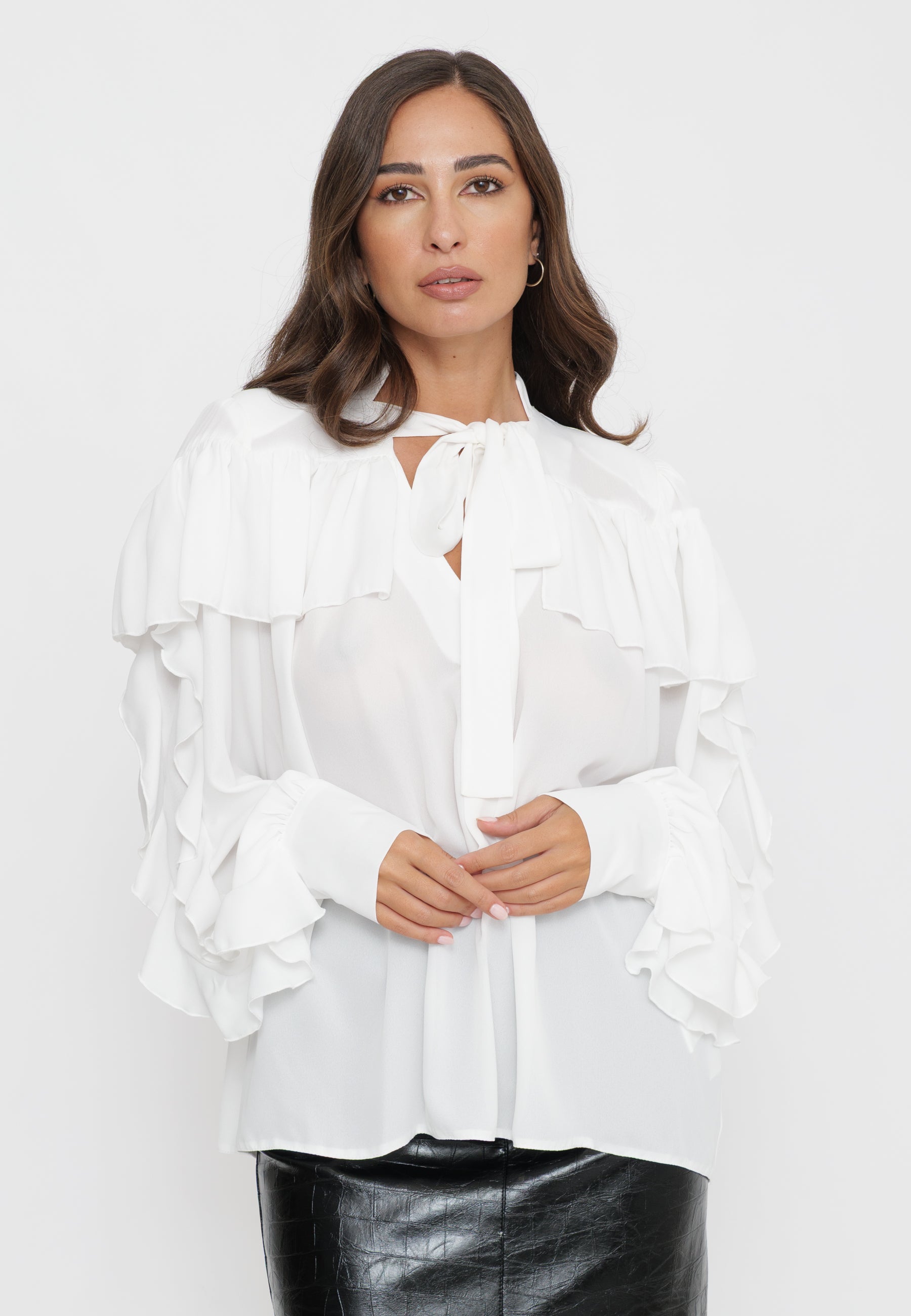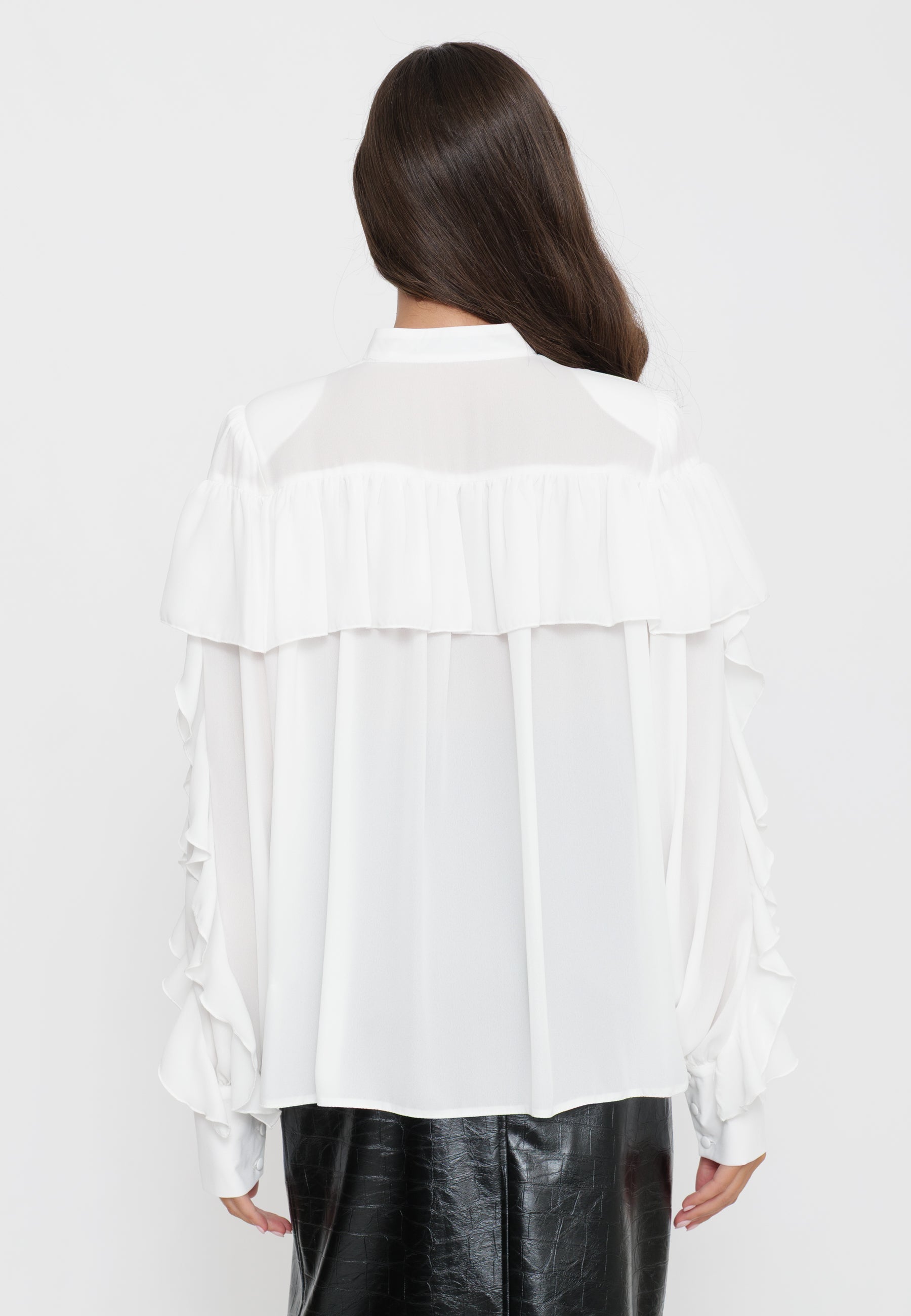 Questa camicia con rouches unisce eleganza e femminilità attraverso dettagli raffinati. Le rouches aggiungono un tocco di carattere, rendendo questo capo versatile per occasioni formali e casual chic.