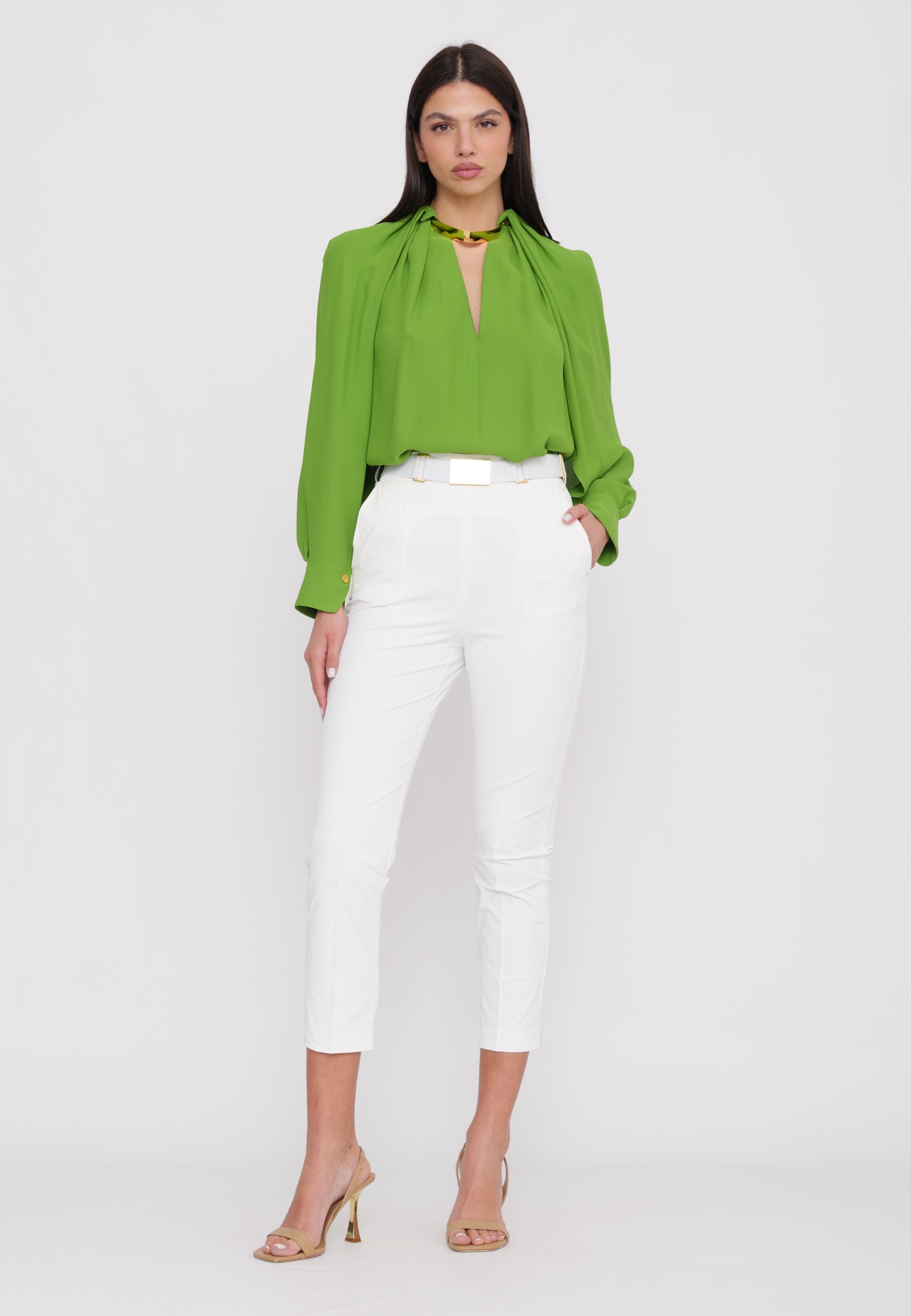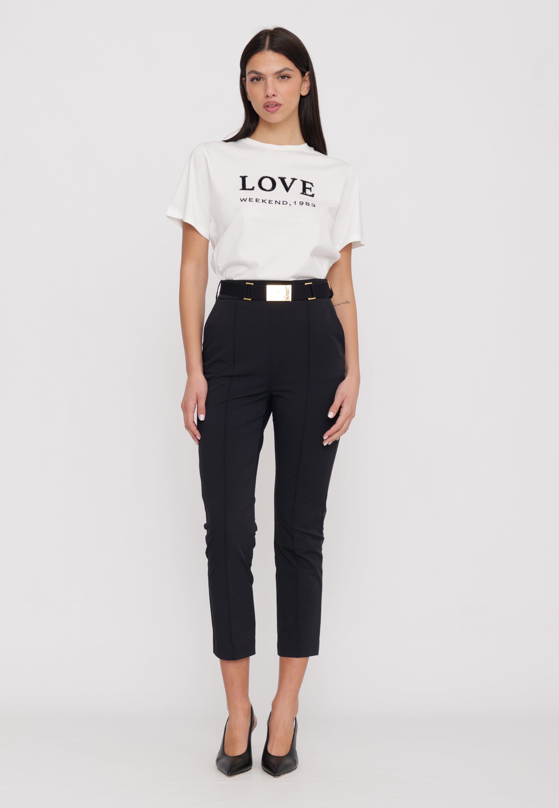 Pantaloni in tessuto tecnico bielastico che unisce comfort e eleganza. La silhouette aderente è definita da cuciture strategiche sul davanti e sul retro, mentre le tasche alla francese garantiscono praticità. La cintura, elemento chiave del design, è valorizzata dalla placca con logo a laser che cattura la luce. Ogni dettaglio è stato curato per esaltare il punto vita e creare una vestibilità impeccabile.