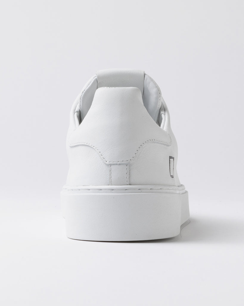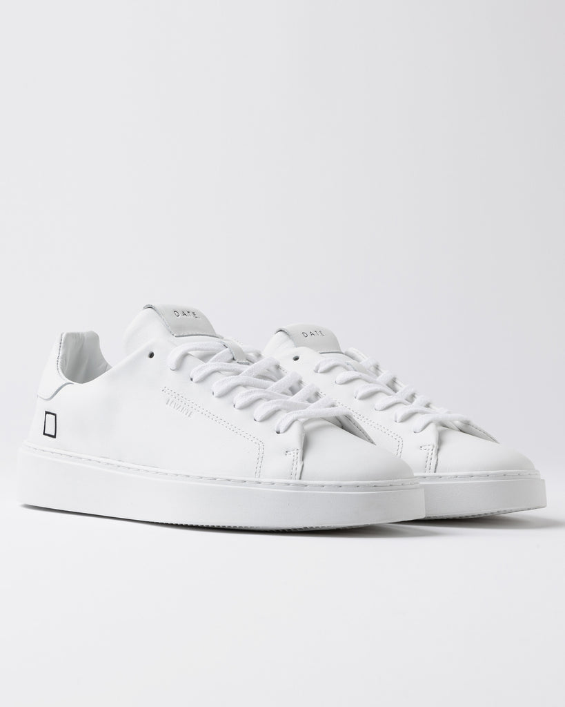 Sneakers bassa in pelle colore bianco. Sulla linguetta in pelle è cucita la label con scritta D.A.T.E. impressa. Il nome del modello e il logo quadrato sono impressi lateralmente, lacci in cotone. La suola in gomma cucita è alta 2.5 - 4 cm mentre la soletta interna è rialzata di 2.5 cm.