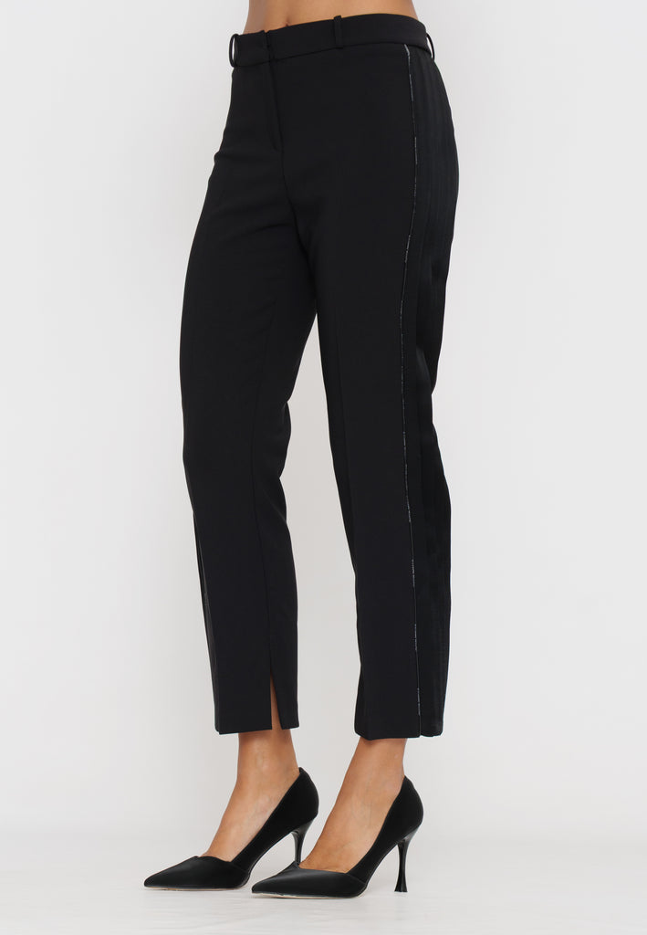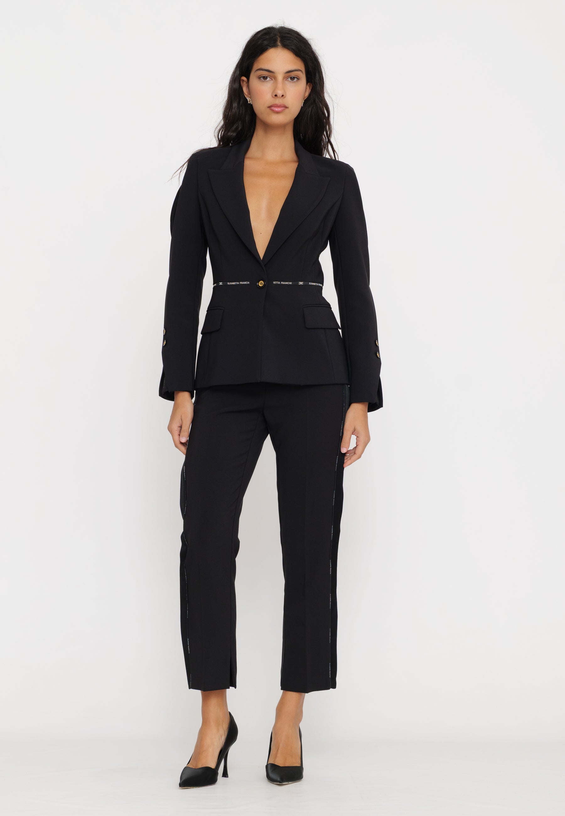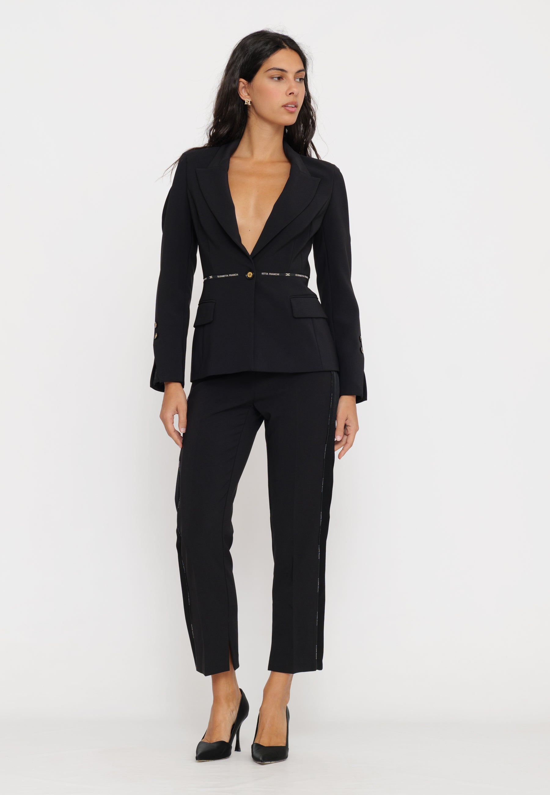 Questi pantaloni in crepe, firmati Elisabetta Franchi, combinano eleganza e artigianalità con dettagli smoking e piping logato. La vestibilità studiata valorizza la silhouette, mentre i materiali di qualità assicurano comfort e resistenza. Perfetti per un look sofisticato e distintivo in occasioni formali o serate esclusive.