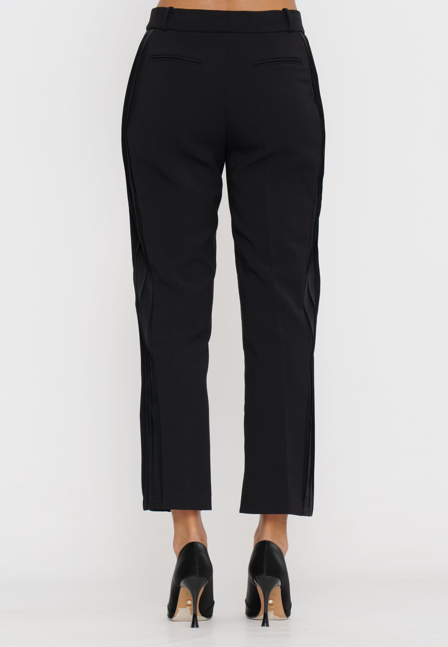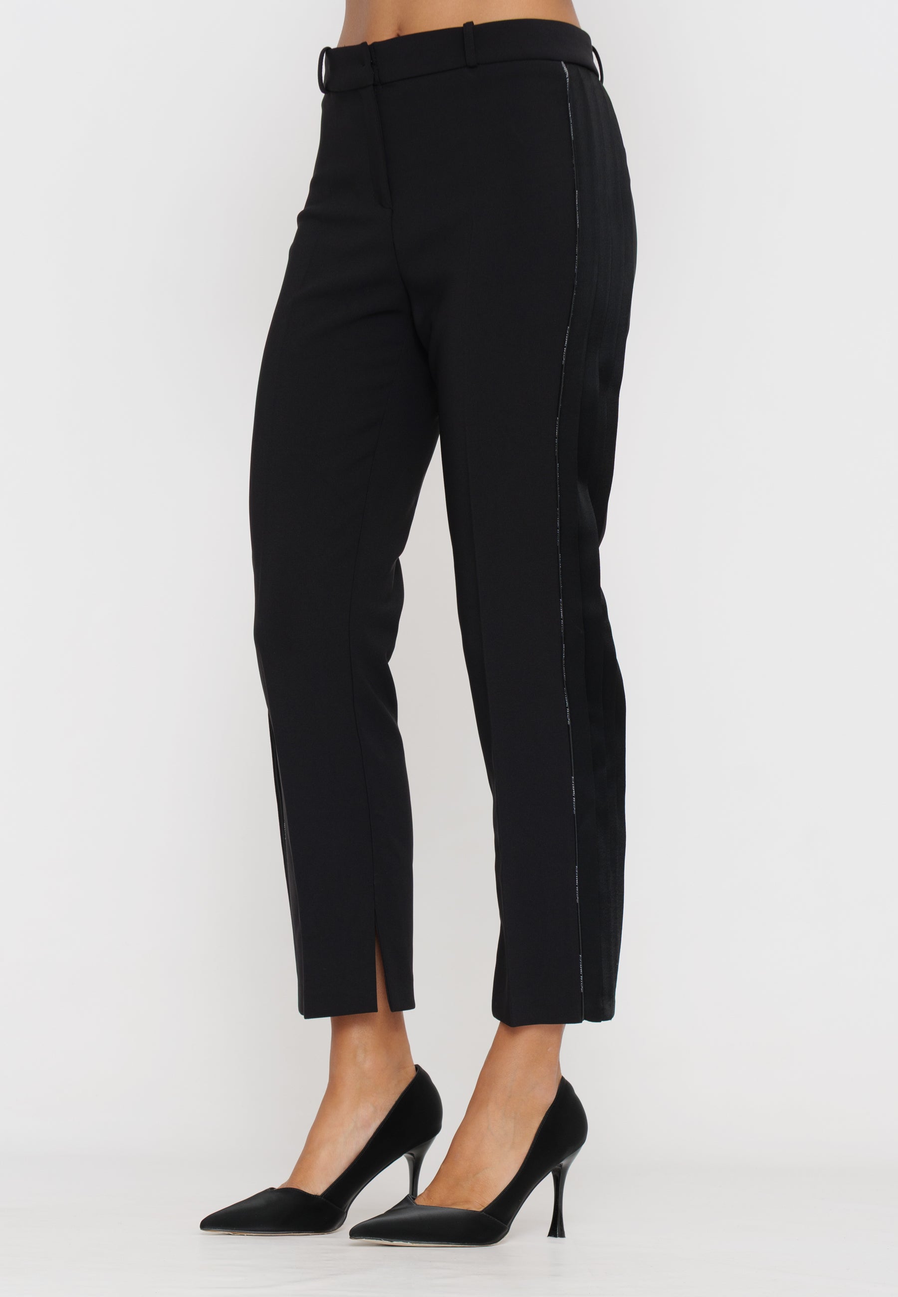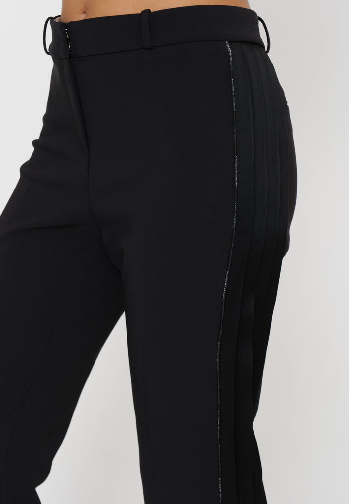 Questi pantaloni in crepe, firmati Elisabetta Franchi, combinano eleganza e artigianalità con dettagli smoking e piping logato. La vestibilità studiata valorizza la silhouette, mentre i materiali di qualità assicurano comfort e resistenza. Perfetti per un look sofisticato e distintivo in occasioni formali o serate esclusive.