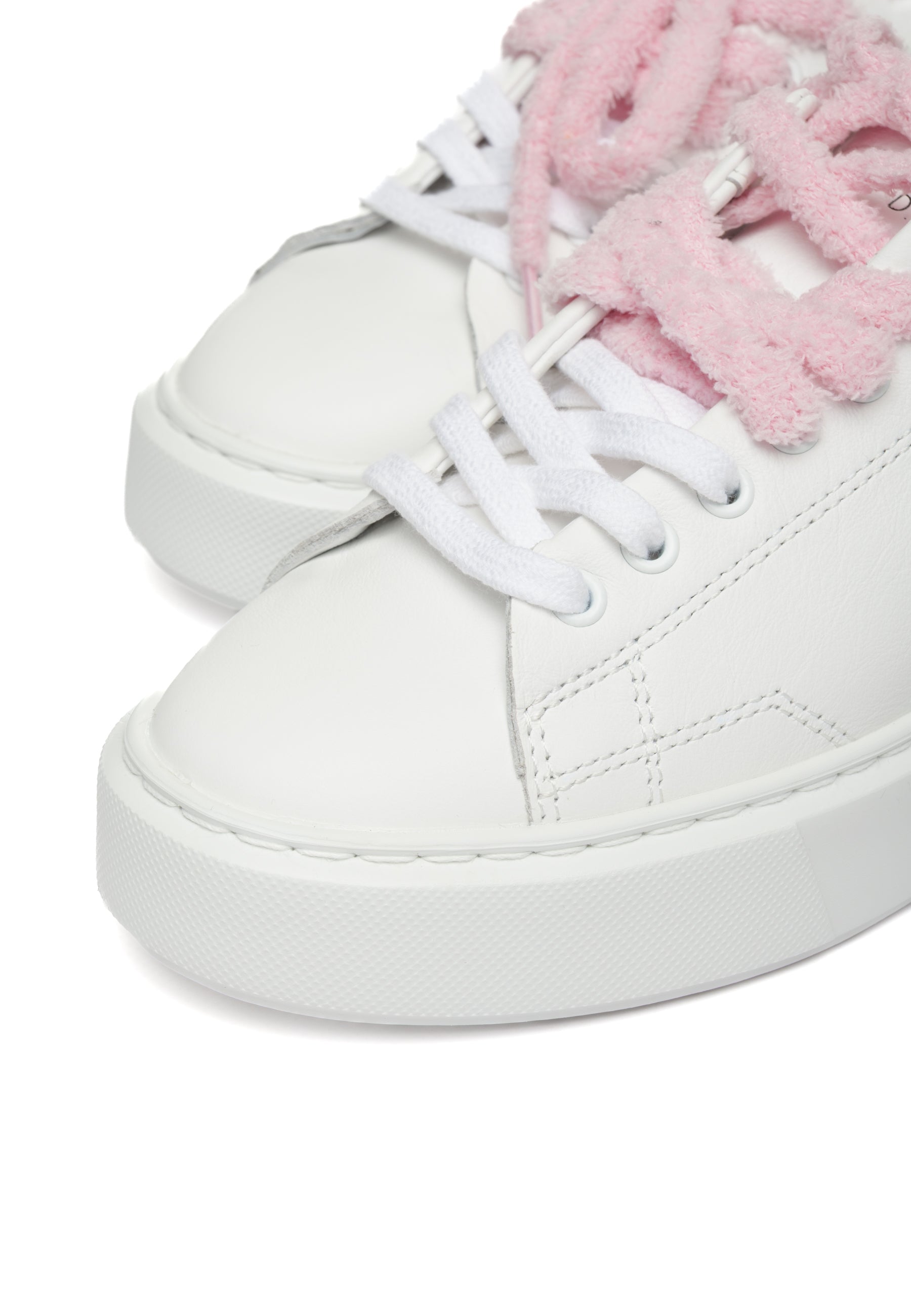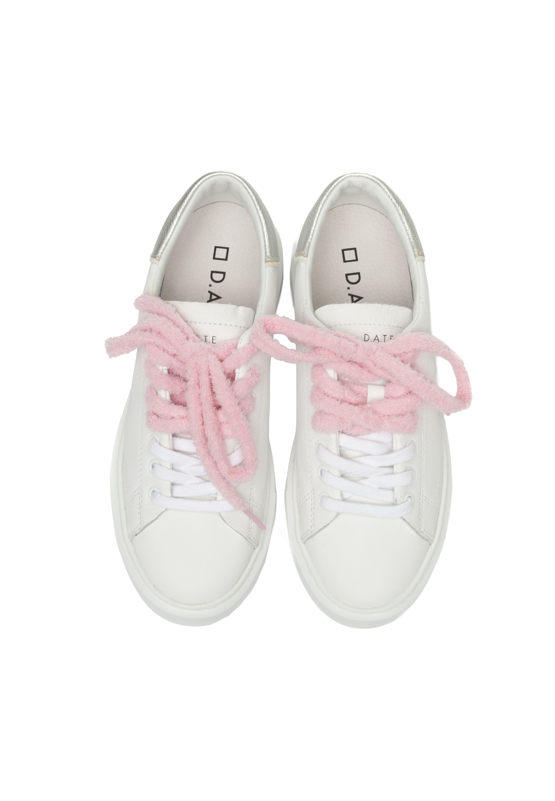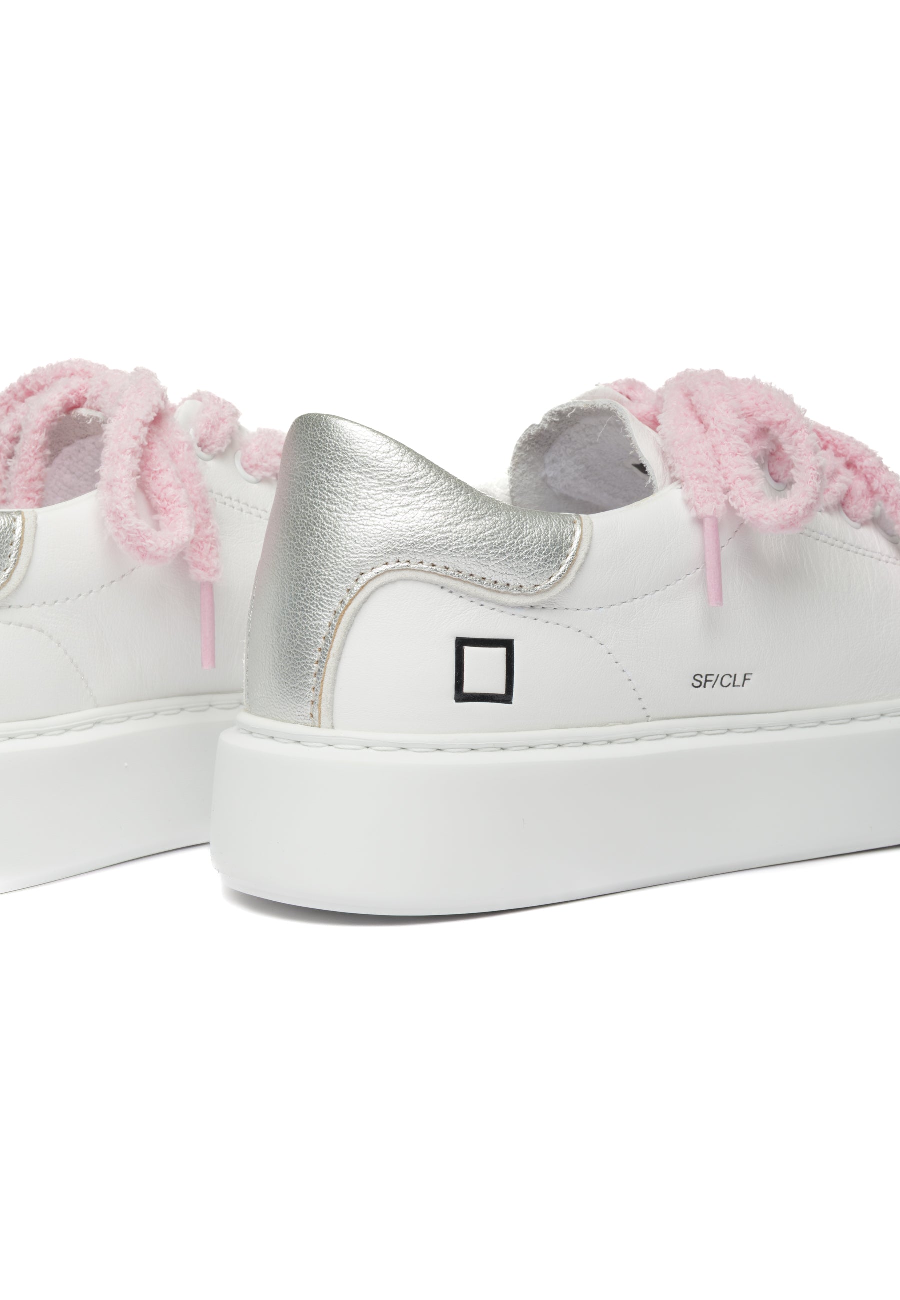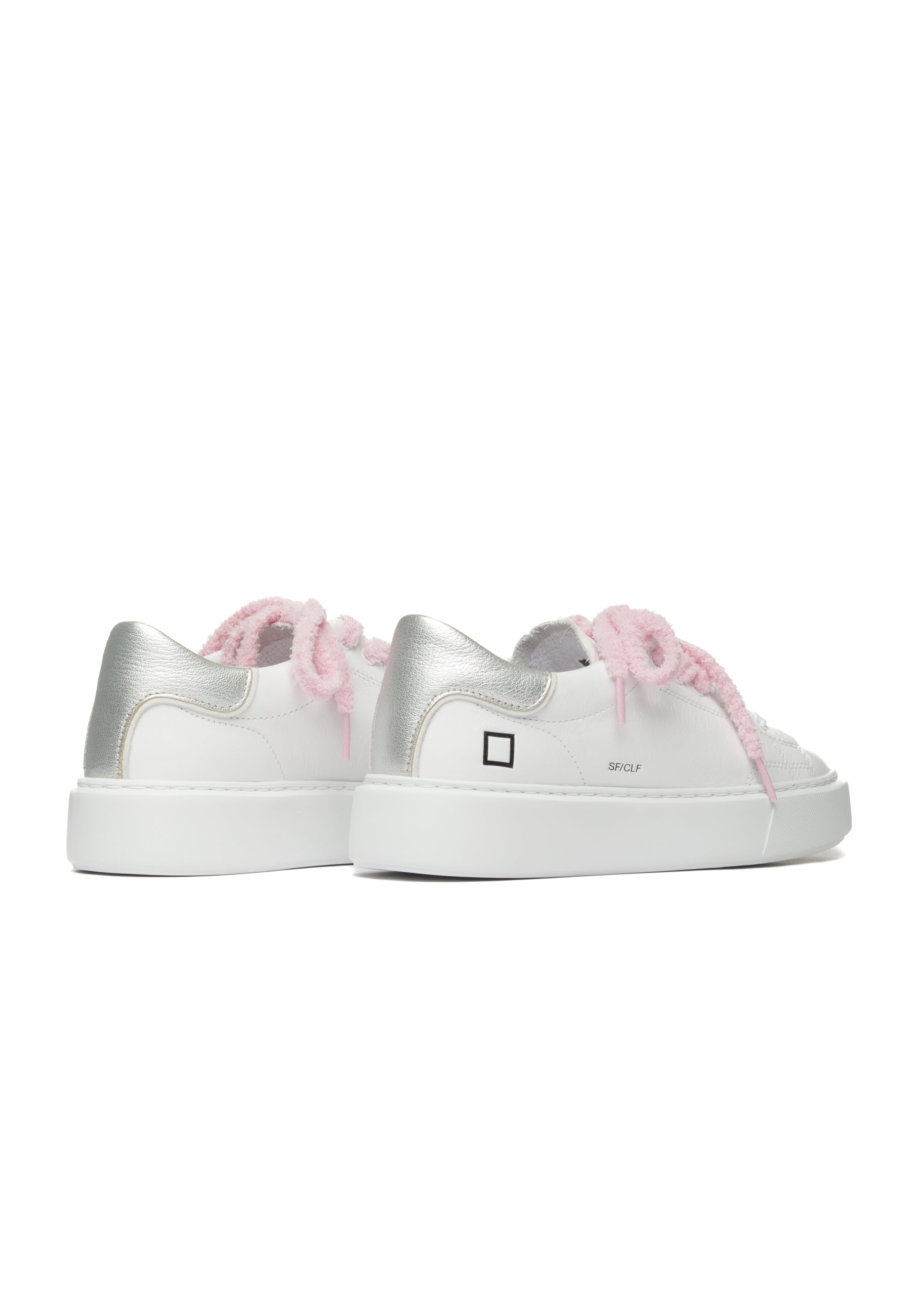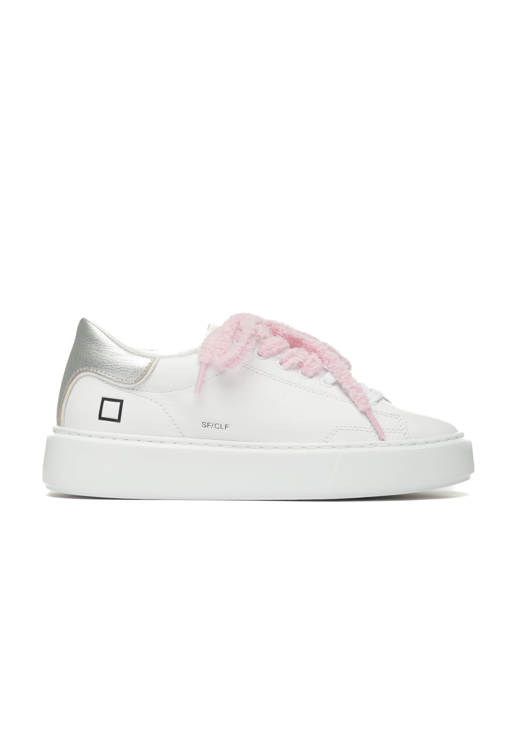 Sneakers in pelle bianca con design minimalista e dettagli ricercati. La linguetta presenta l'iconica scritta D.A.T.E., mentre il lato esterno sfoggia il logo quadrato e il nome del modello. I lacci in cotone e spugna combinano due texture e colori differenti per un tocco di originalità. Il talloncino in pelle laminata argento con profilo in camoscio bianco aggiunge eleganza, mentre la fodera in pelle e spugna di cotone garantisce morbidezza. La soletta interna rialzata di 2,5 cm assicura comfort superiore durante la giornata. La suola extralight cucita, alta 3-4 cm, offre leggerezza senza compromessi sulla stabilità. Vestibilità regular. Realizzate interamente con materiali selezionati Made in Italy.