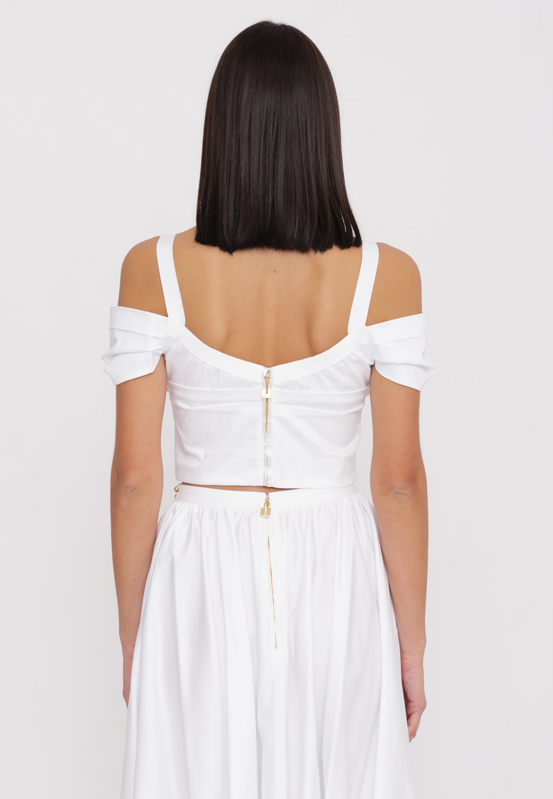 Top in puro cotone con maniche corte e spalline sottili che garantiscono una vestibilità aderente e raffinata. Lo scollo è impreziosito da una collana amovibile in metallo, un dettaglio luminoso che aggiunge eleganza e versatilità al capo. Perfetto per creare look sofisticati sia in versione casual che più formale, grazie alla sua costruzione di qualità e alla silhouette essenziale che valorizza la figura.