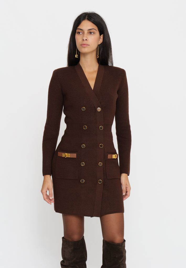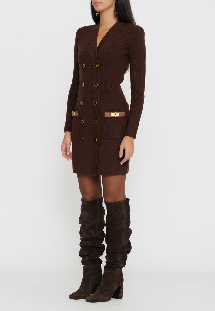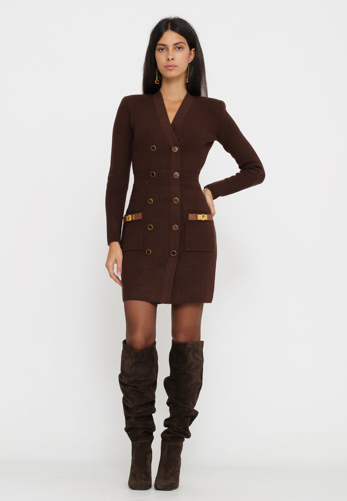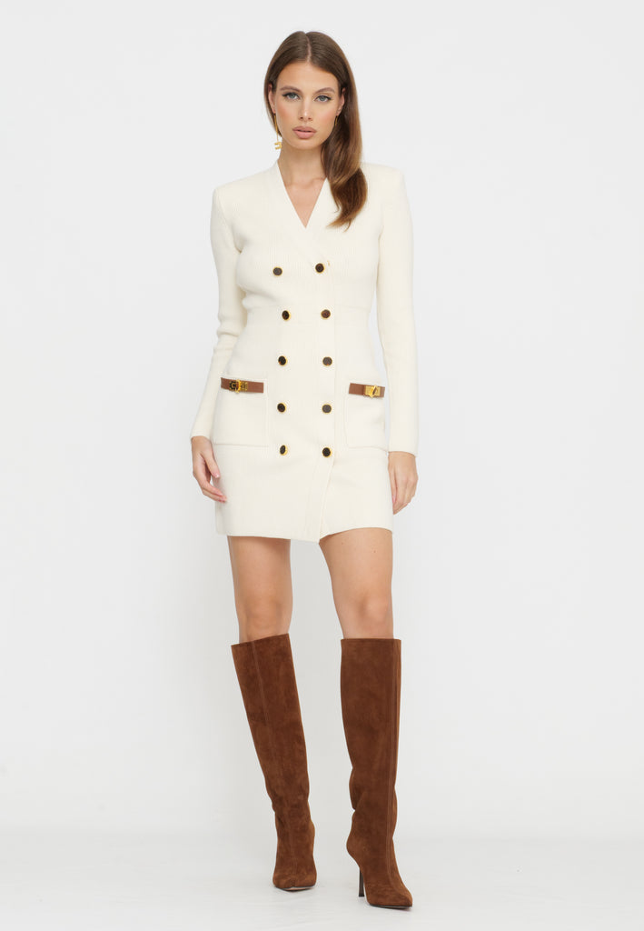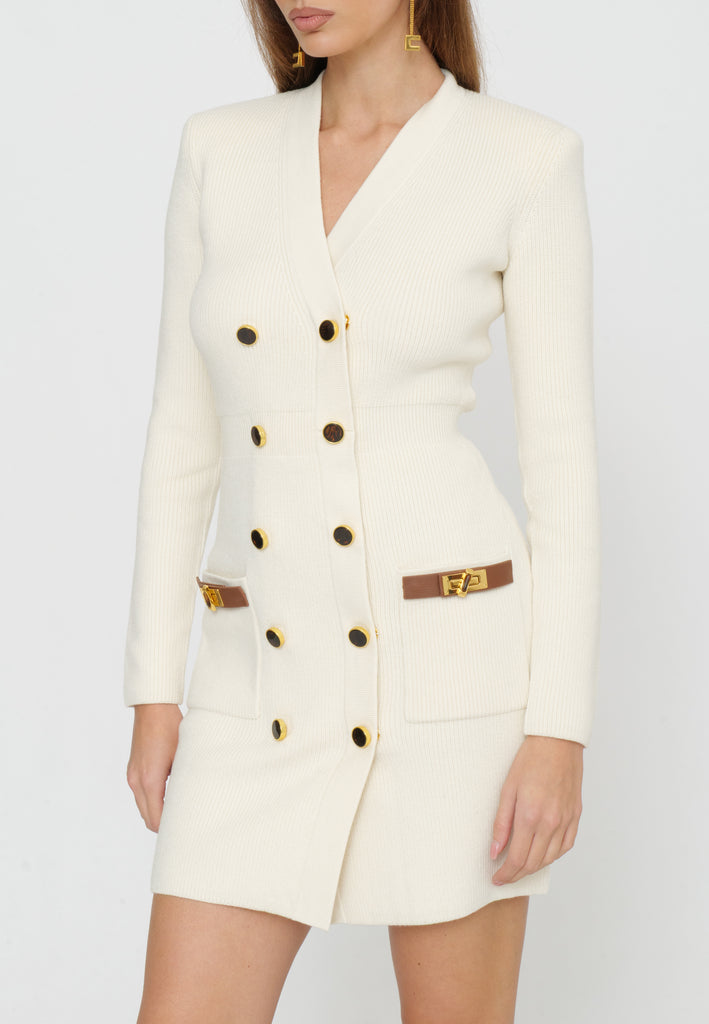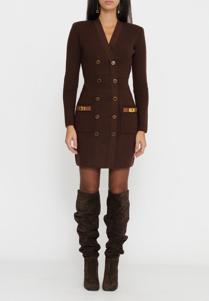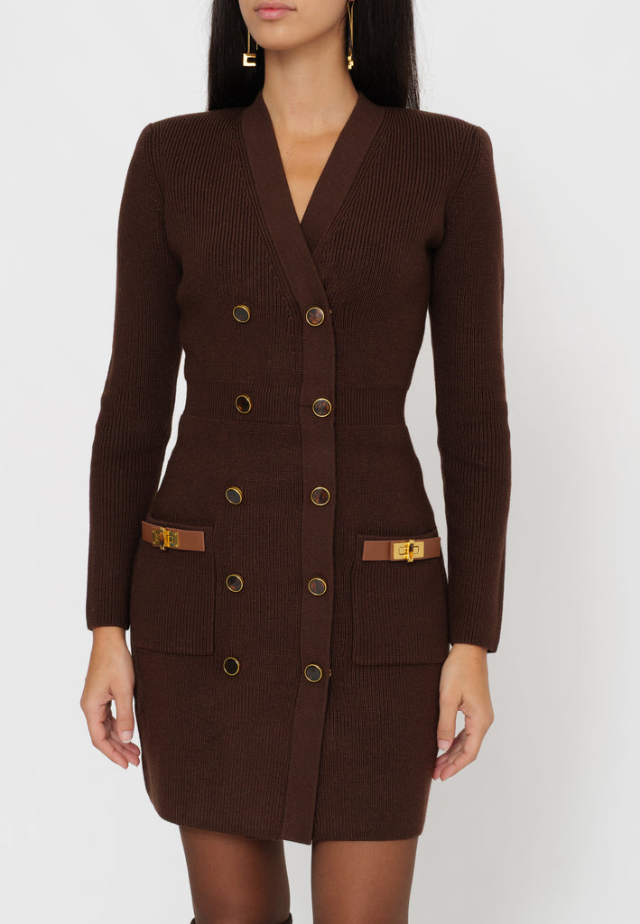 Questo mini abito in maglia presenta una vestibilità aderente e una trama ricca che avvolge delicatamente la figura. Le spalle strutturate e il doppio petto sottolineano un design sofisticato, mentre le tasche sono arricchite da cinturini con girelli metallici dorati che donano un tocco elegante. I bottoni dalle sfumature ambrate completano l’insieme, rendendo questo capo un perfetto connubio di stile e raffinatezza.