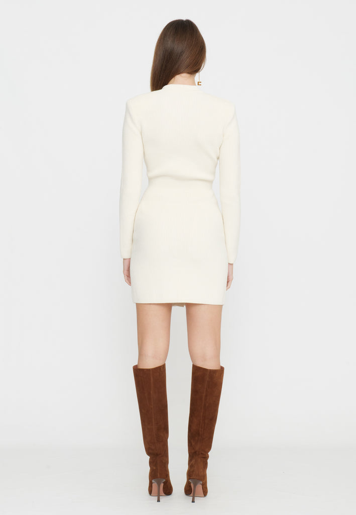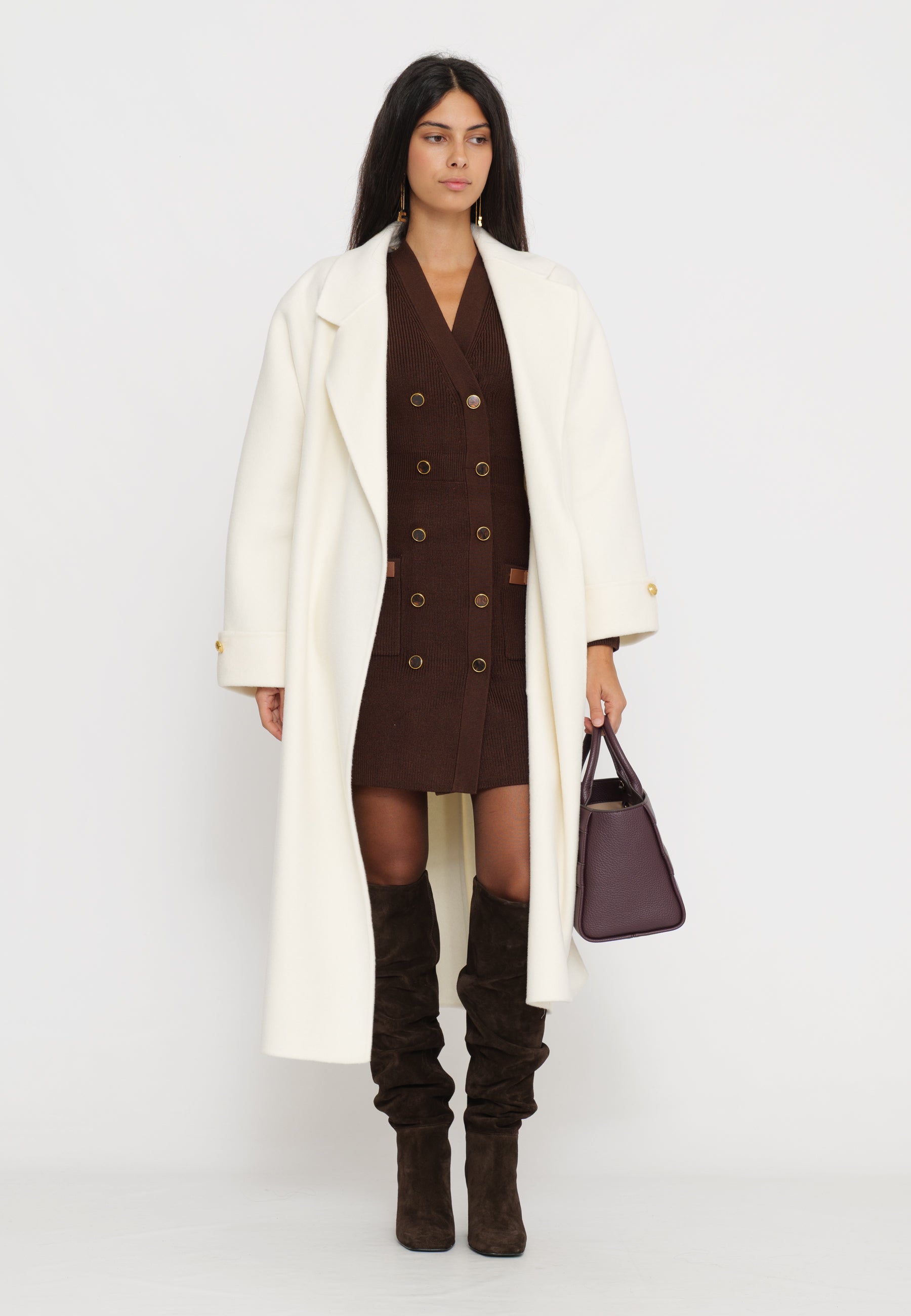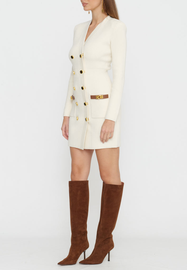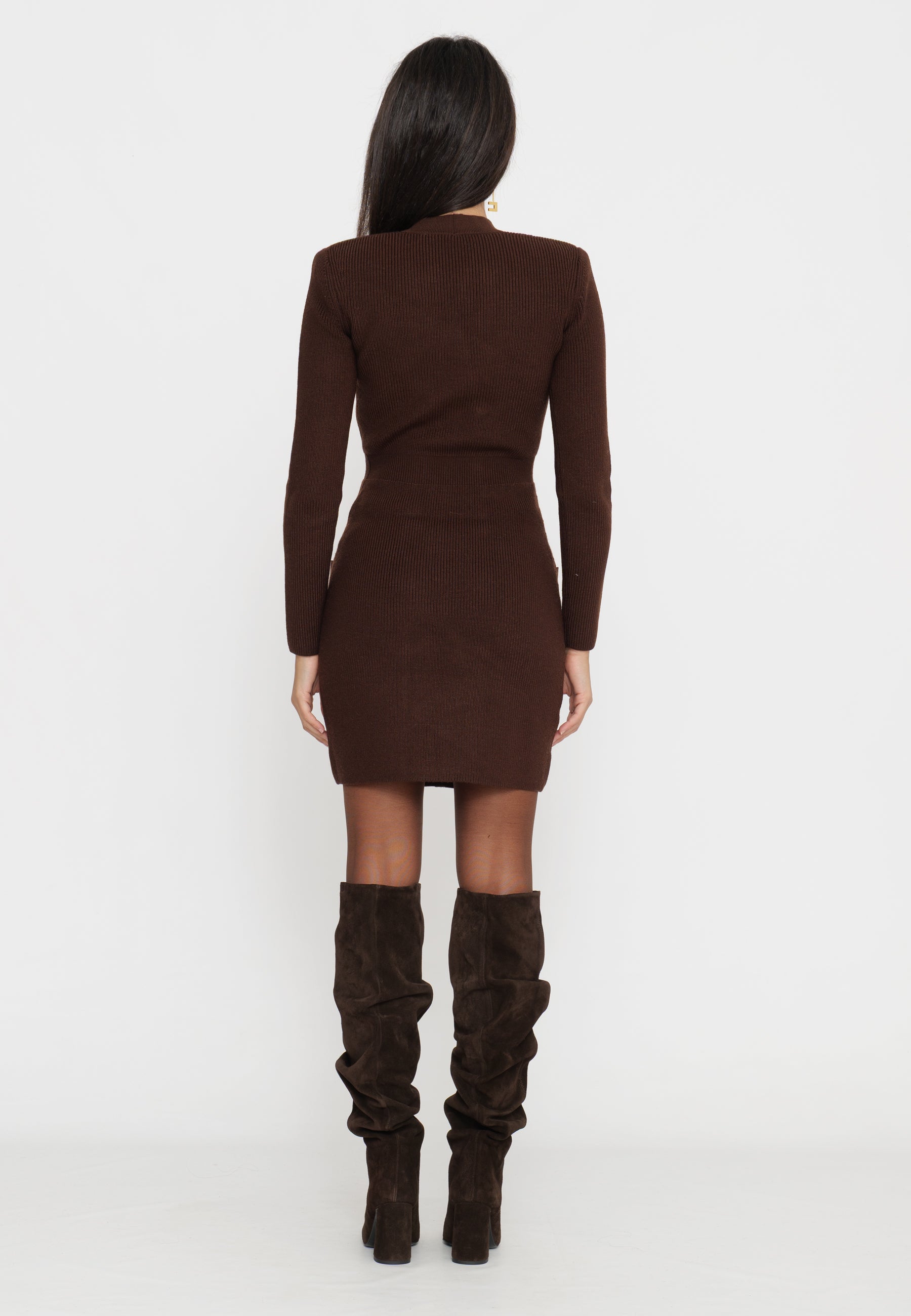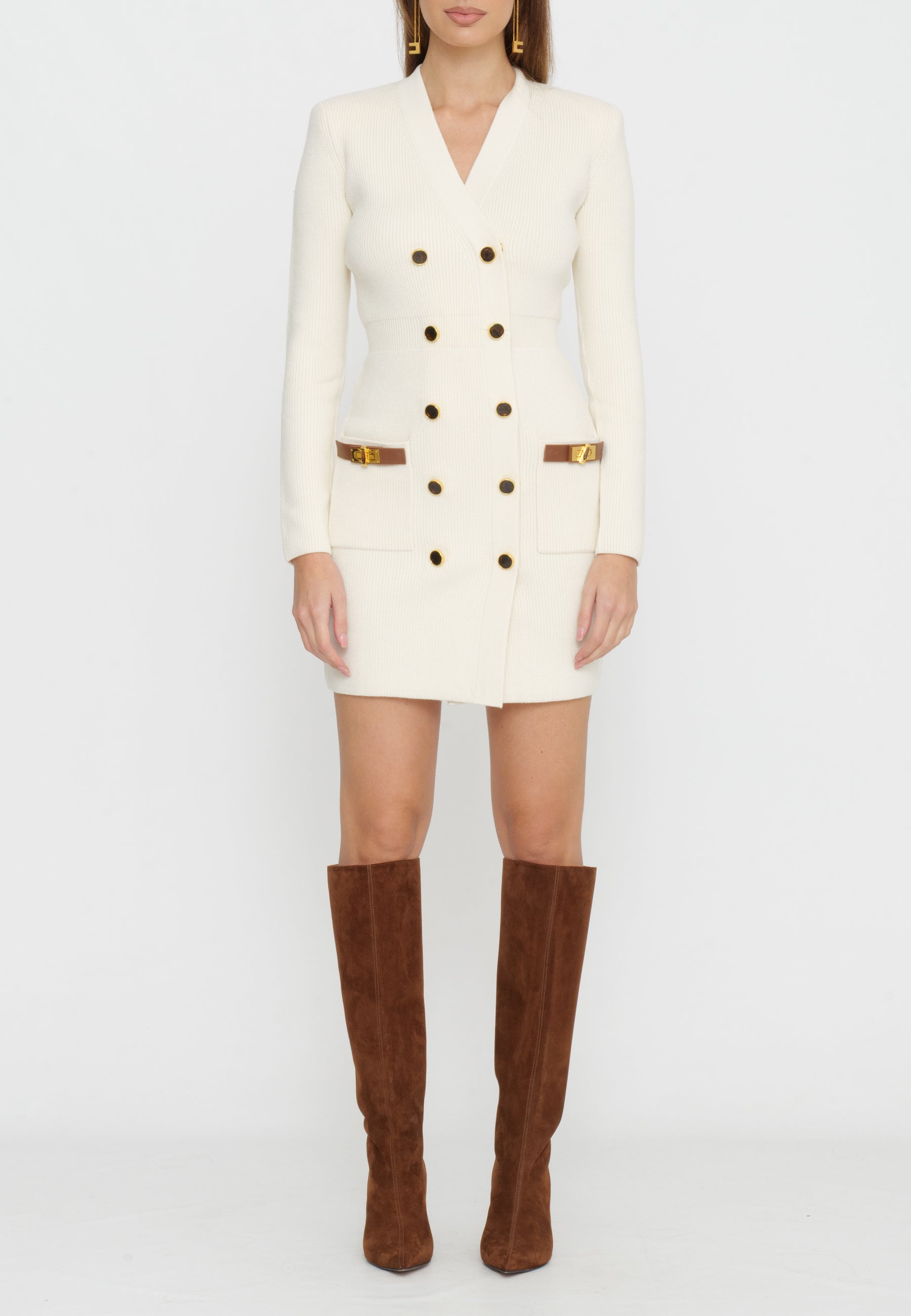 Questo mini abito in maglia presenta una vestibilità aderente e una trama ricca che avvolge delicatamente la figura. Le spalle strutturate e il doppio petto sottolineano un design sofisticato, mentre le tasche sono arricchite da cinturini con girelli metallici dorati che donano un tocco elegante. I bottoni dalle sfumature ambrate completano l’insieme, rendendo questo capo un perfetto connubio di stile e raffinatezza.