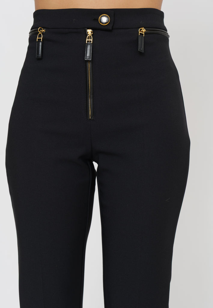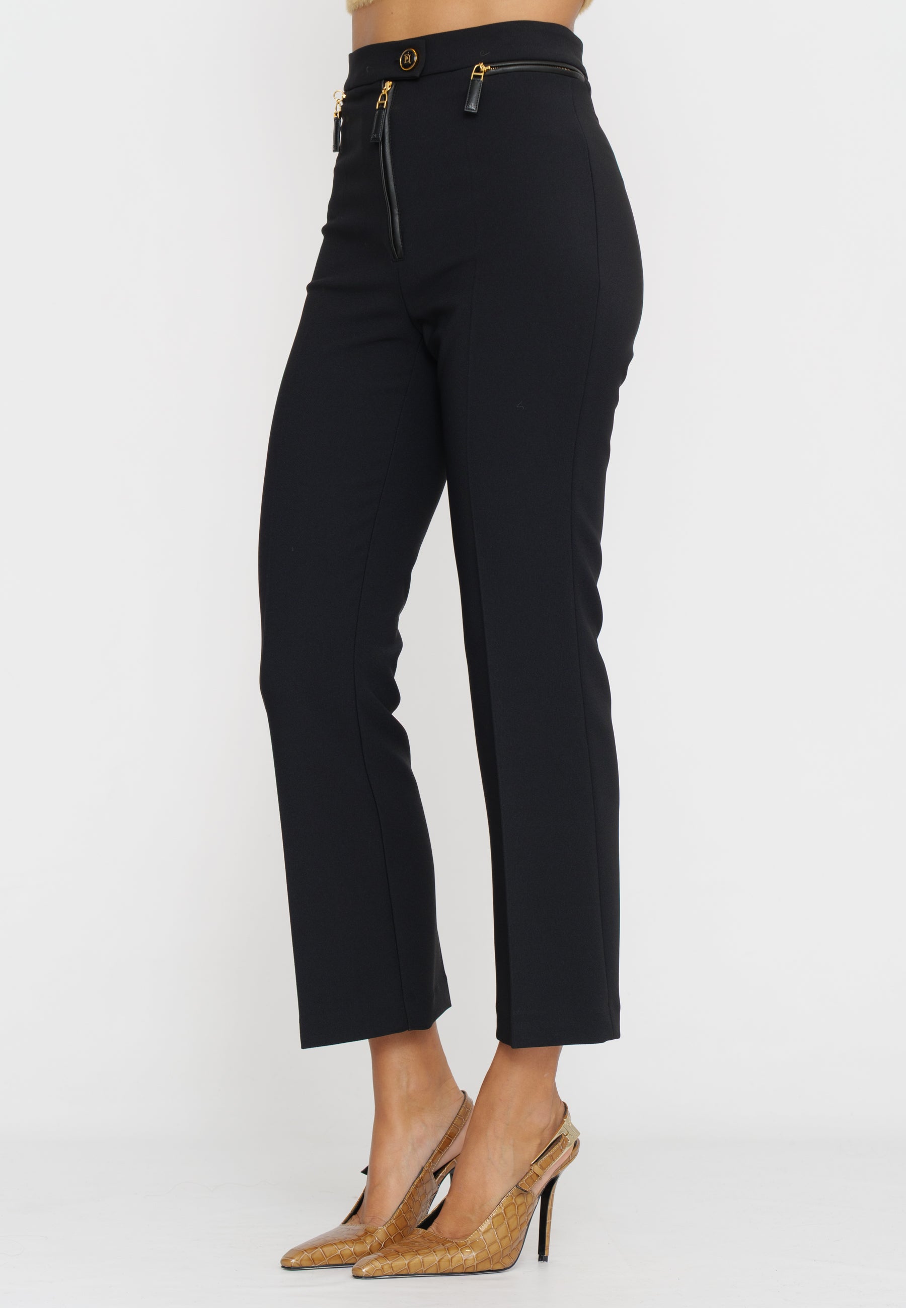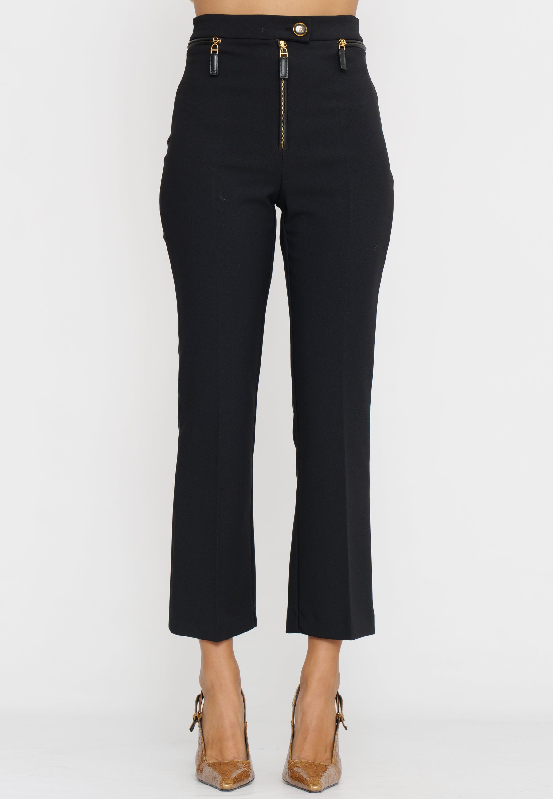 Pantaloni in doppio crêpe dalla silhouette aderente che definisce la figura con eleganza. Caratterizzati da zip frontali incorniciate da filetti tono su tono, questi pantaloni catturano l'attenzione con dettagli raffinati. Il bottone smaltato con logo Elisabetta Franchi aggiunge un elemento di lusso discreto. Parte della collezione Essential, rappresentano la scelta ideale per chi ricerca versatilità e qualità costruttiva nel proprio guardaroba contemporaneo.