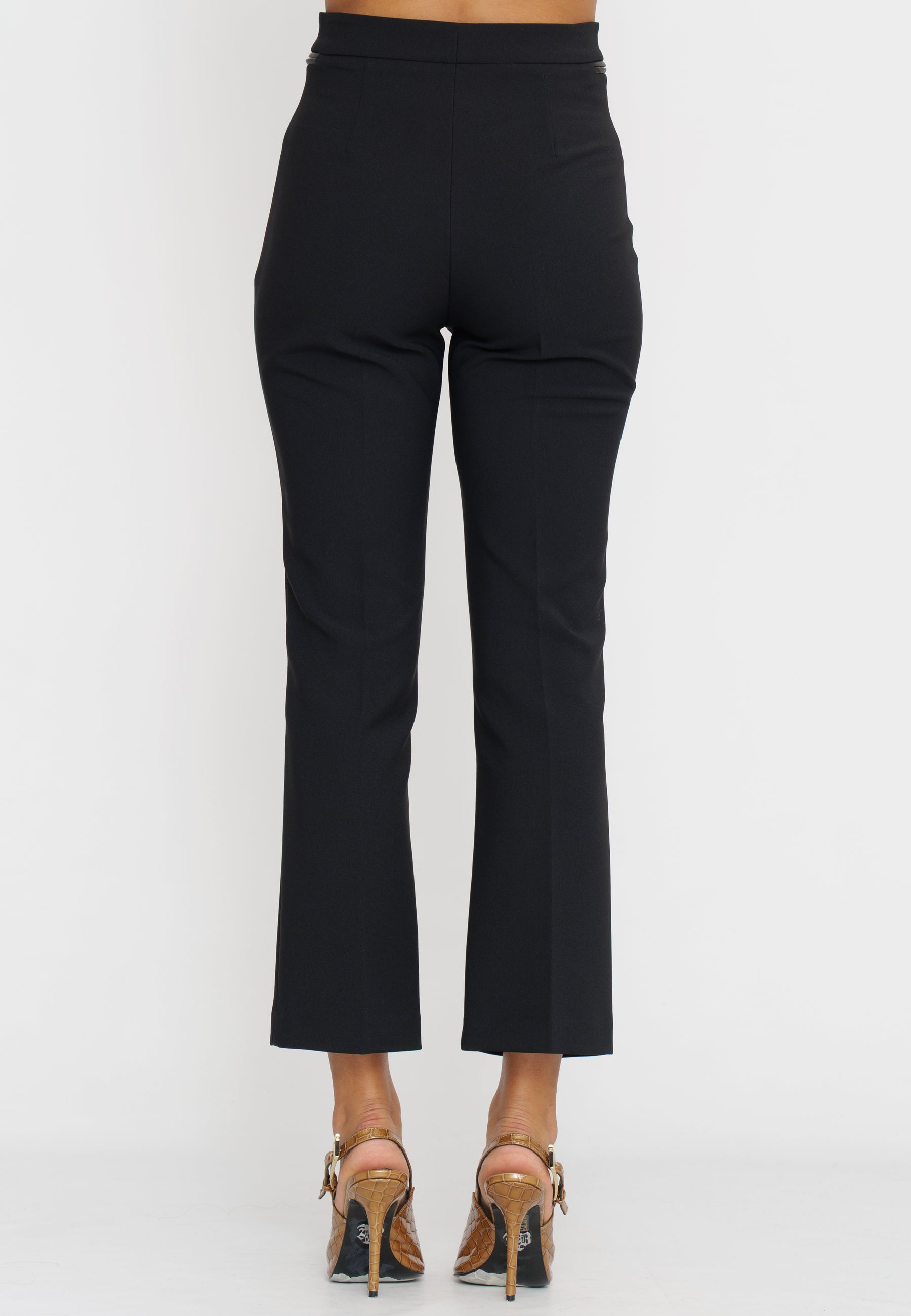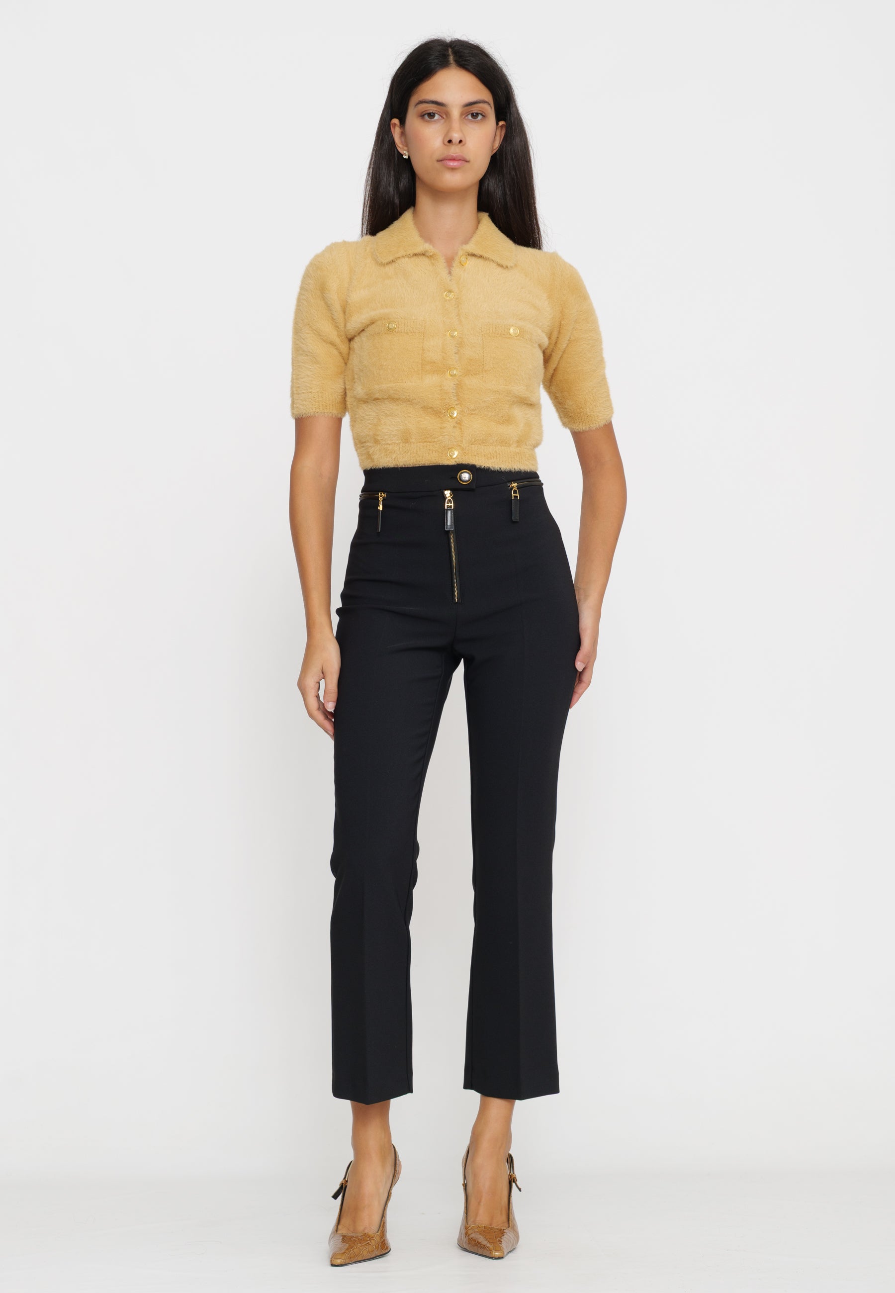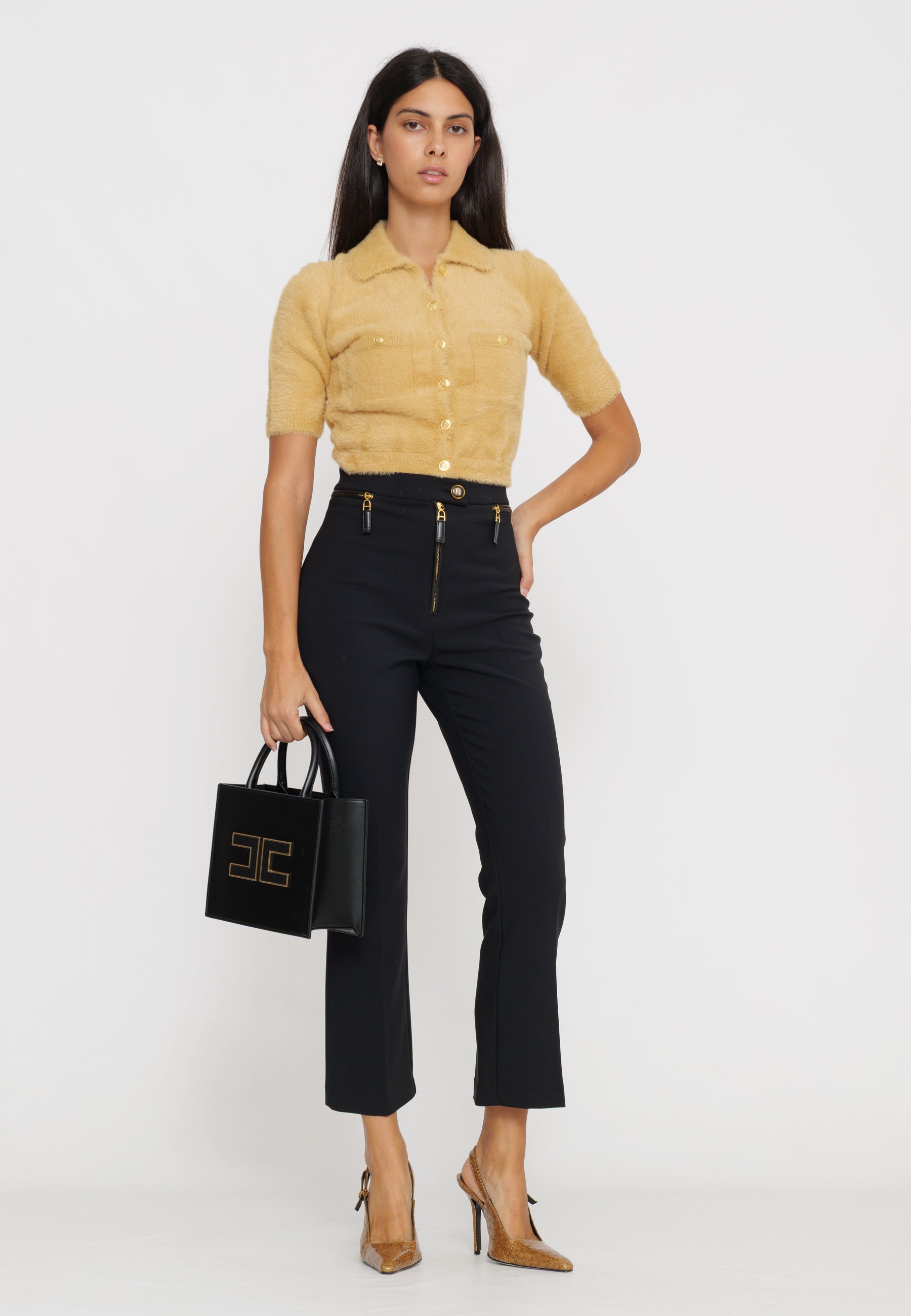 Pantaloni in doppio crêpe dalla silhouette aderente che definisce la figura con eleganza. Caratterizzati da zip frontali incorniciate da filetti tono su tono, questi pantaloni catturano l'attenzione con dettagli raffinati. Il bottone smaltato con logo Elisabetta Franchi aggiunge un elemento di lusso discreto. Parte della collezione Essential, rappresentano la scelta ideale per chi ricerca versatilità e qualità costruttiva nel proprio guardaroba contemporaneo.