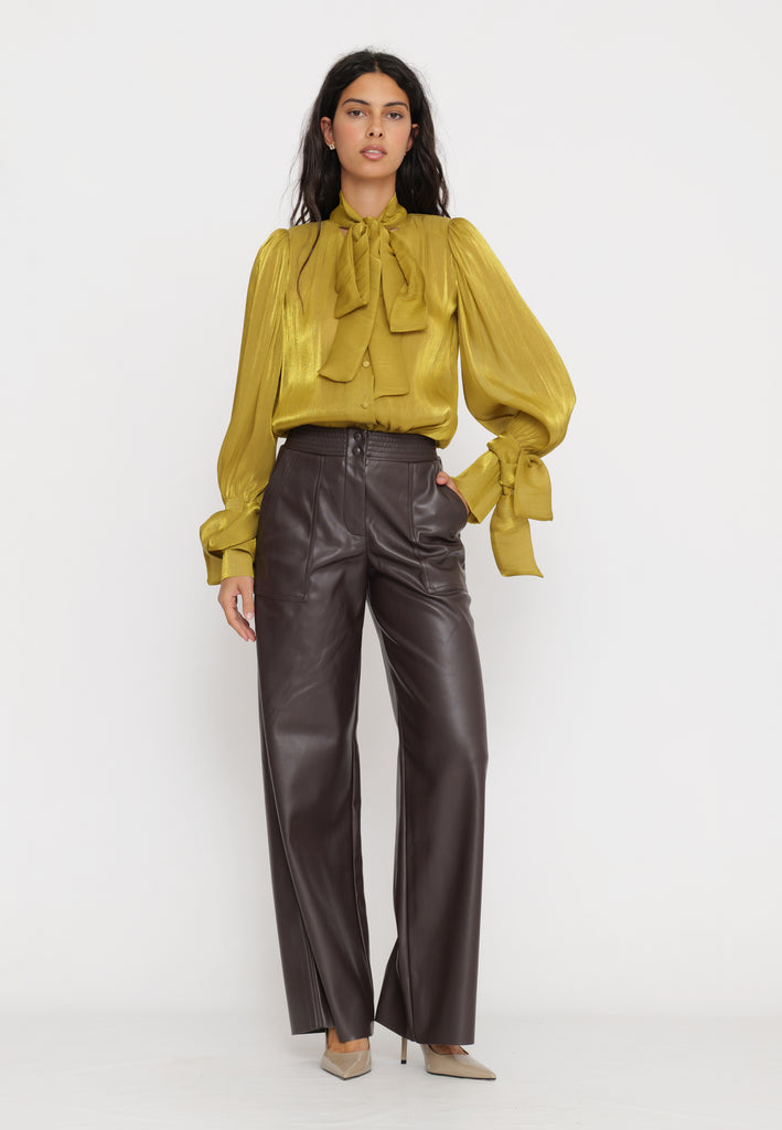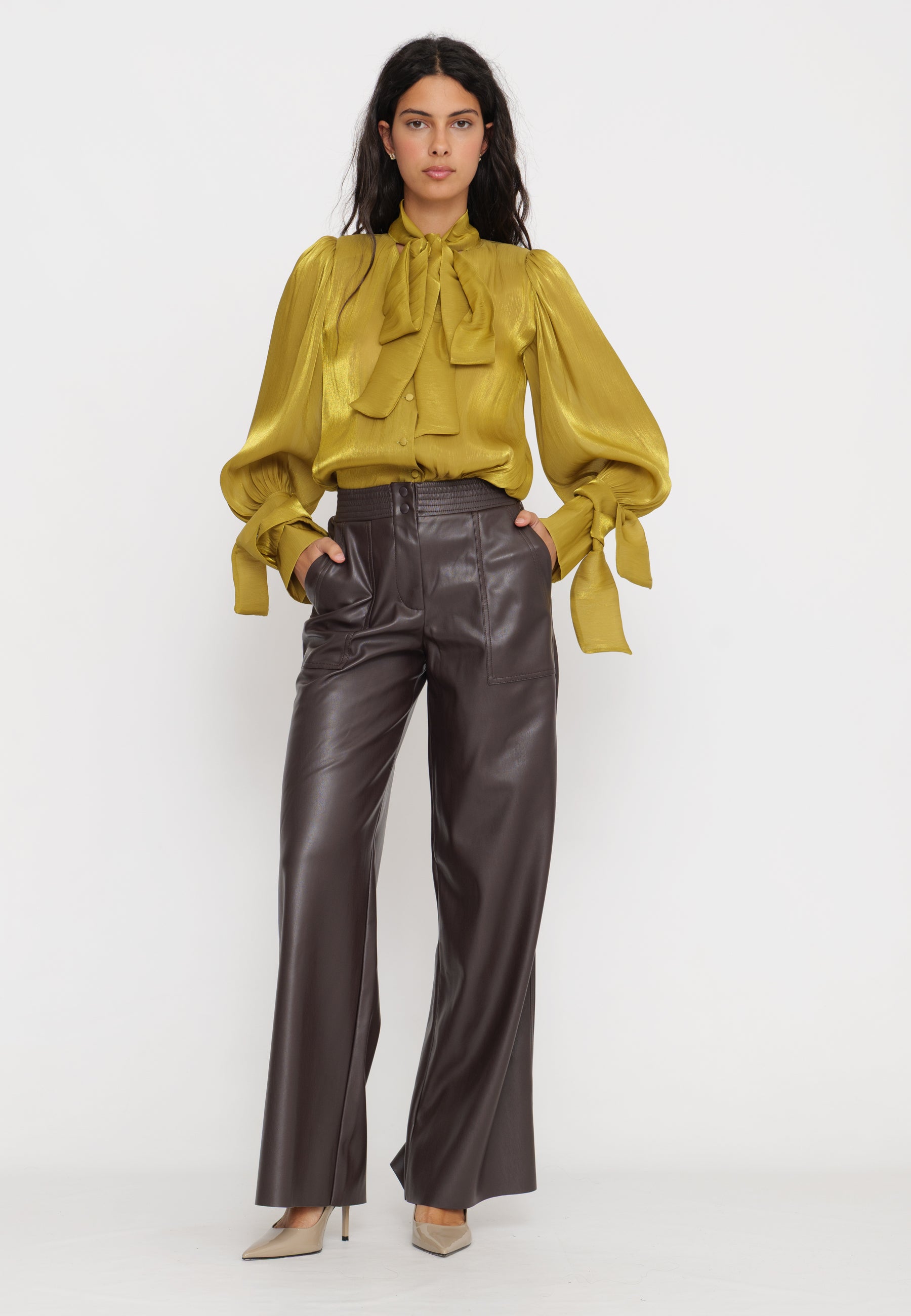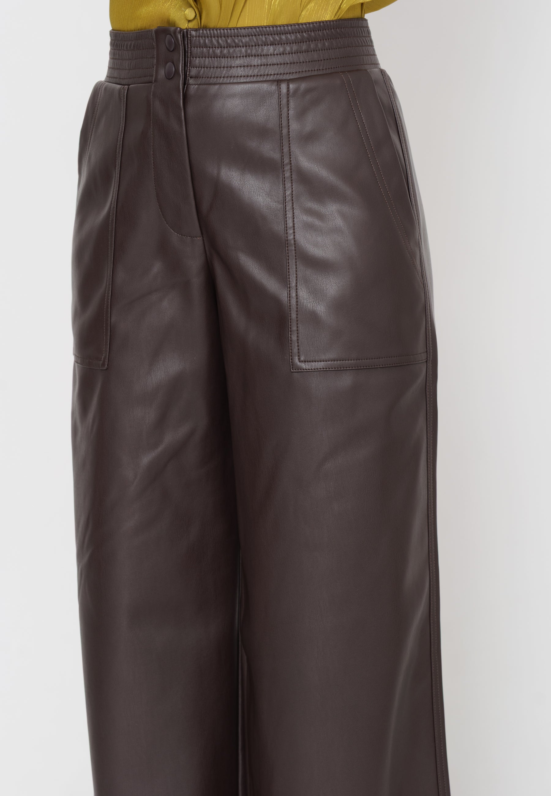 Pantaloni che uniscono stile e sostenibilità grazie all'elegante ecopelle e al taglio a gamba larga. Questo design offre comfort e una silhouette moderna, ideale per occasioni formali o look casual raffinati. Perfetti per chi cerca un capo versatile che abbina tendenza e responsabilità ambientale.
