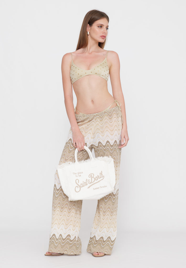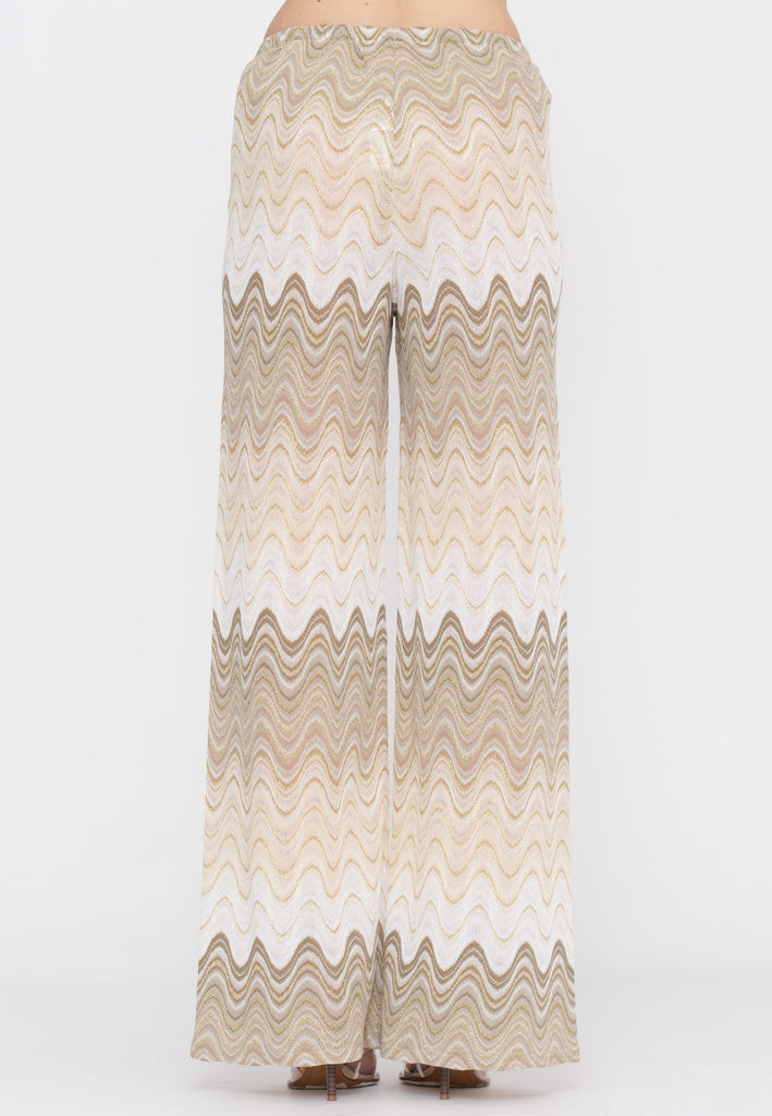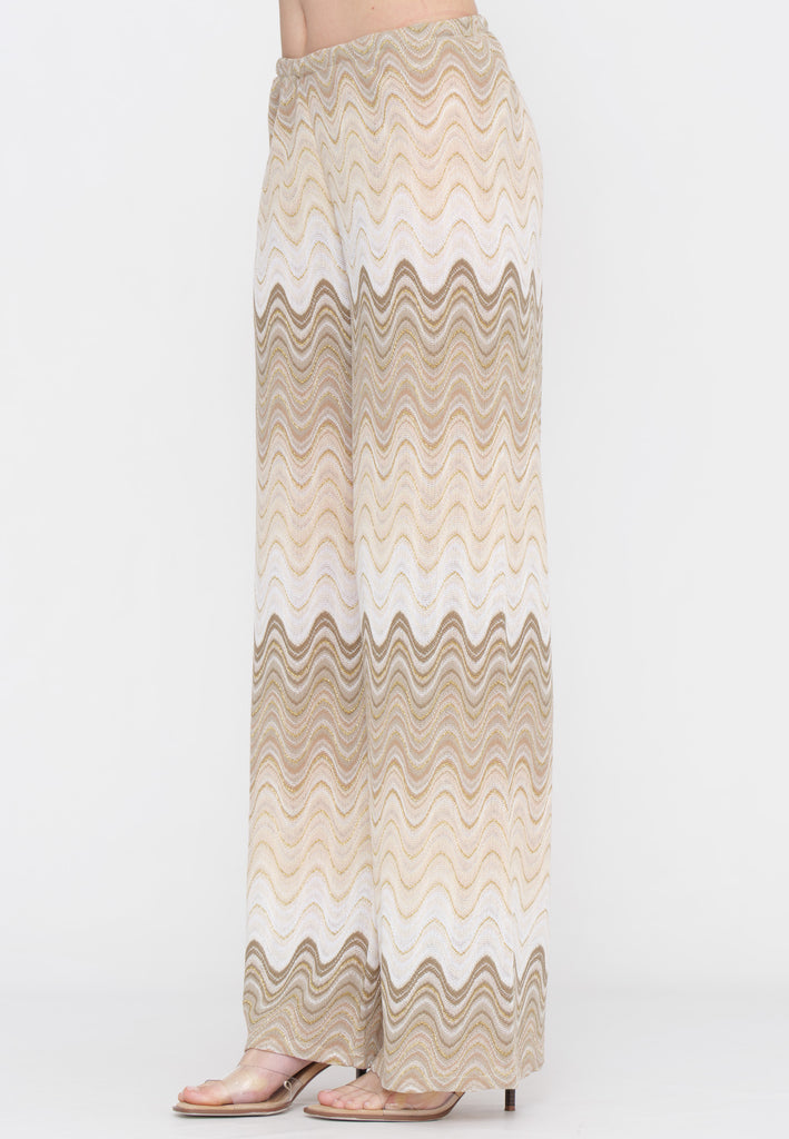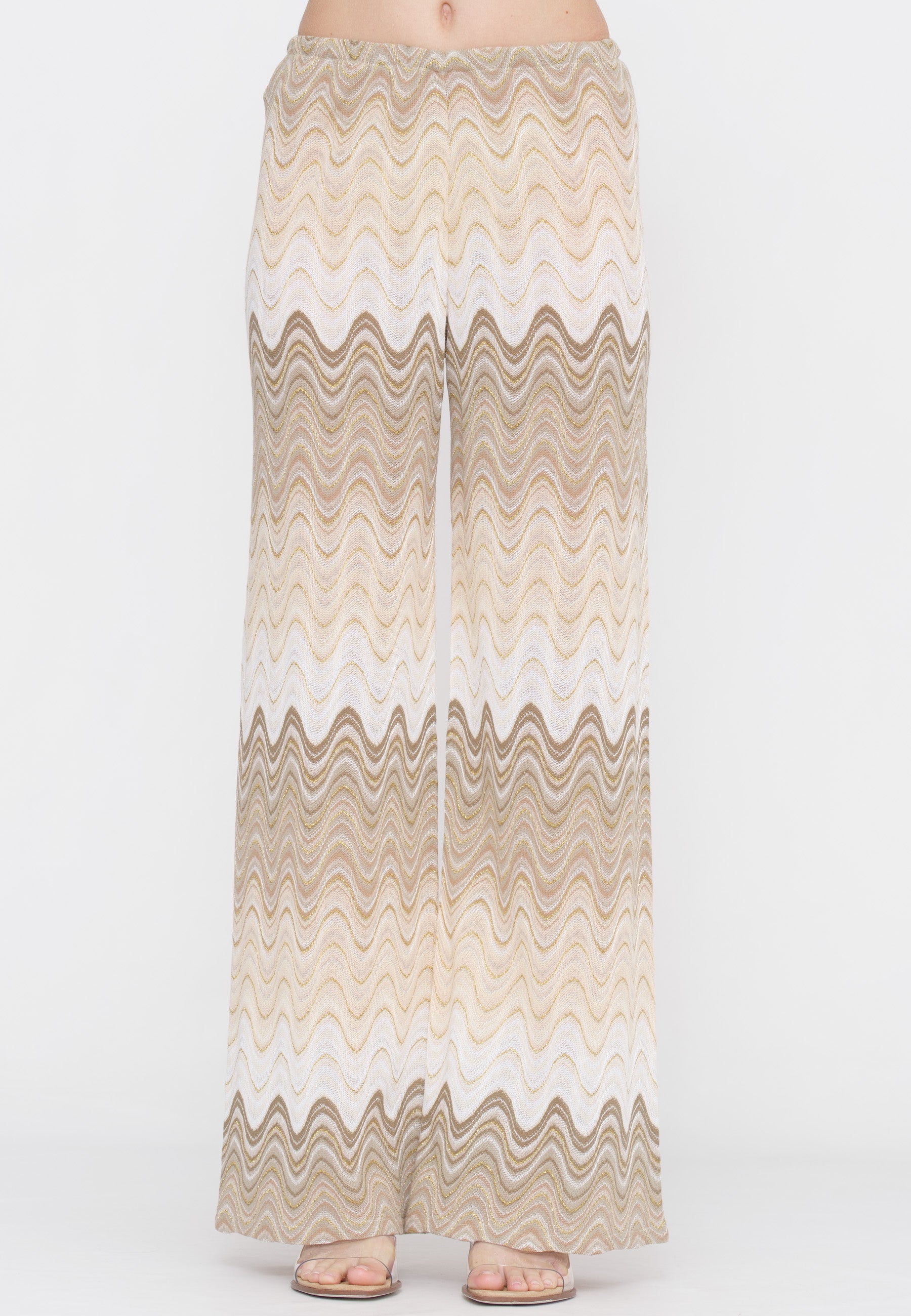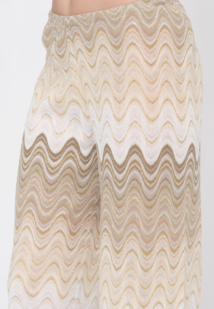 Pantalone in maglia raschel fantasia chevron effetto ondulato, vita con elastico e gamba larga.